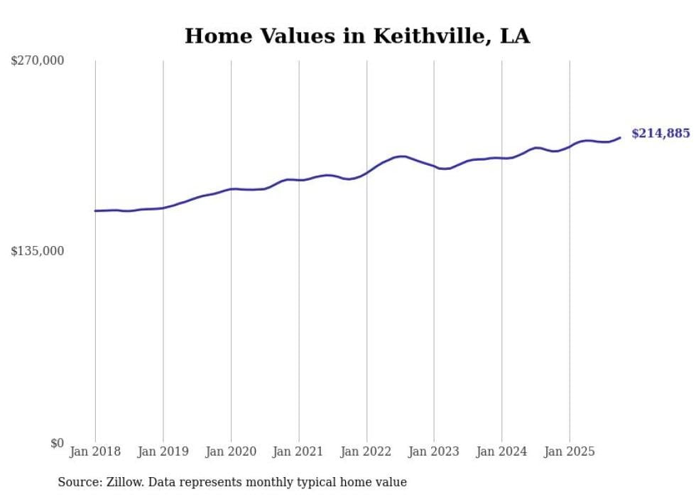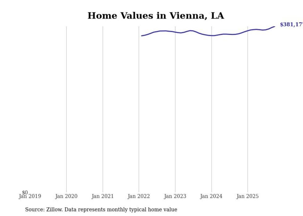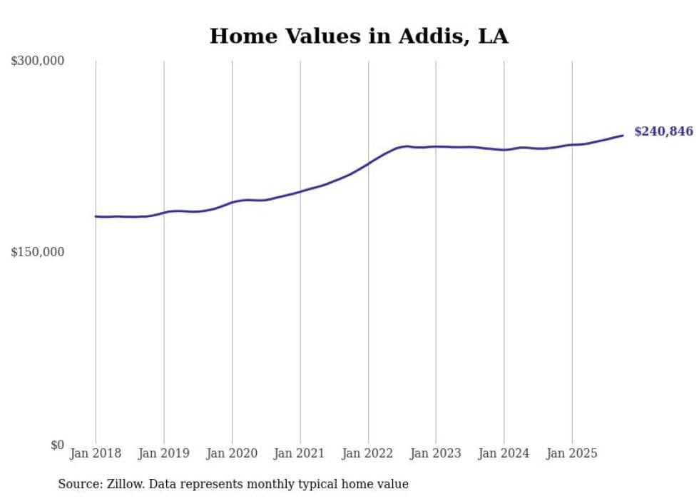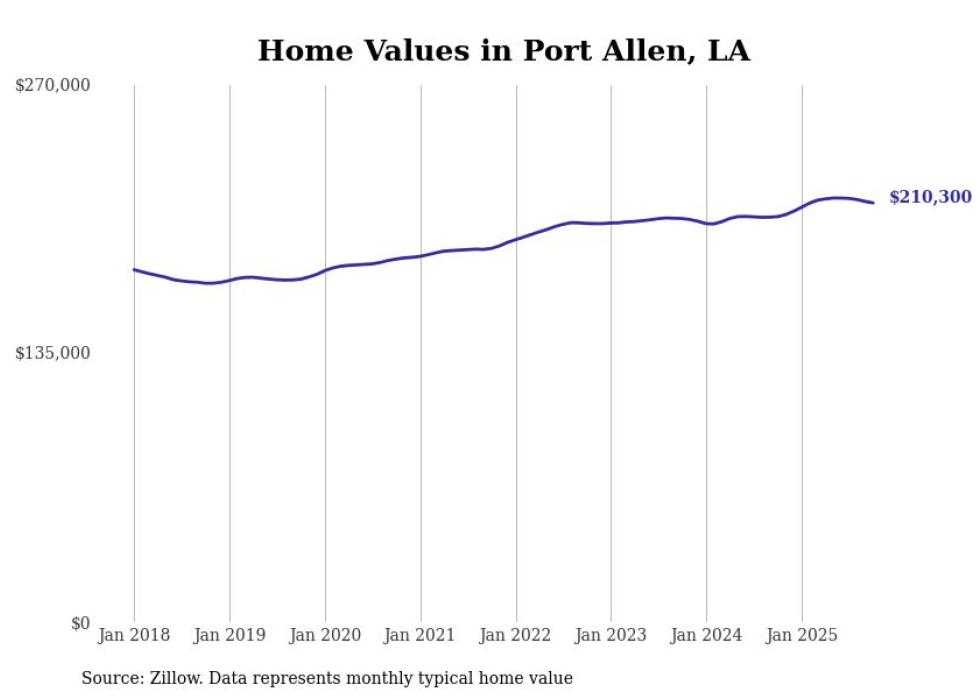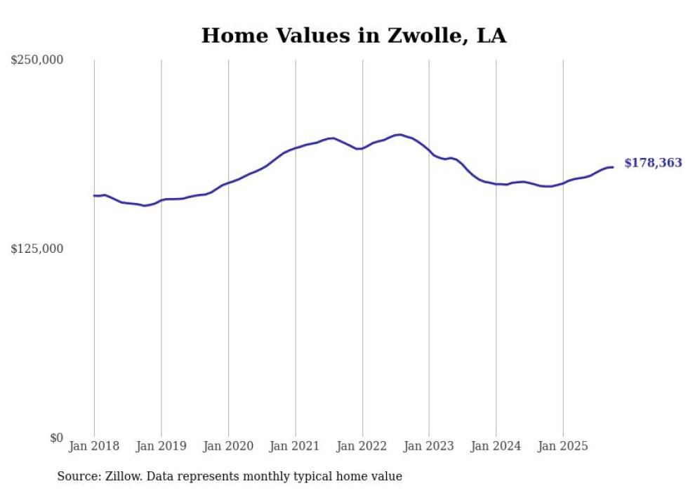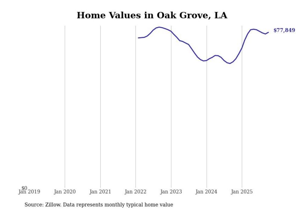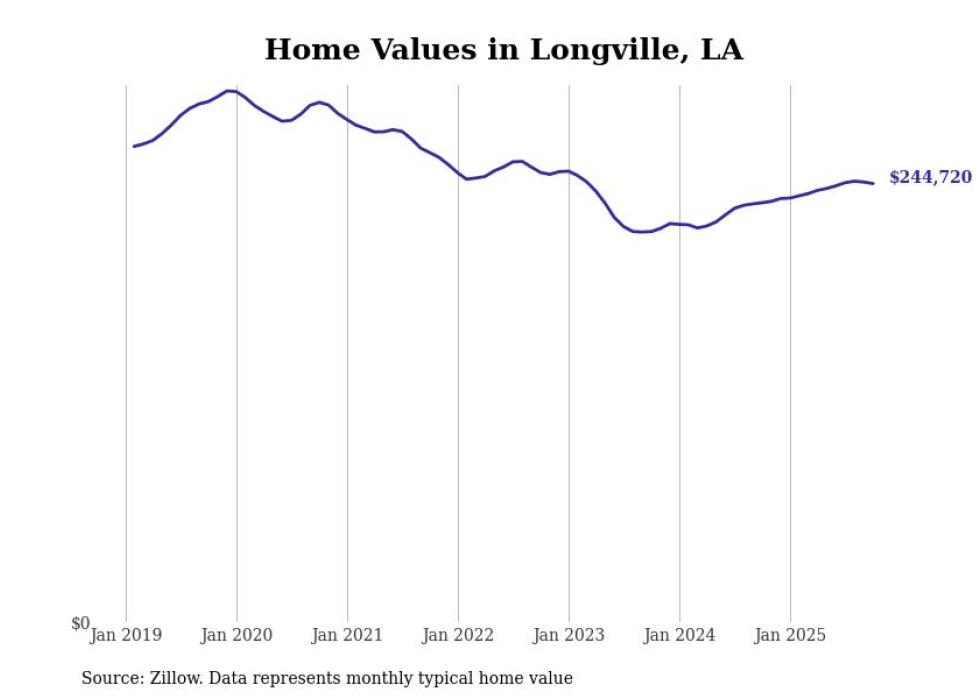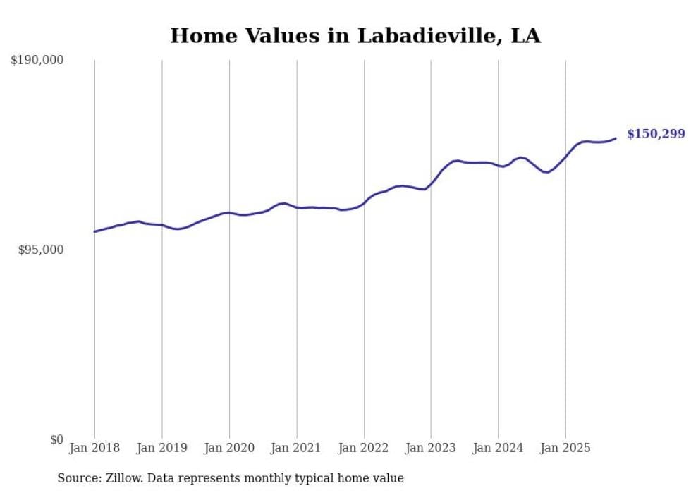 Stacker compiled a list of cities with the fastest-growing home prices in Louisiana using data from Zillow. Cities are ranked by the dollar change in the Zillow Home Values Index for all homes from the 12 months ending October 2025. The charts in this story were created automatically using Matplotlib. Data was available for 50 cities and towns in Louisiana.