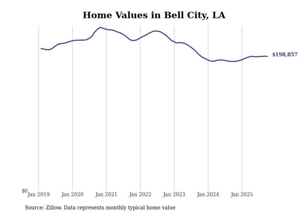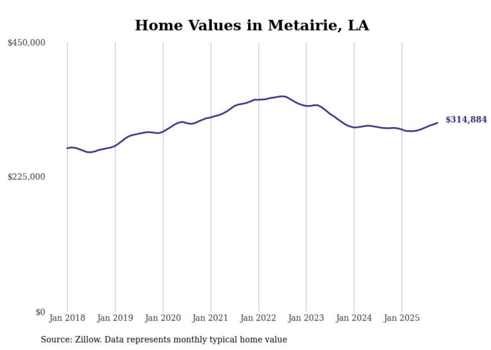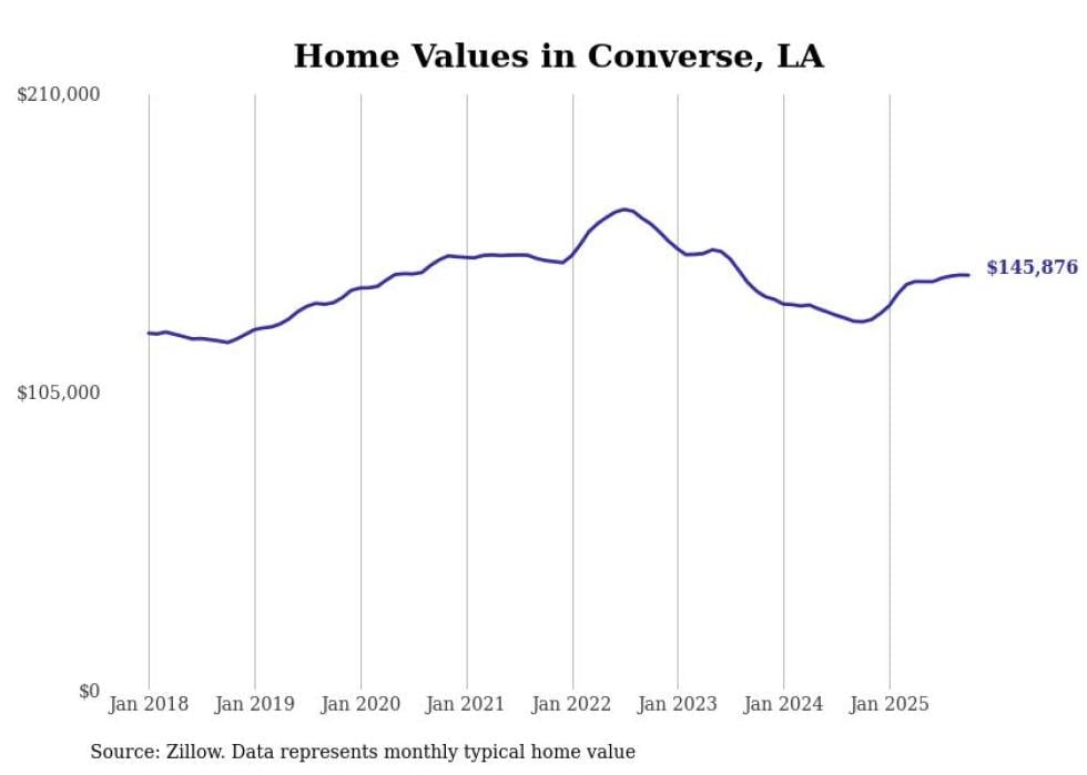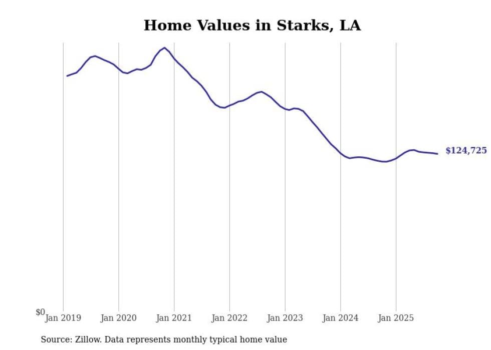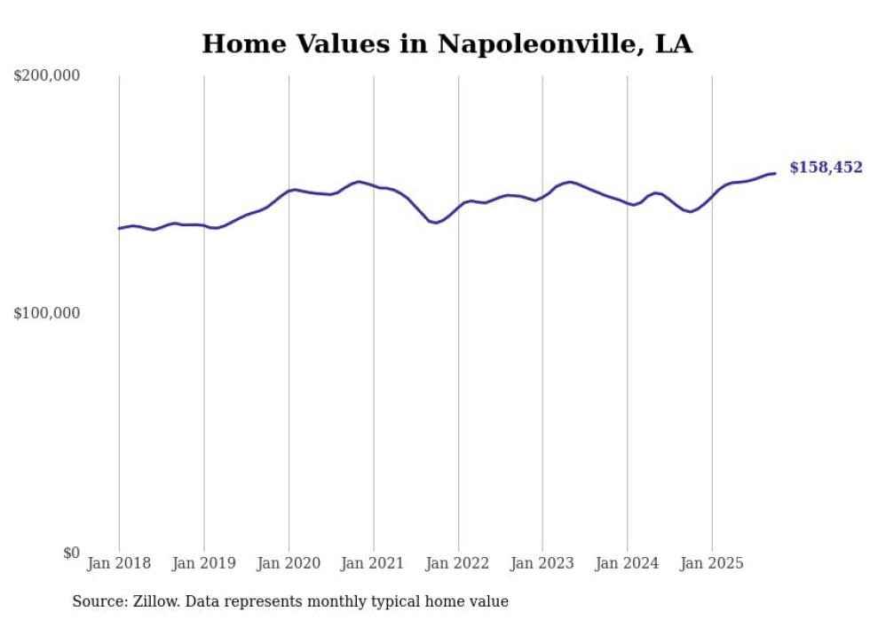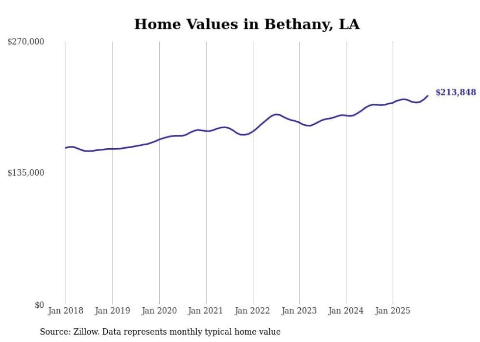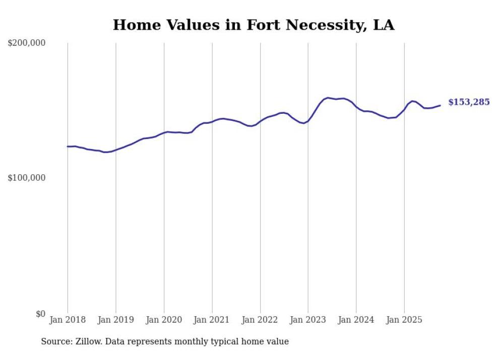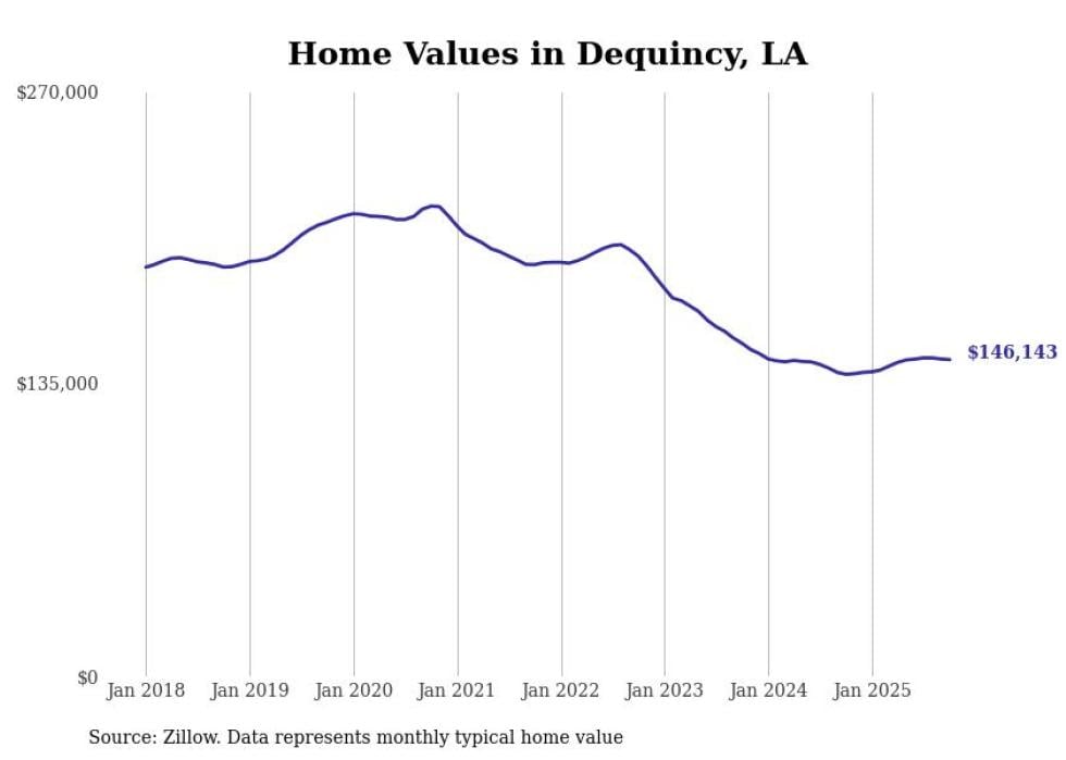 Stacker compiled a list of cities with the fastest-growing home prices in Louisiana using data from Zillow. Cities are ranked by the dollar change in the Zillow Home Values Index for all homes from the 12 months ending October 2025. The charts in this story were created automatically using Matplotlib. Data was available for 50 cities and towns in Louisiana.
