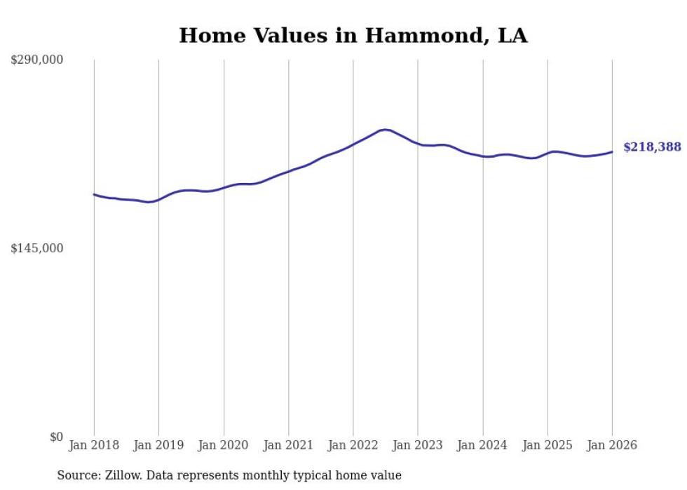 Stacker compiled a list of cities with the most expensive homes in the Hammond, LA metro area using data from Zillow. Charts show the monthly typical home value since January 2018.