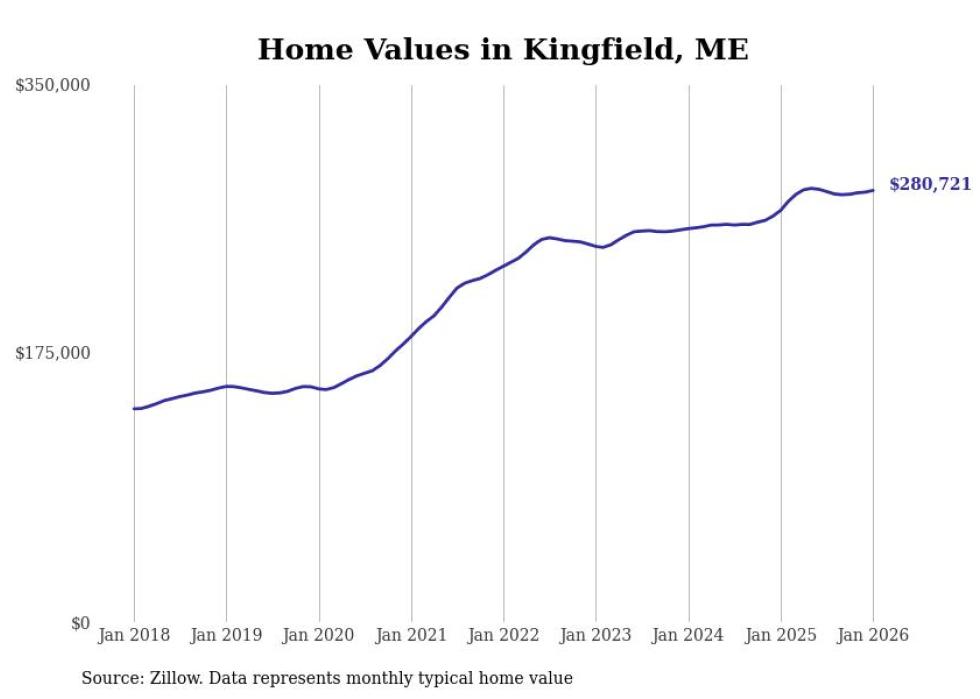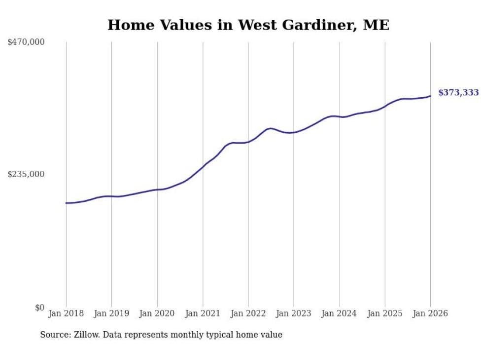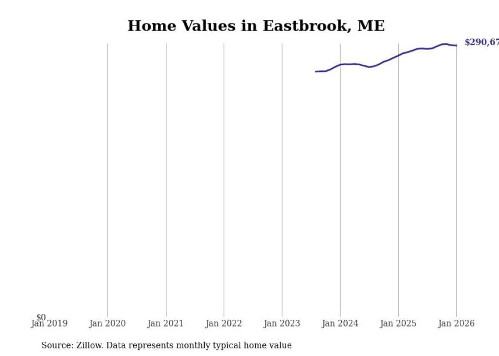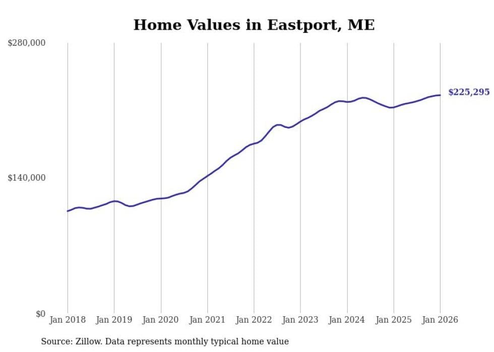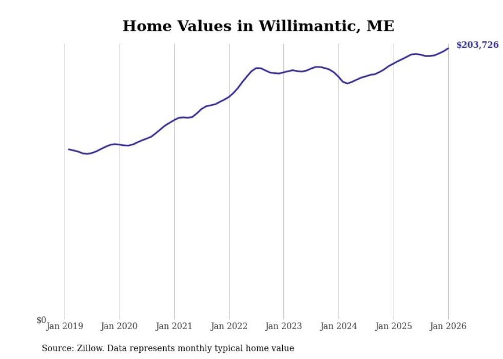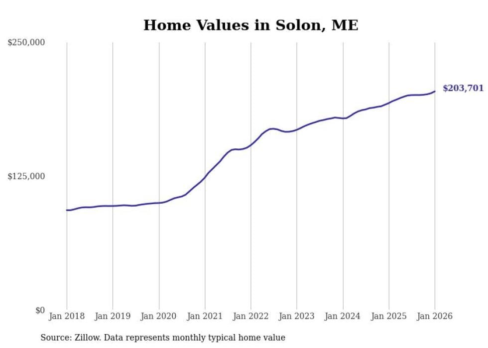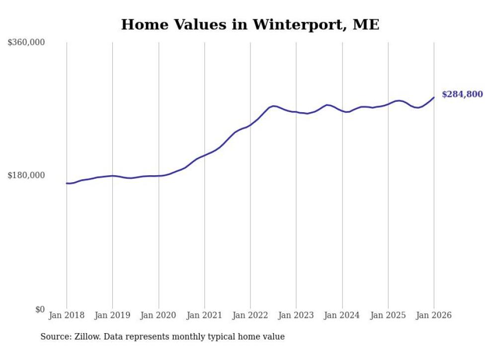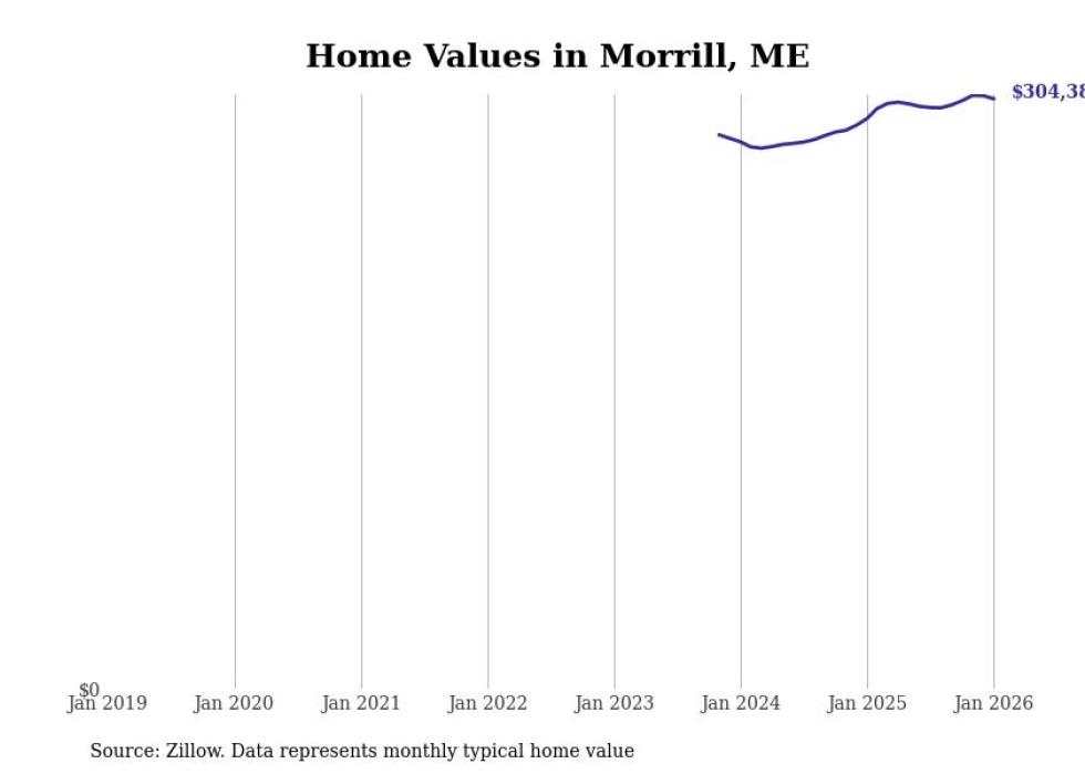 Stacker compiled a list of cities with the fastest-growing home prices in Maine using data from Zillow. Cities are ranked by the dollar change in the Zillow Home Values Index for all homes from the 12 months ending January 2026. The charts in this story were created automatically using Matplotlib. Data was available for 50 cities and towns in Maine.