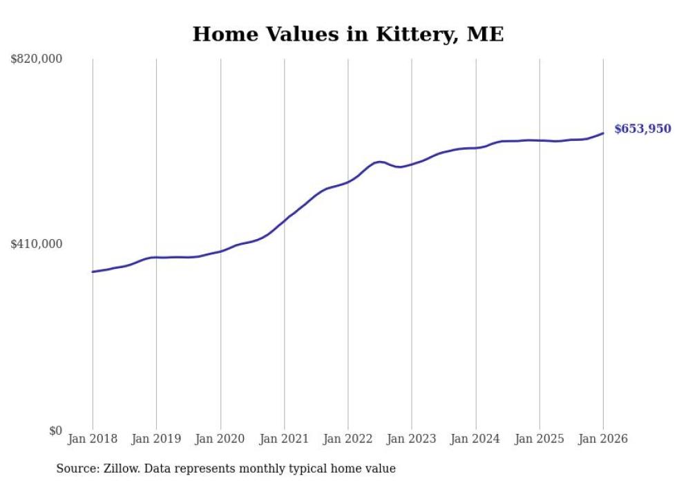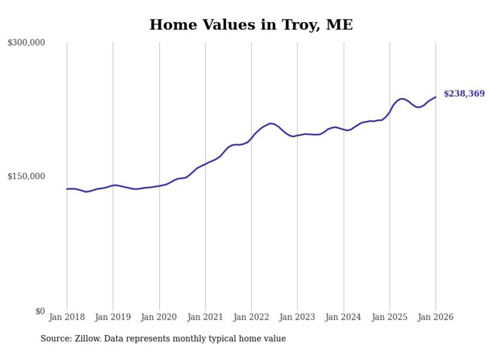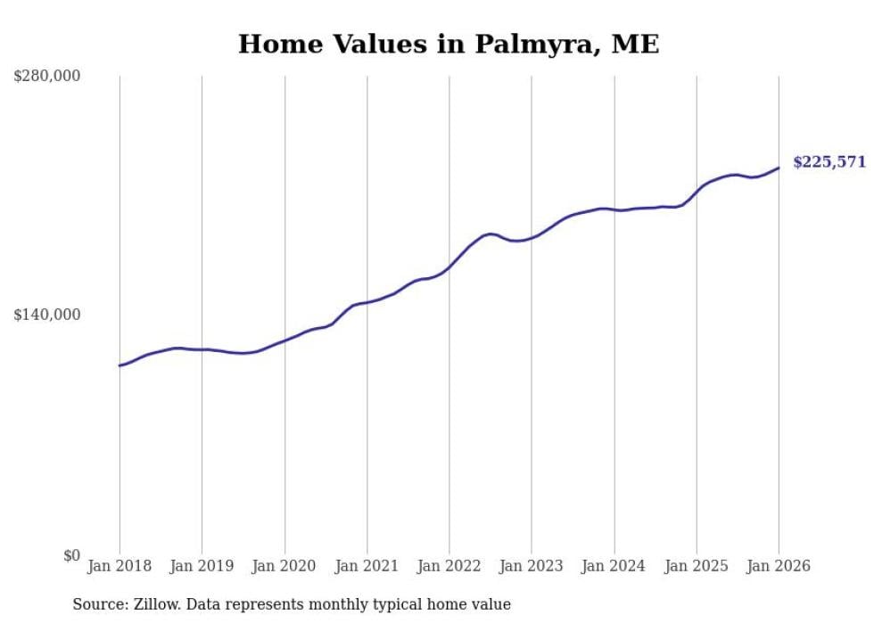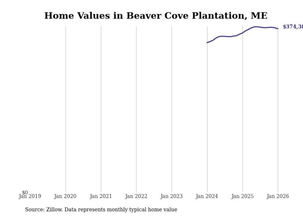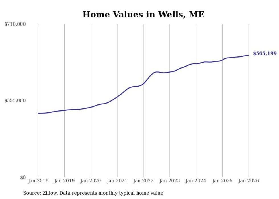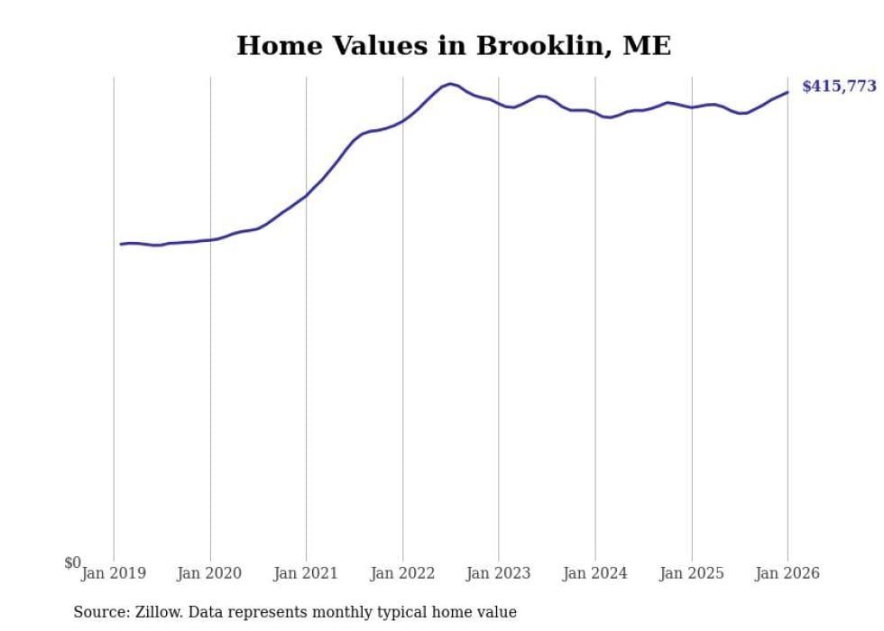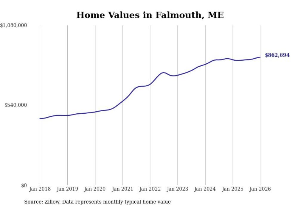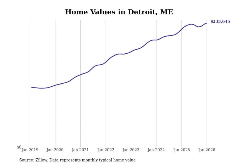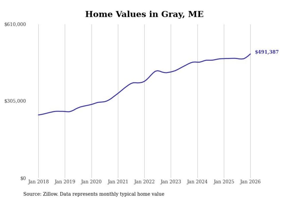 Stacker compiled a list of cities with the fastest-growing home prices in Maine using data from Zillow. Cities are ranked by the dollar change in the Zillow Home Values Index for all homes from the 12 months ending January 2026. The charts in this story were created automatically using Matplotlib. Data was available for 50 cities and towns in Maine.
