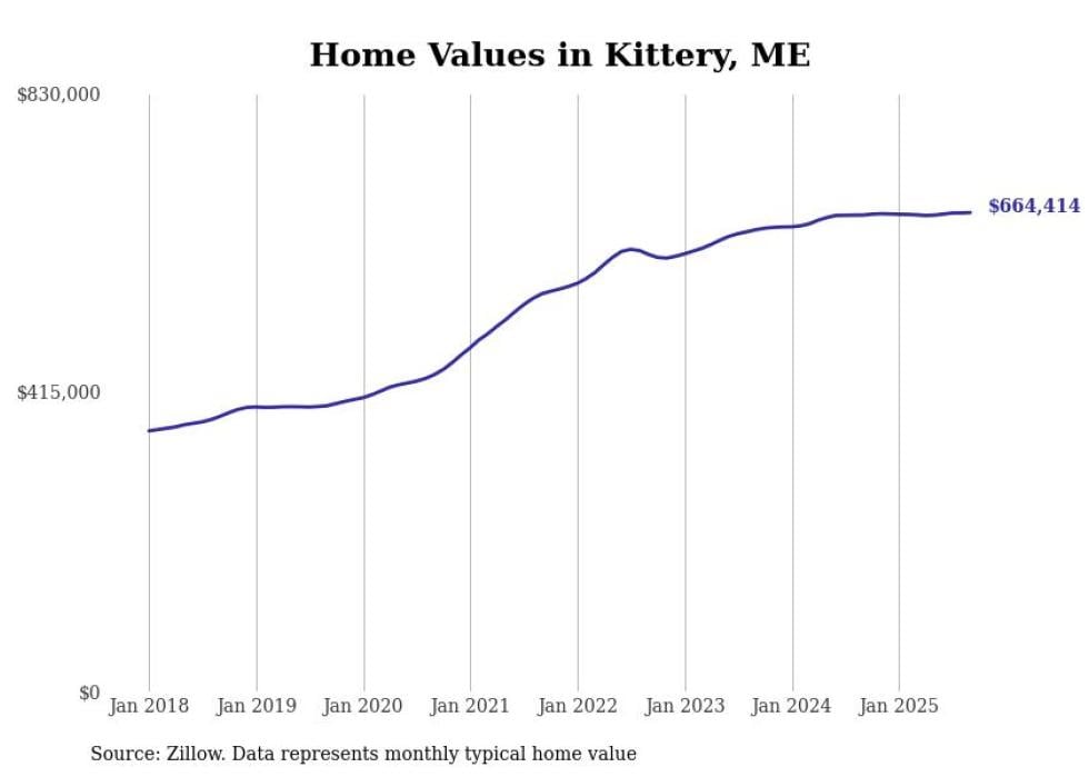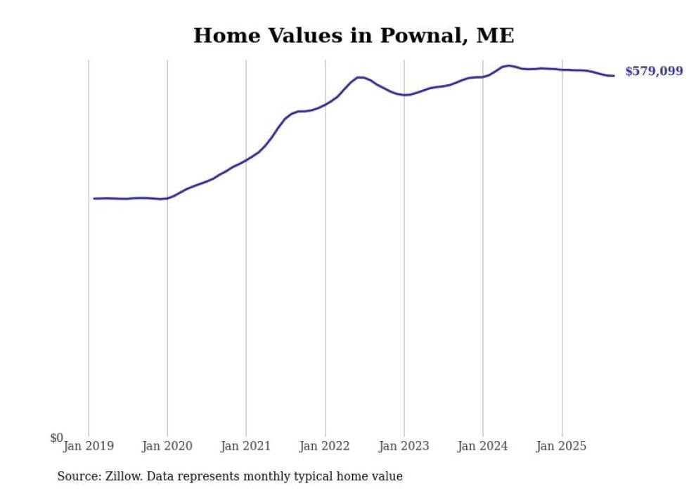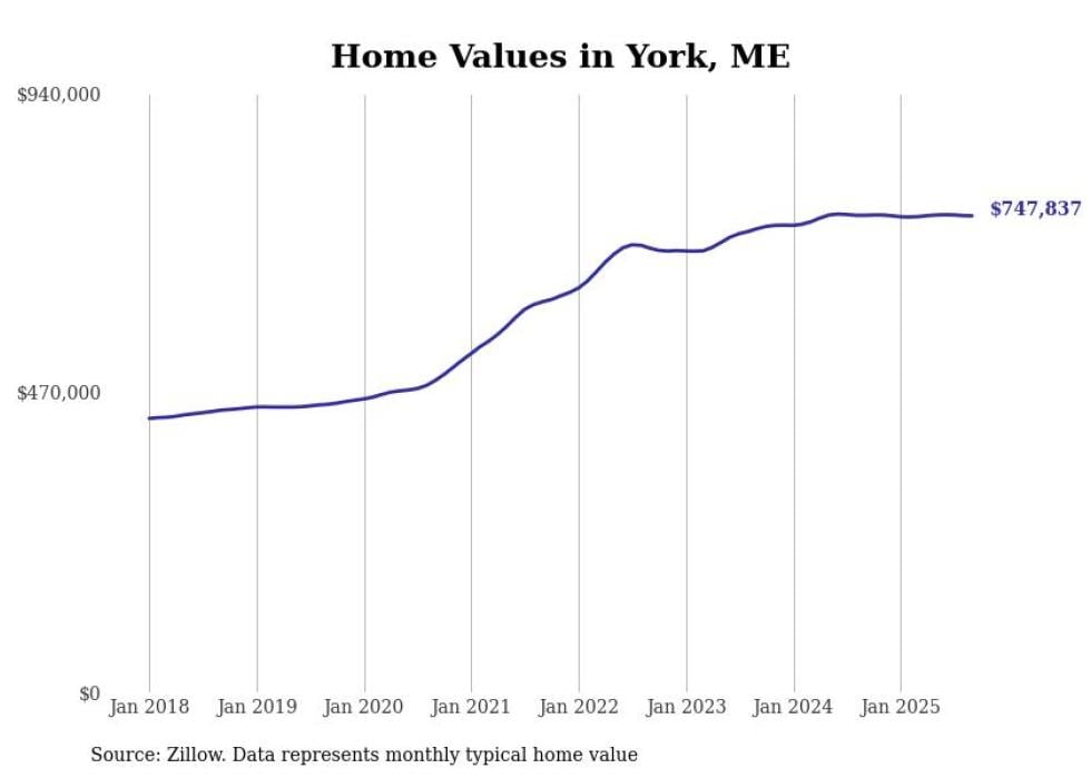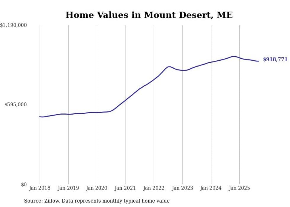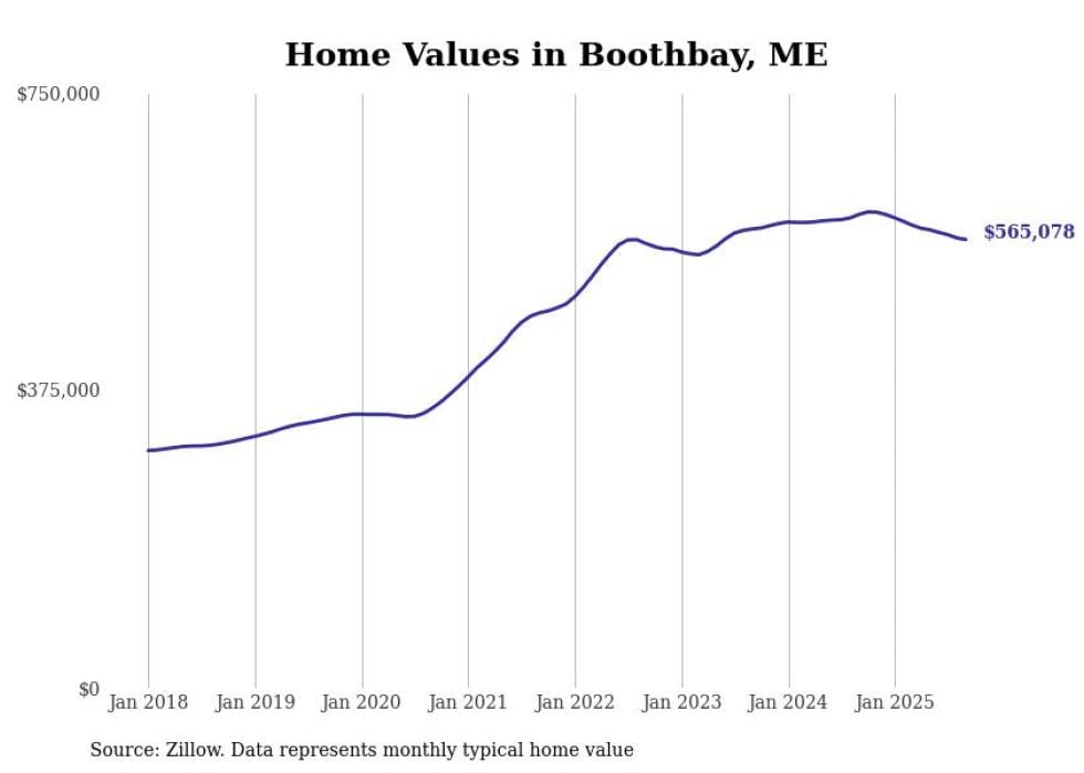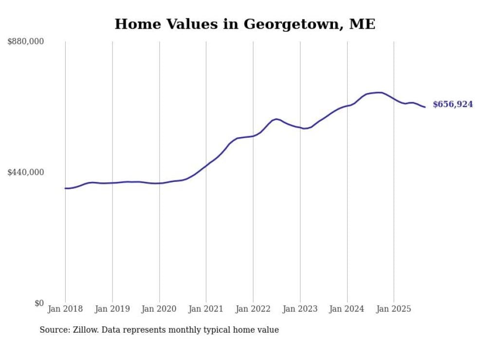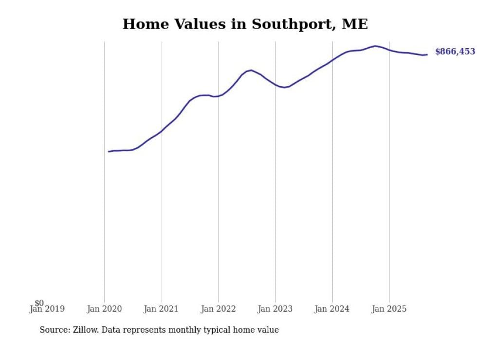 Stacker compiled a list of cities with the most expensive homes in Maine using data from Zillow. Cities are ranked by the Zillow Home Values Index for all homes as of September 2025. The charts in this story were created automatically using Matplotlib.