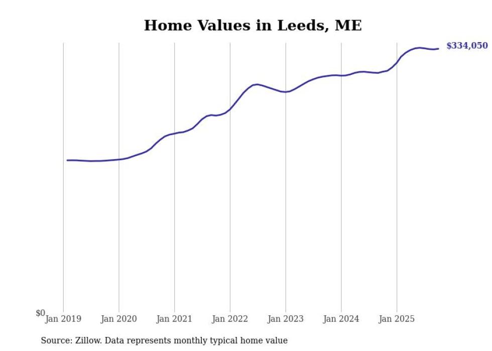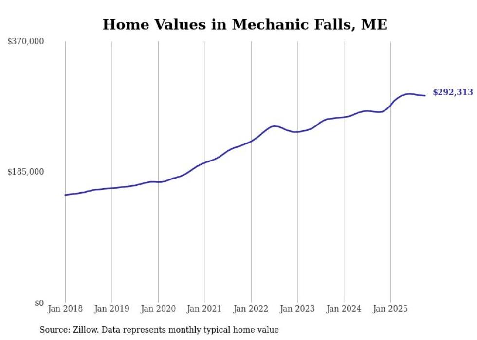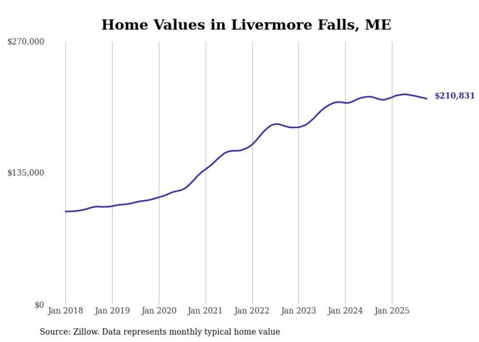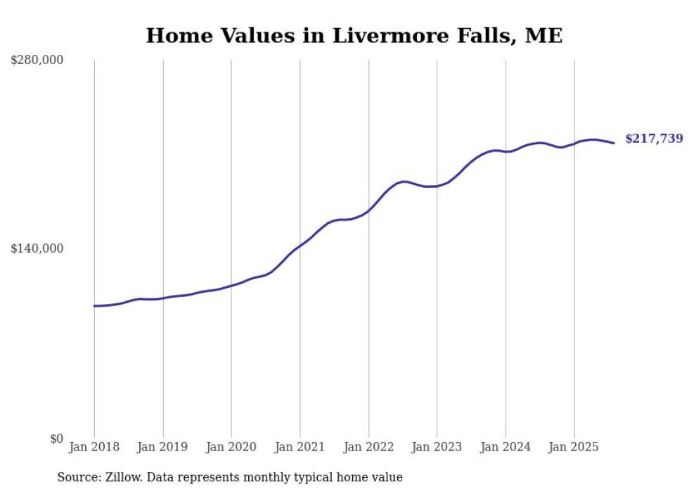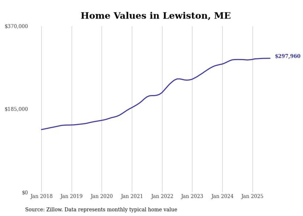 Stacker compiled a list of cities with the most expensive homes in the Lewiston, Maine metro area using data from Zillow. Charts show the monthly typical home value since January 2018. All 15 cities and towns with data available were included in the list.