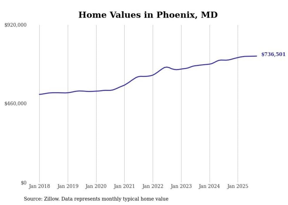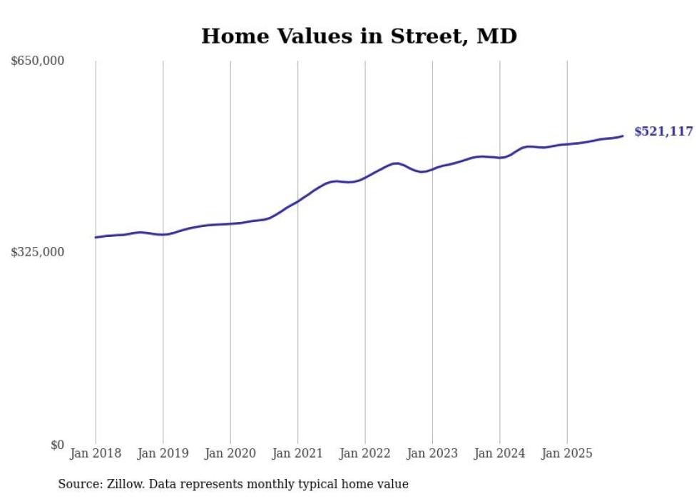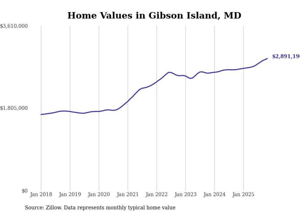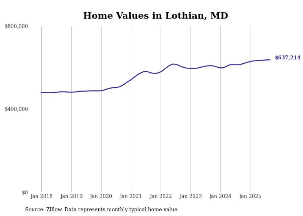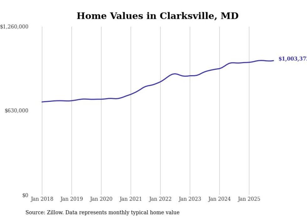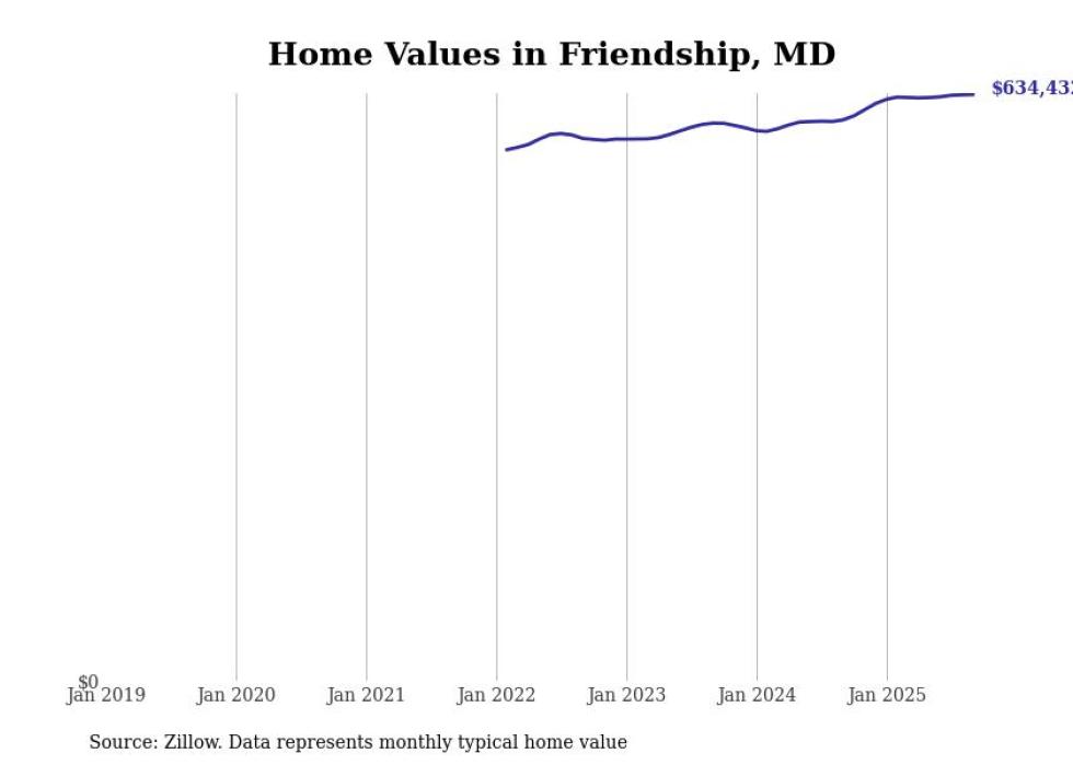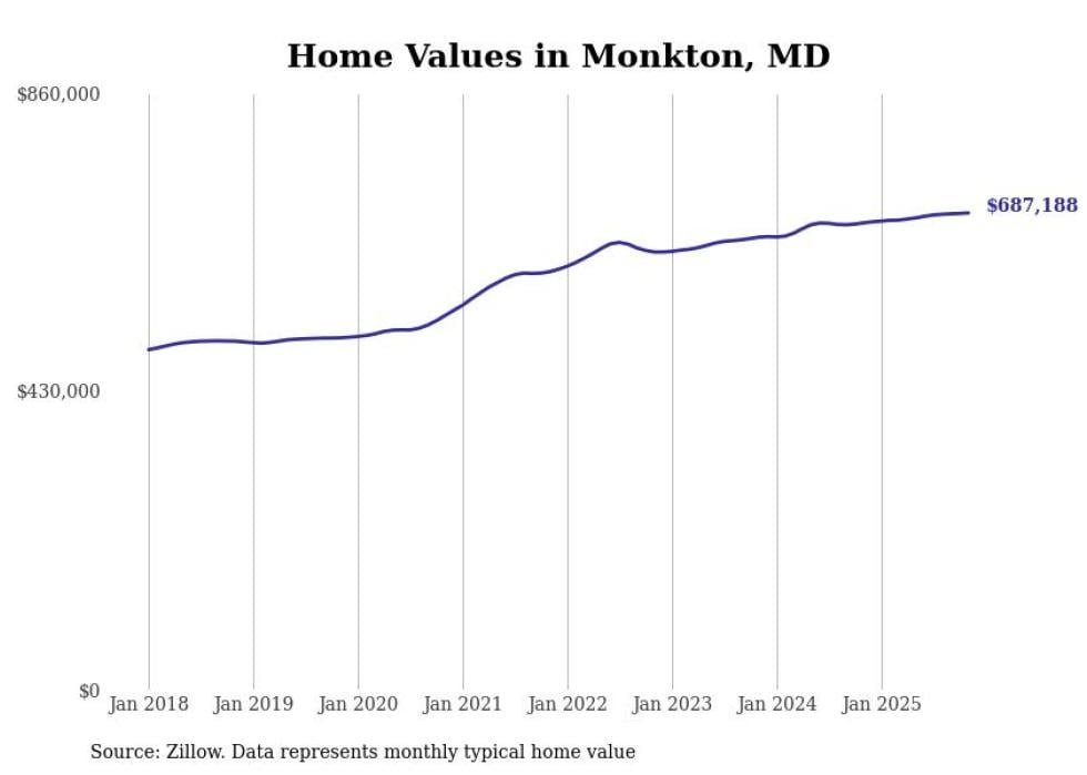 Stacker compiled a list of cities with the most expensive homes in the Baltimore-Columbia-Towson, MD metro area using data from Zillow. Charts show the monthly typical home value since January 2018.