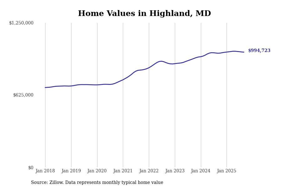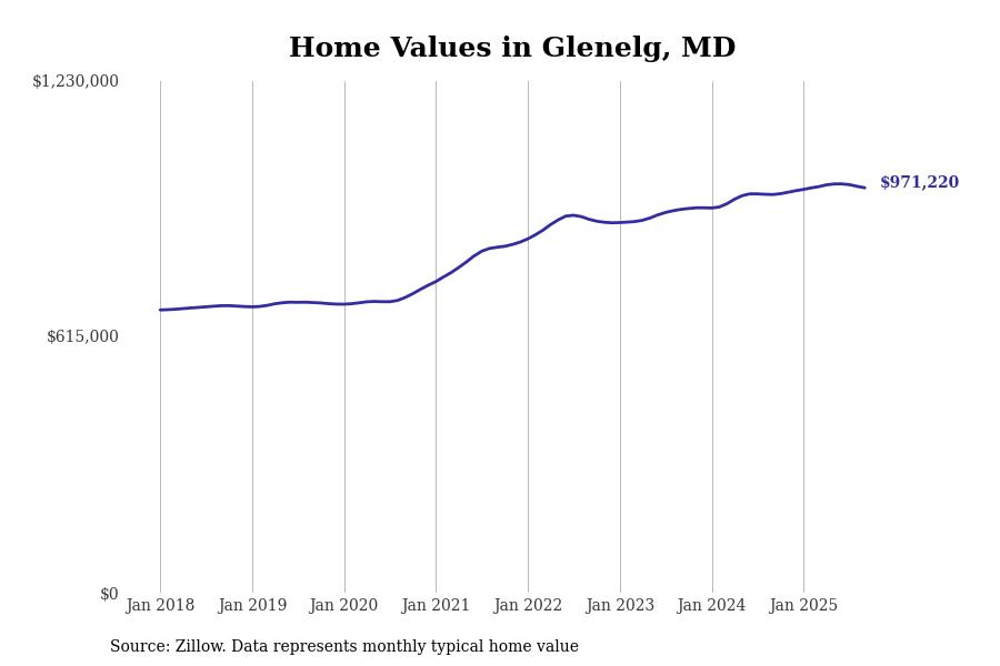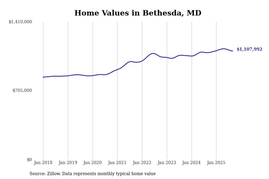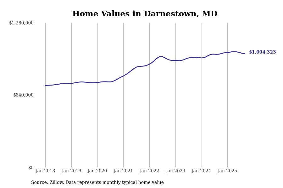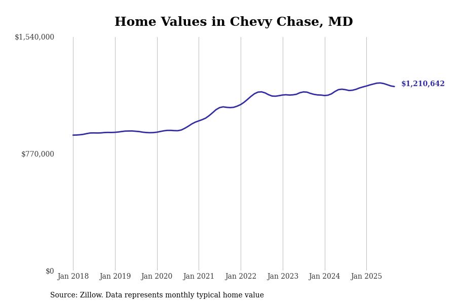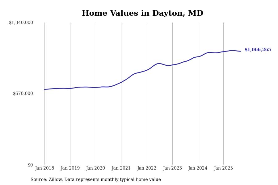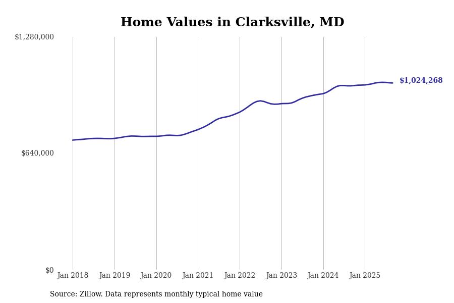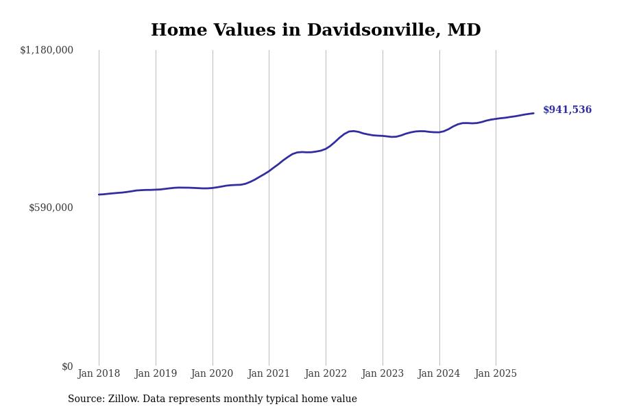 Stacker compiled a list of cities with the most expensive homes in Maryland using data from Zillow. Cities are ranked by the Zillow Home Values Index for all homes as of September 2025. The charts in this story were created automatically using Matplotlib.