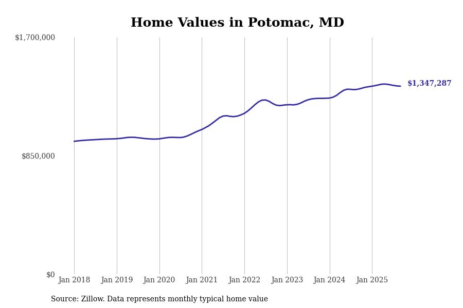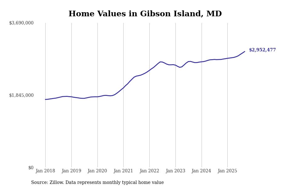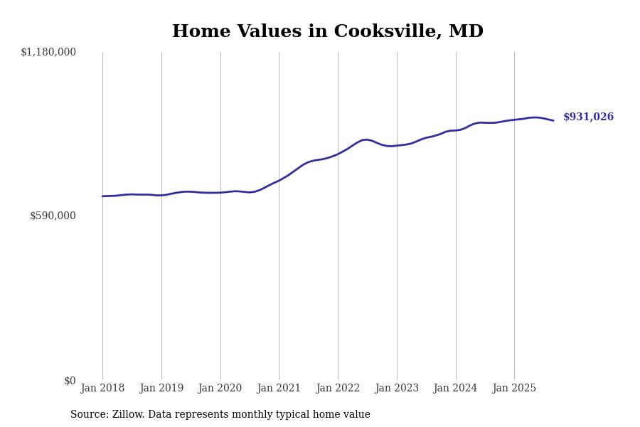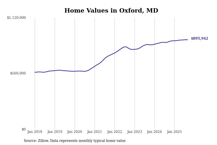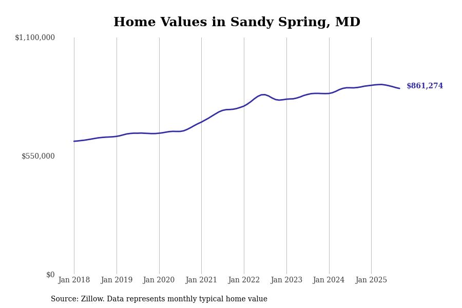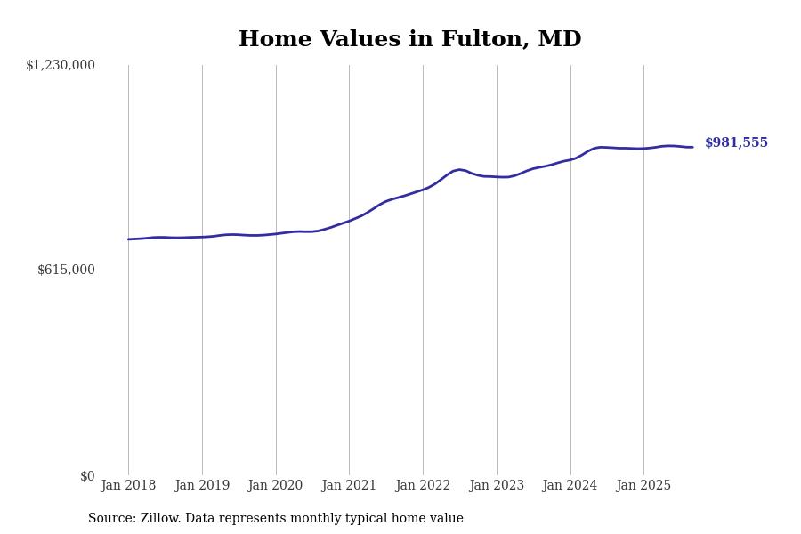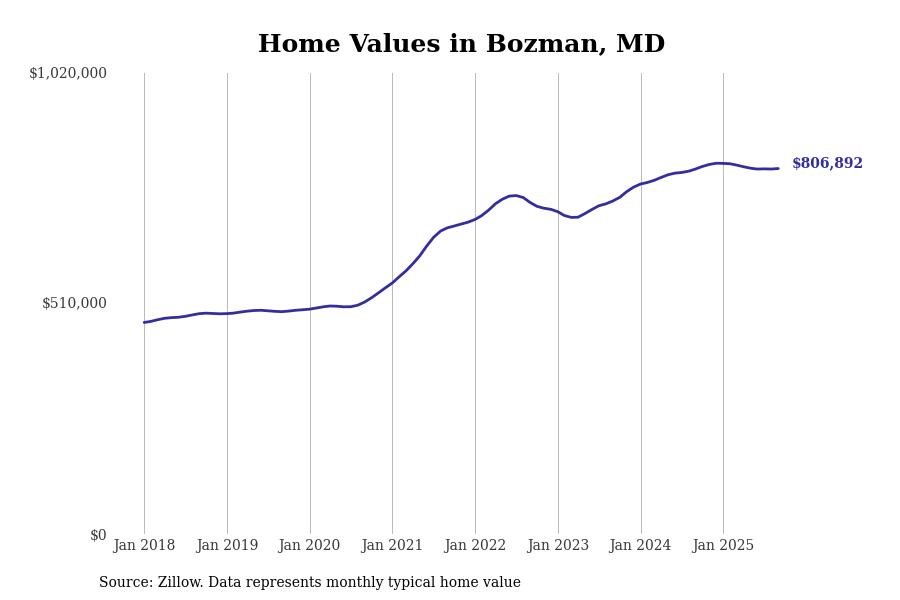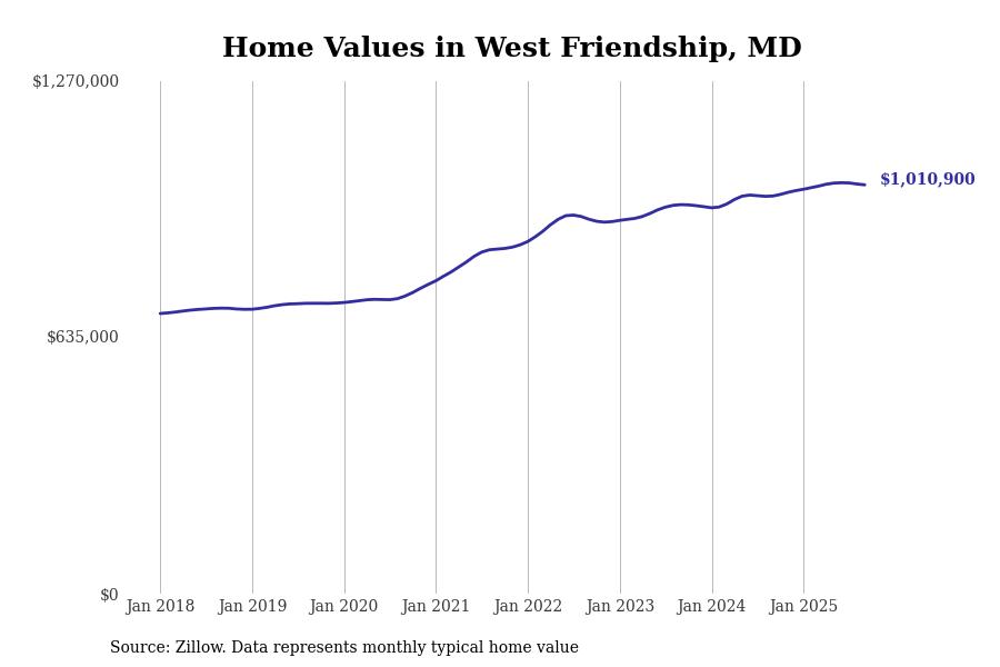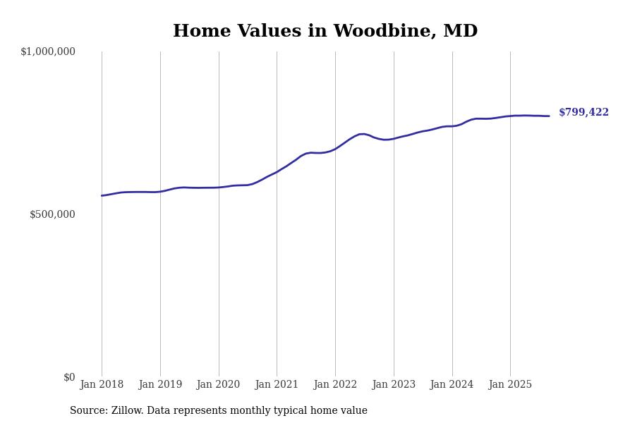 Stacker compiled a list of cities with the most expensive homes in Maryland using data from Zillow. Cities are ranked by the Zillow Home Values Index for all homes as of September 2025. The charts in this story were created automatically using Matplotlib.