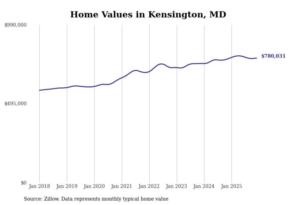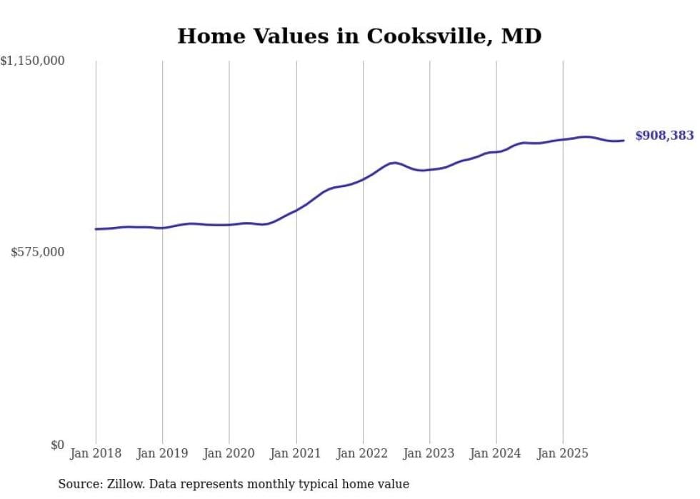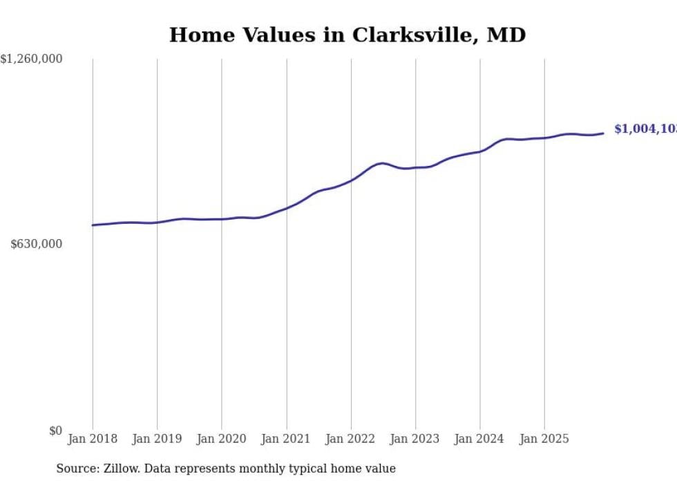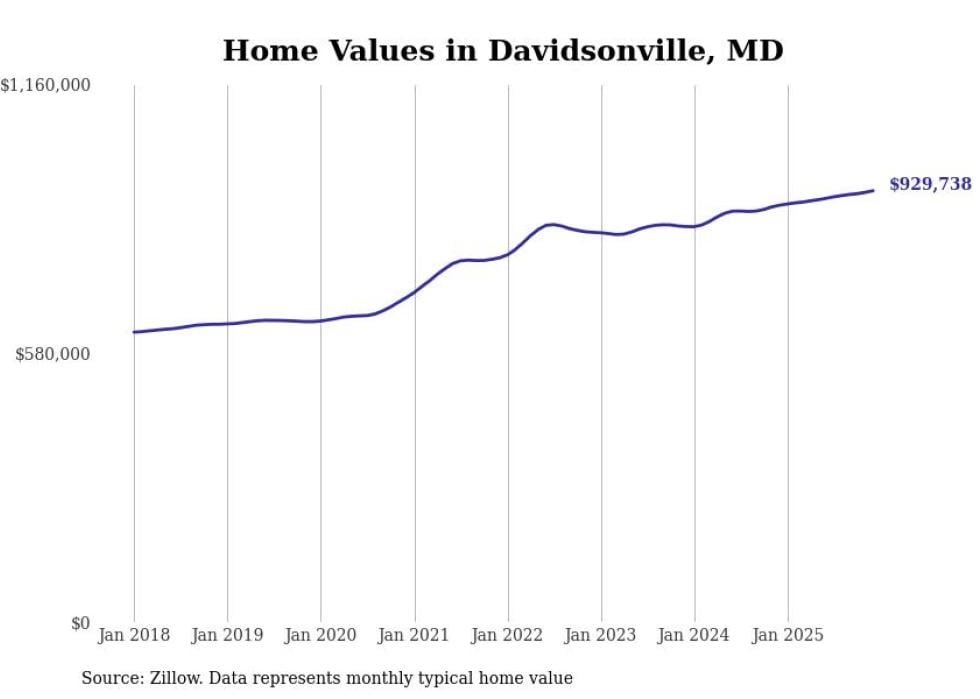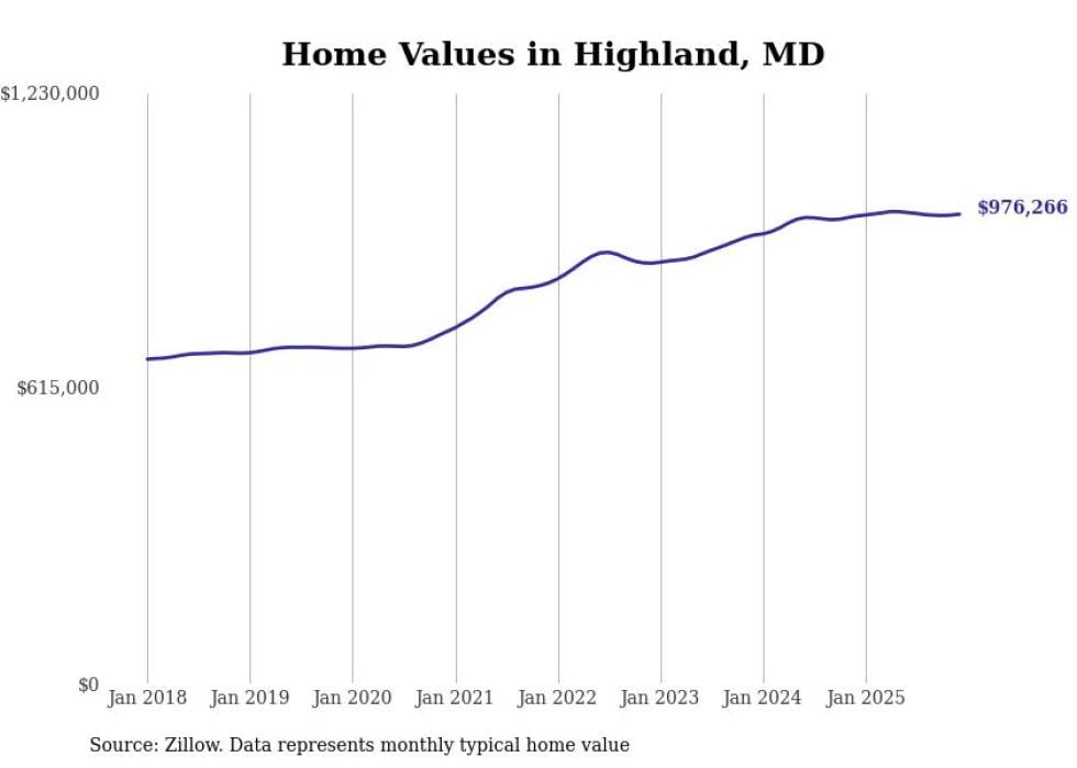 Stacker compiled a list of cities with the most expensive homes in Maryland using data from Zillow. Cities are ranked by the Zillow Home Values Index for all homes as of December 2025. The charts in this story were created automatically using Matplotlib.