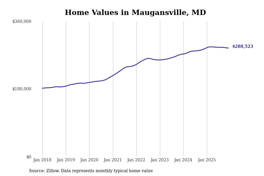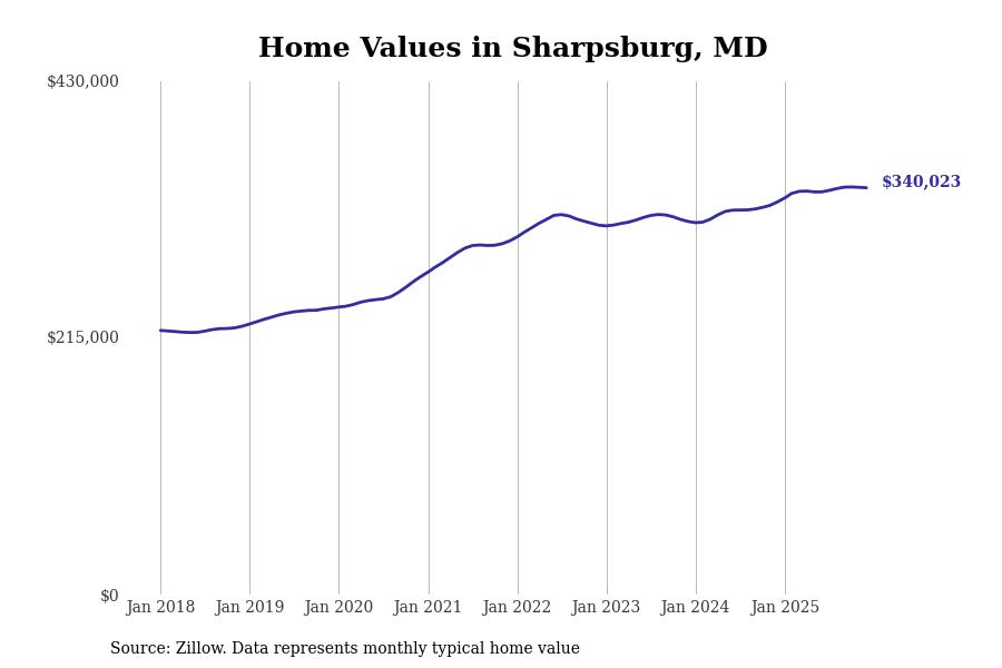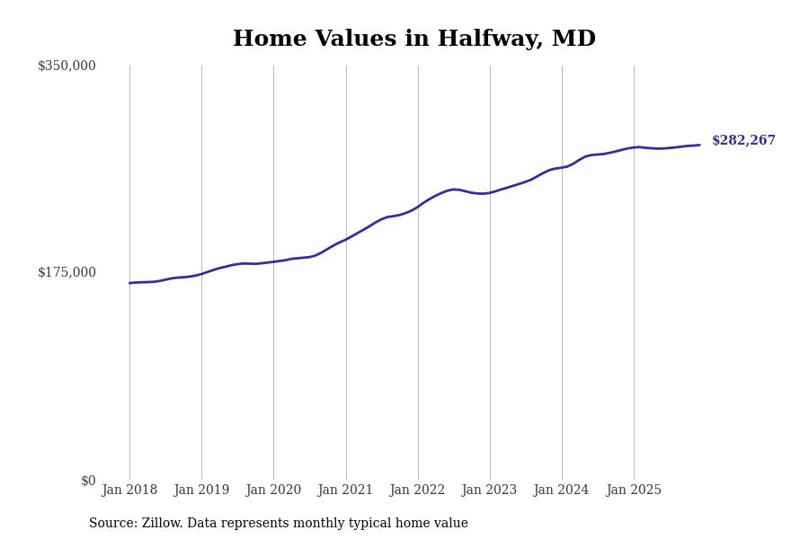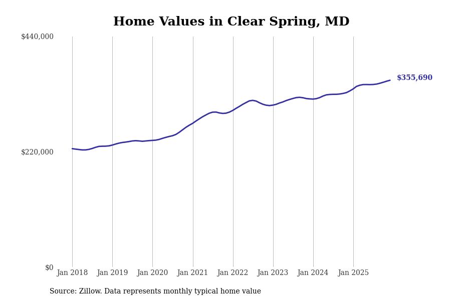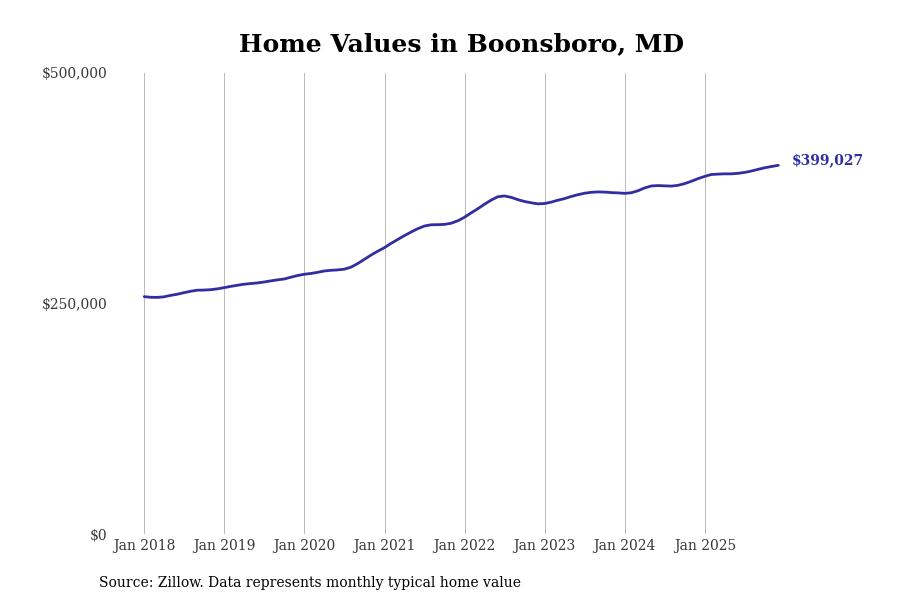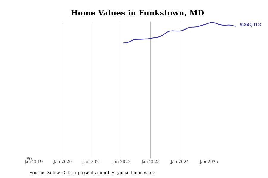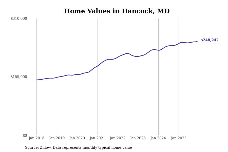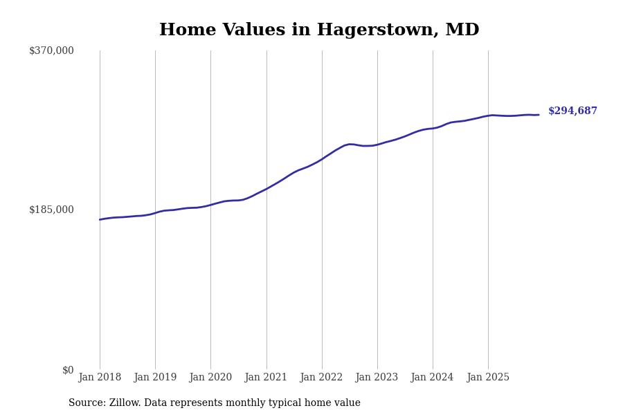 Stacker compiled a list of cities with the most expensive homes in the Hagerstown metro area using data from Zillow. Charts show the monthly typical home value since January 2018. All 29 cities and towns with data available were included in the list.