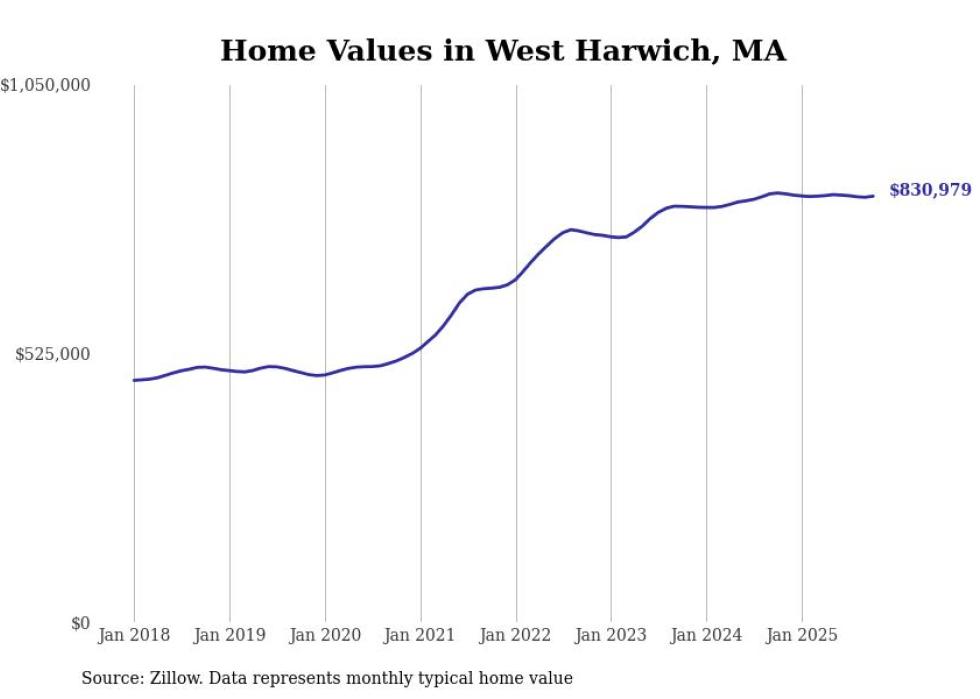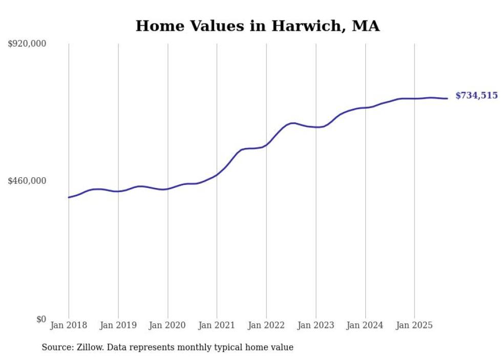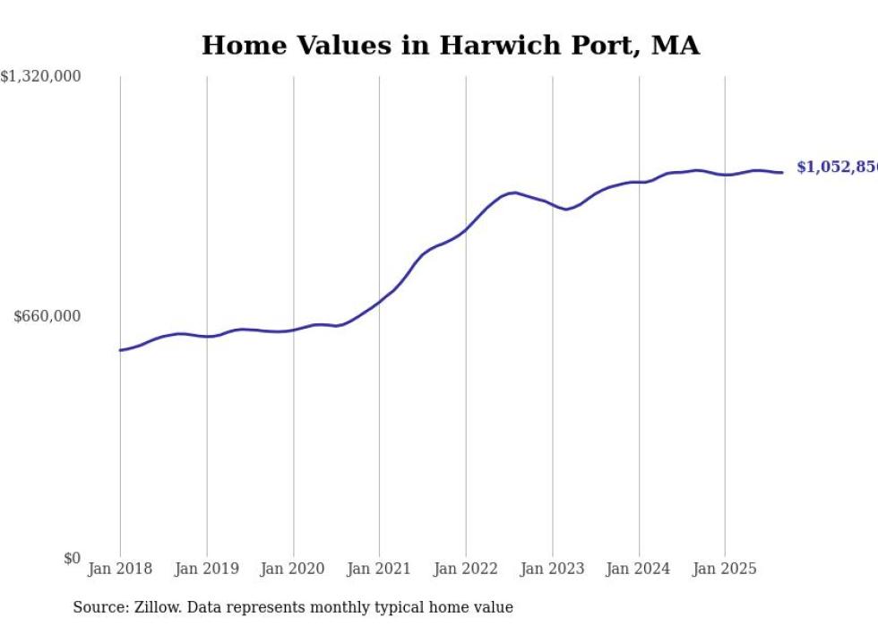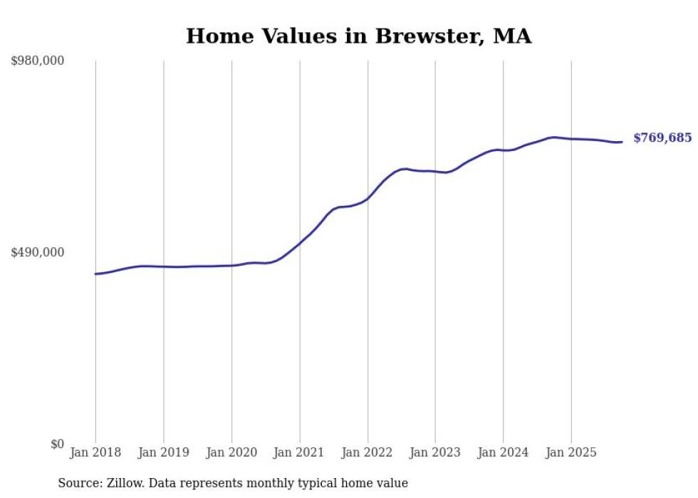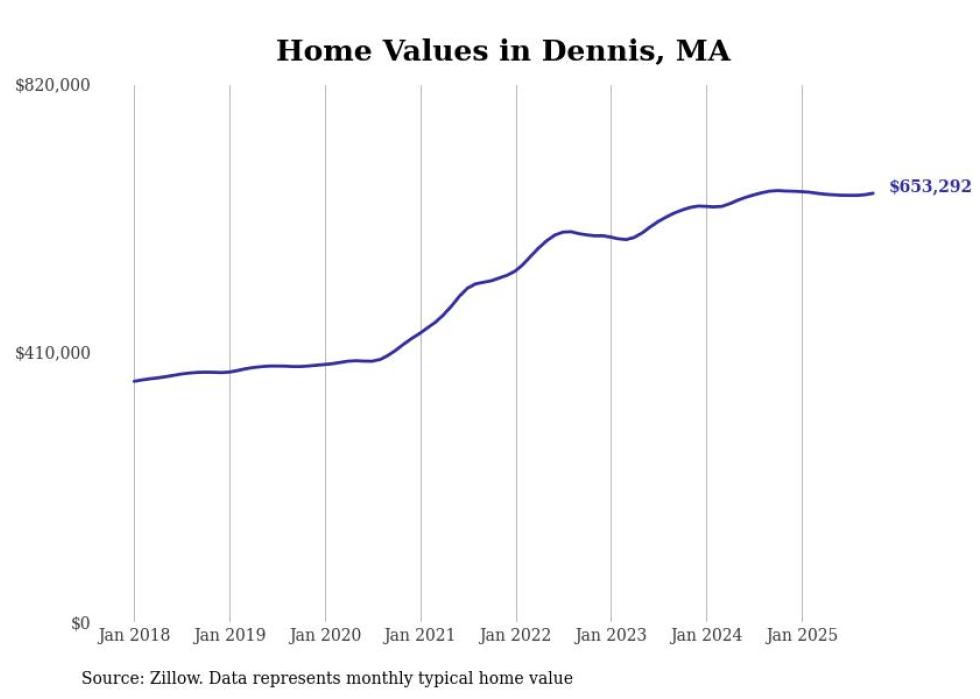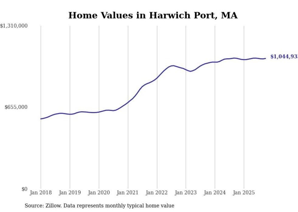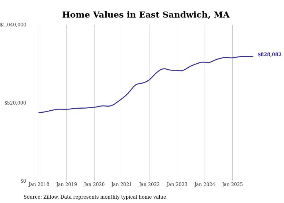 Stacker compiled a list of cities with the most expensive homes in the Barnstable Town, MA metro area using data from Zillow. Charts show the monthly typical home value since January 2018.