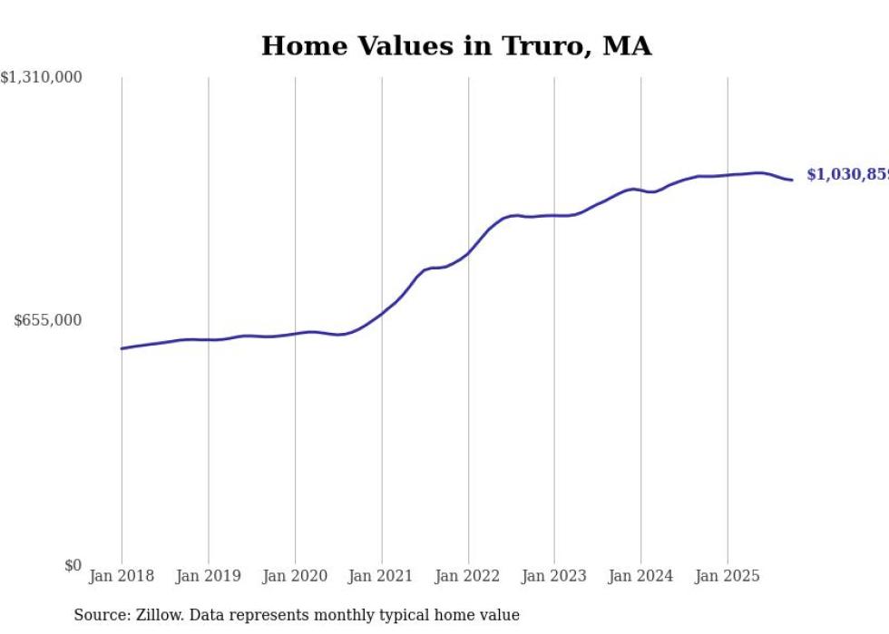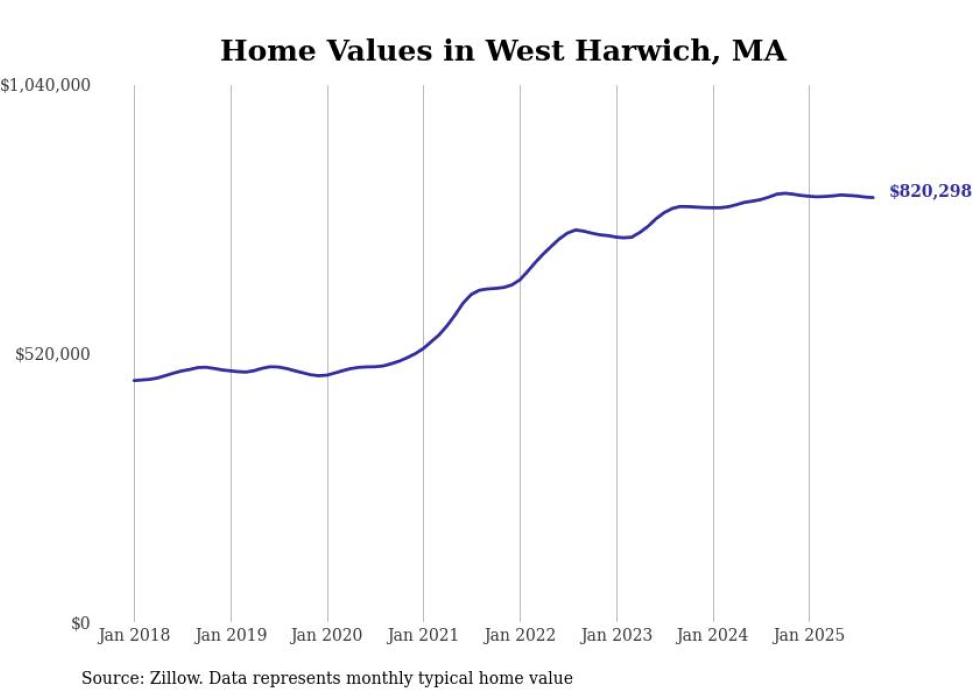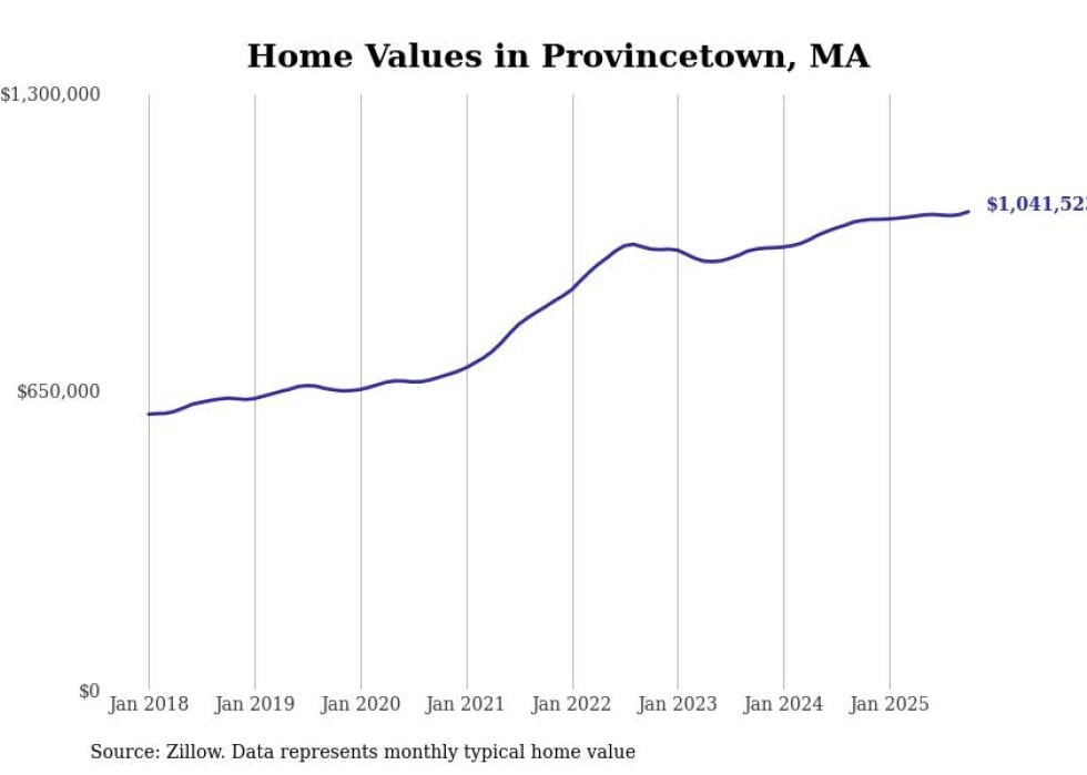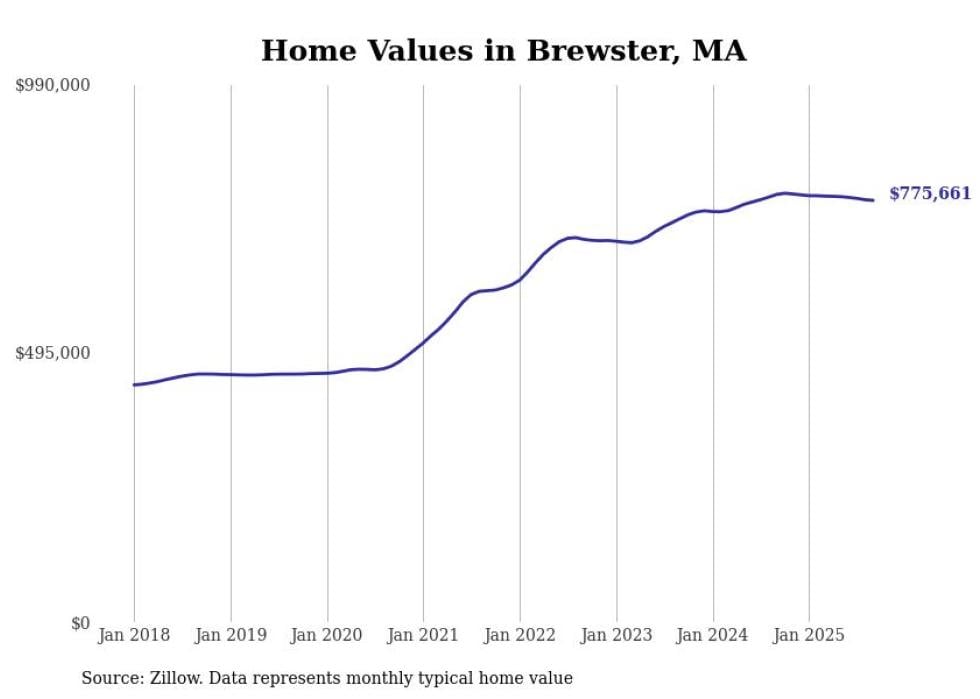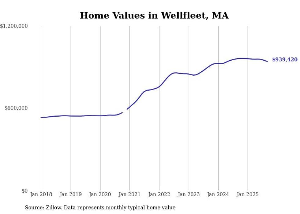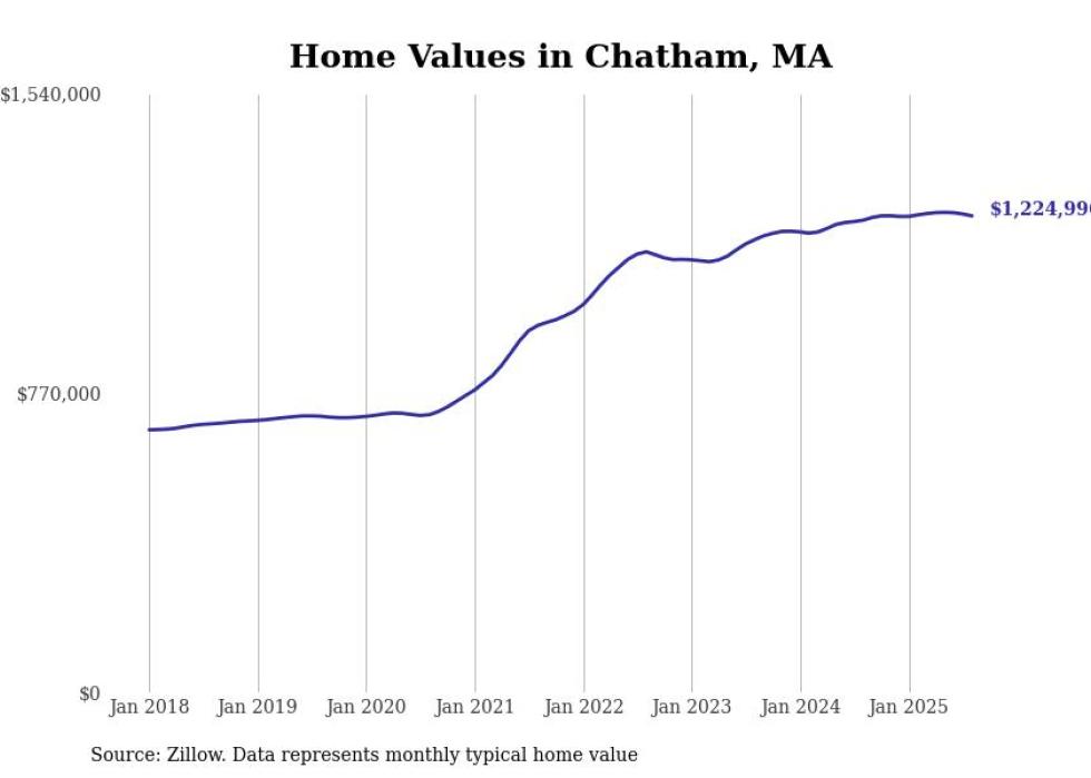 Stacker compiled a list of cities with the most expensive homes in the Barnstable Town, MA metro area using data from Zillow. Charts show the monthly typical home value since January 2018.