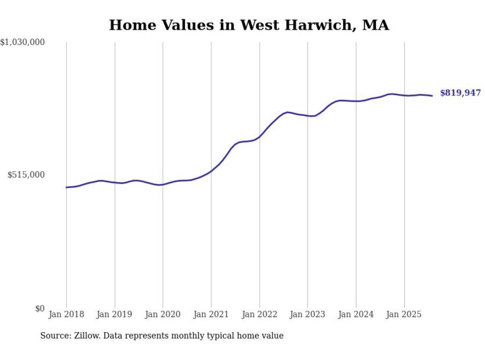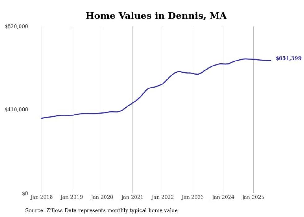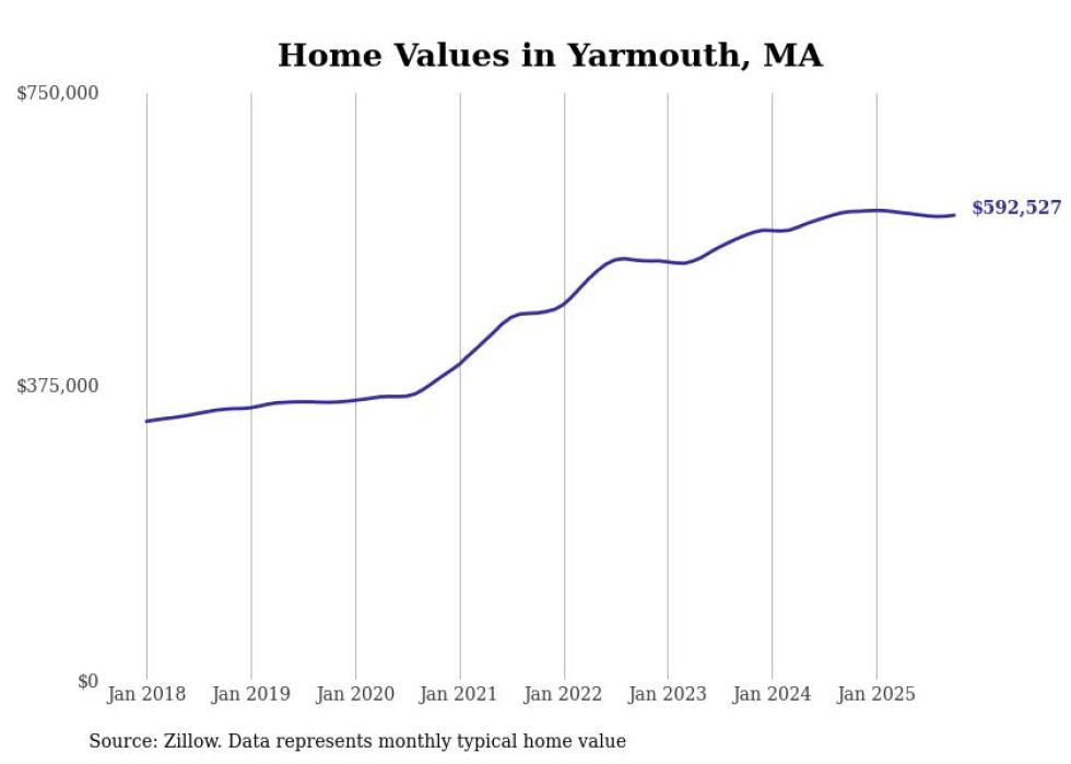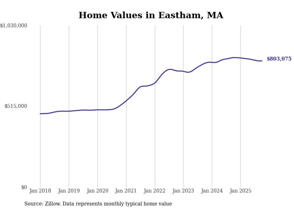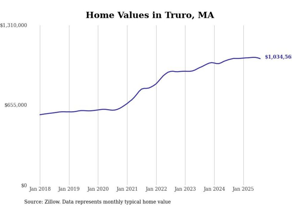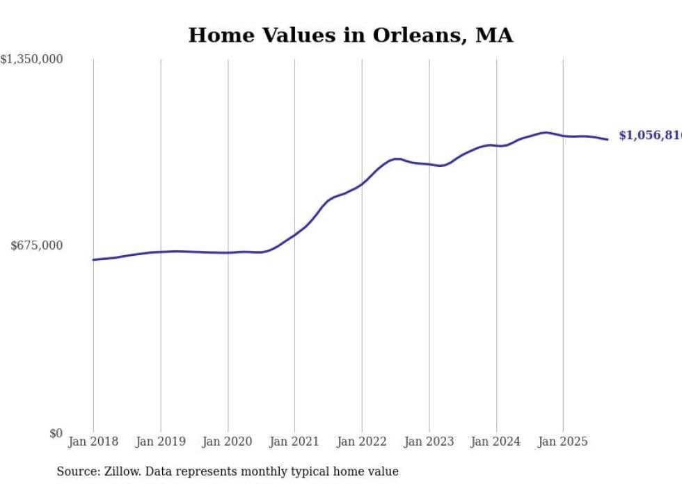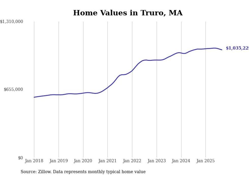 Stacker compiled a list of cities with the most expensive homes in the Barnstable Town, MA metro area using data from Zillow. Charts show the monthly typical home value since January 2018.
