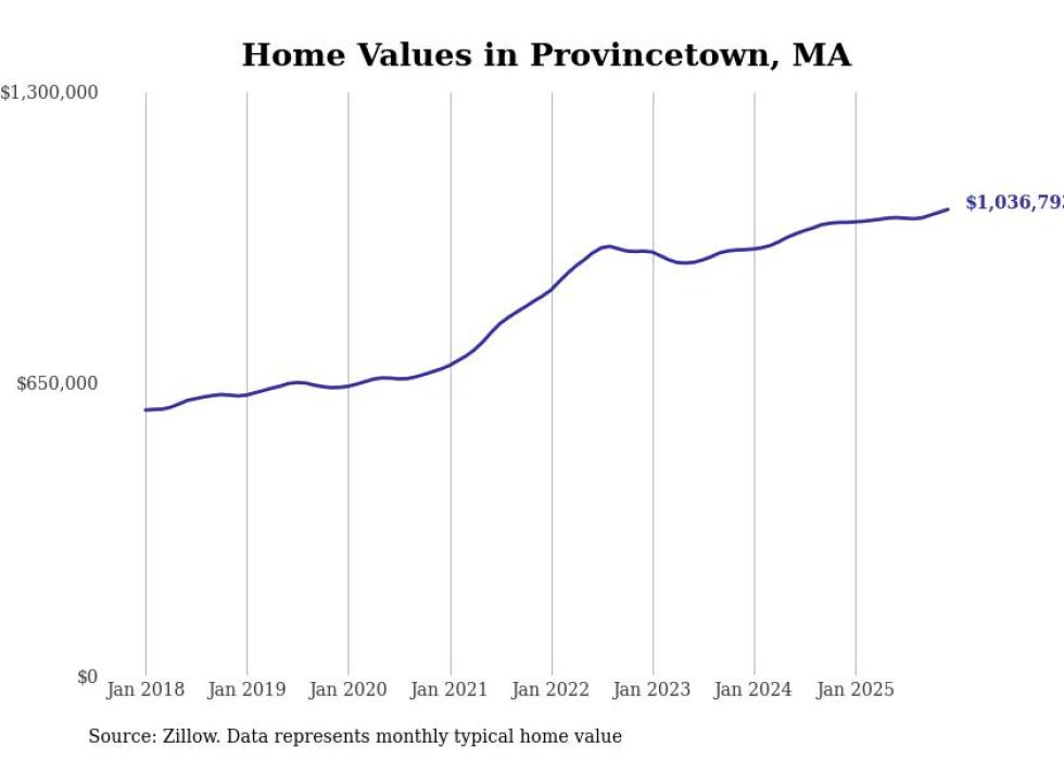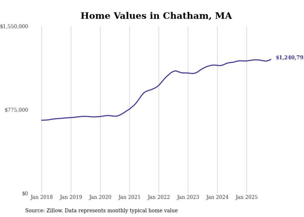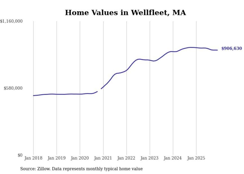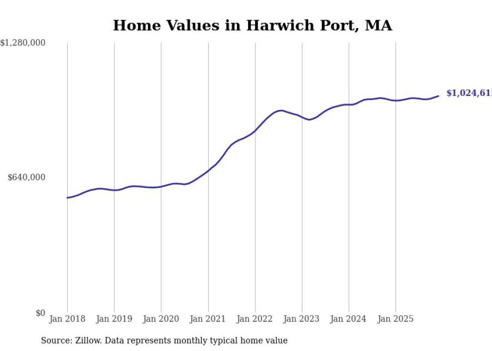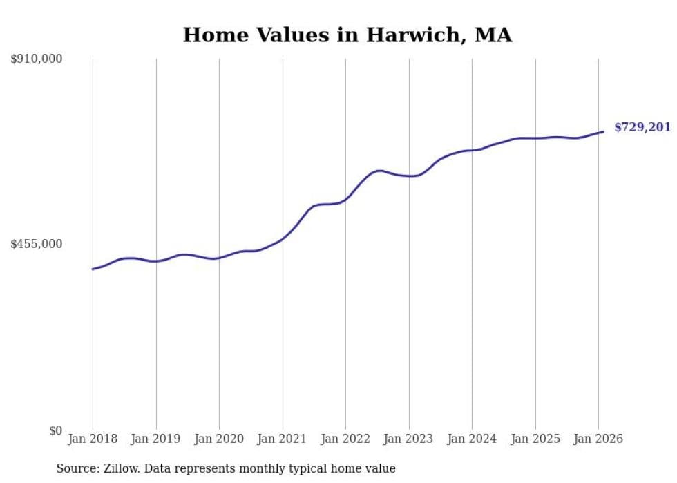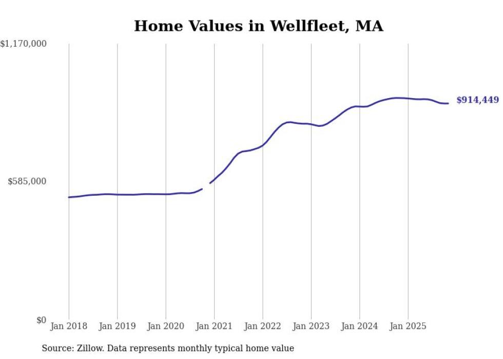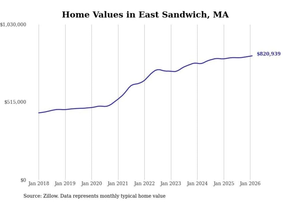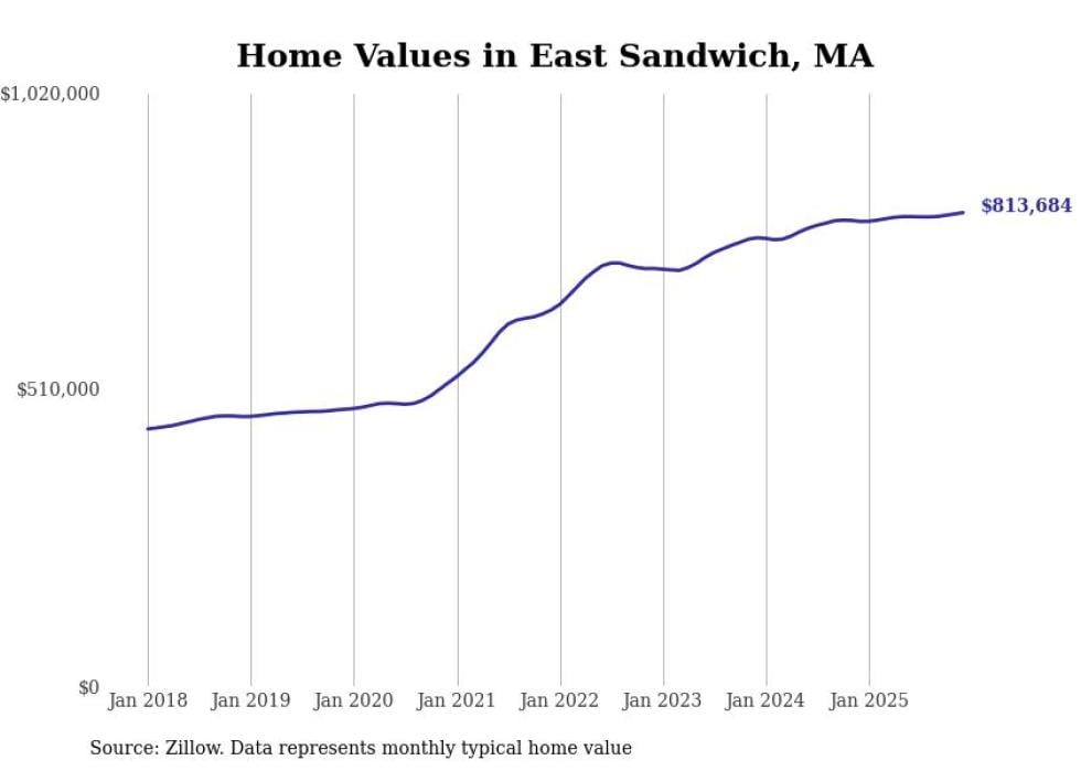 Stacker compiled a list of cities with the most expensive homes in the Barnstable Town metro area using data from Zillow. Charts show the monthly typical home value since January 2018. All 19 cities and towns with data available were included in the list.