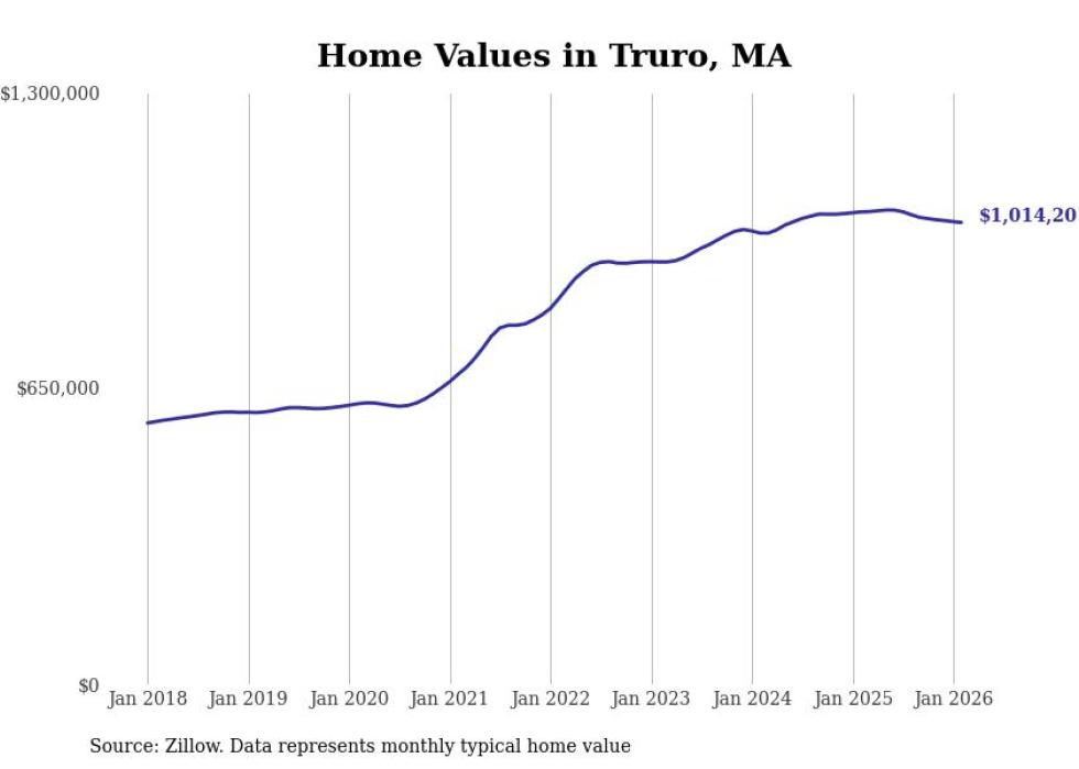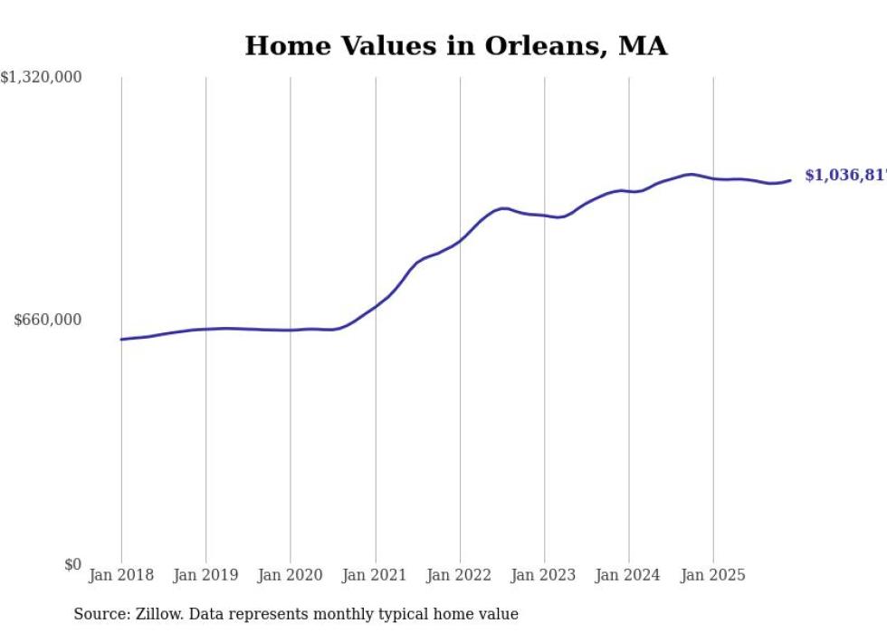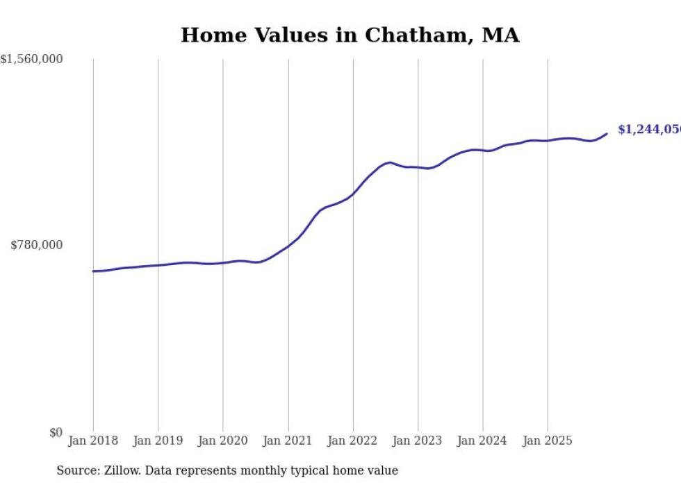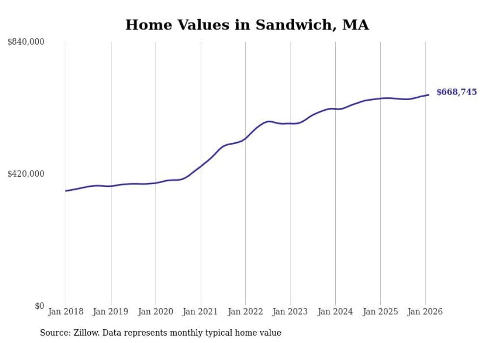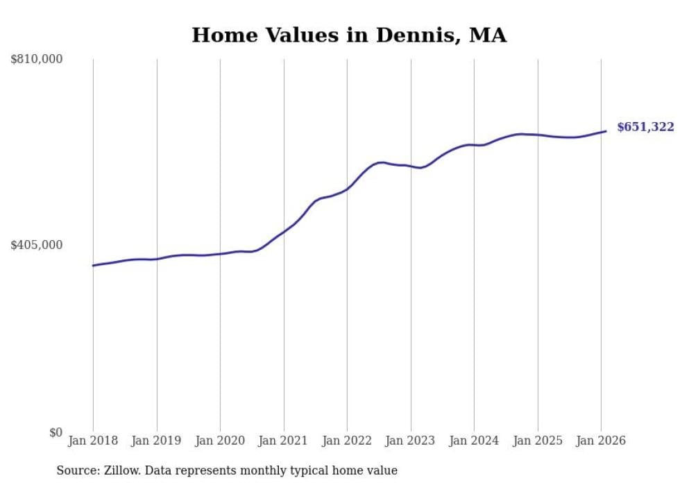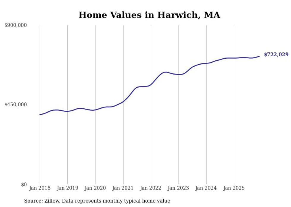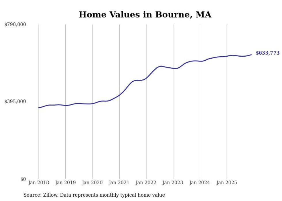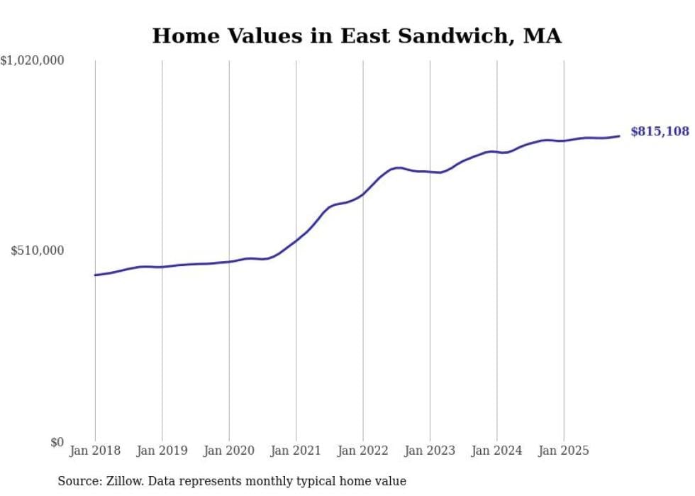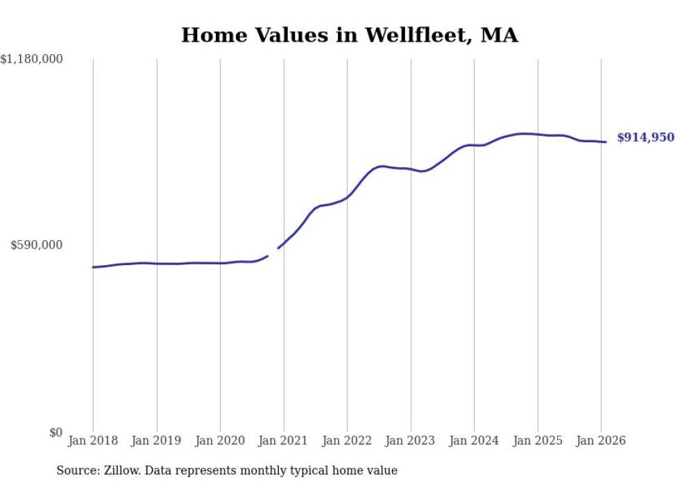 Stacker compiled a list of cities with the most expensive homes in the Barnstable Town metro area using data from Zillow. Charts show the monthly typical home value since January 2018. All 19 cities and towns with data available were included in the list.