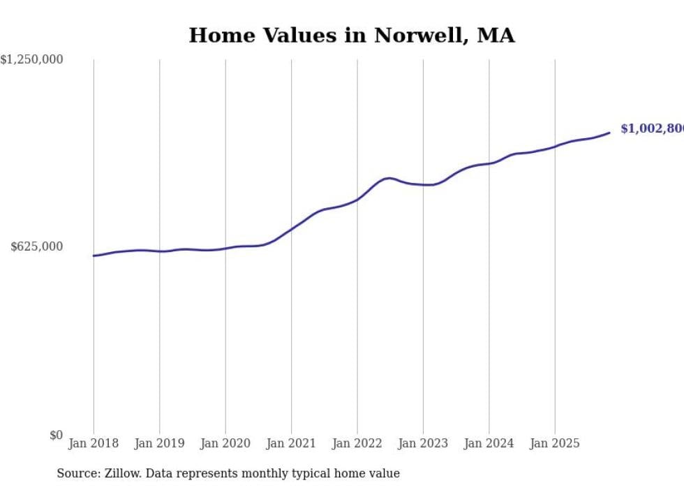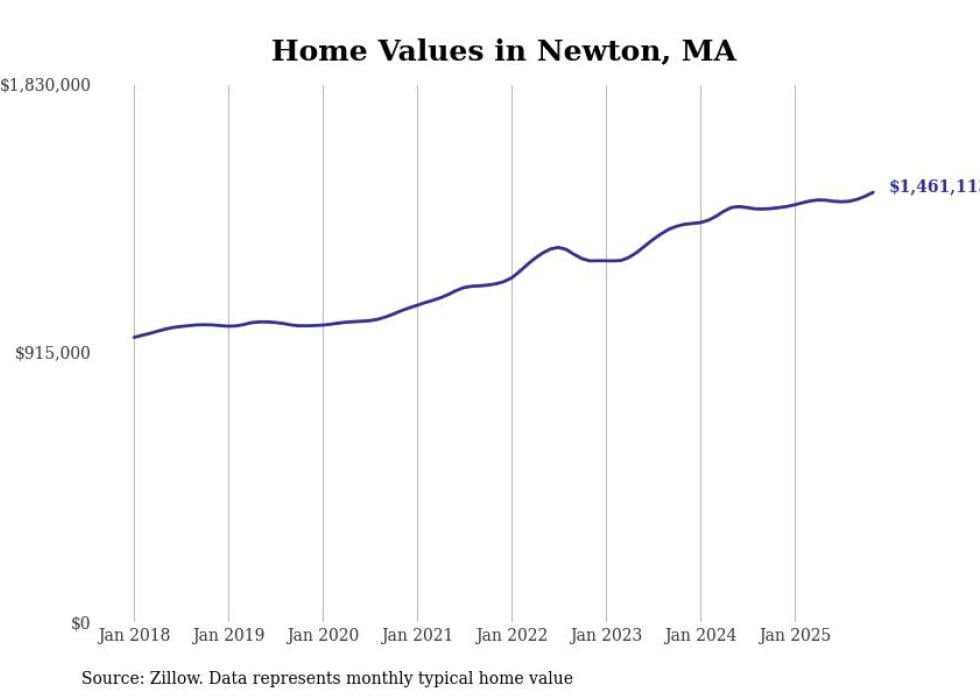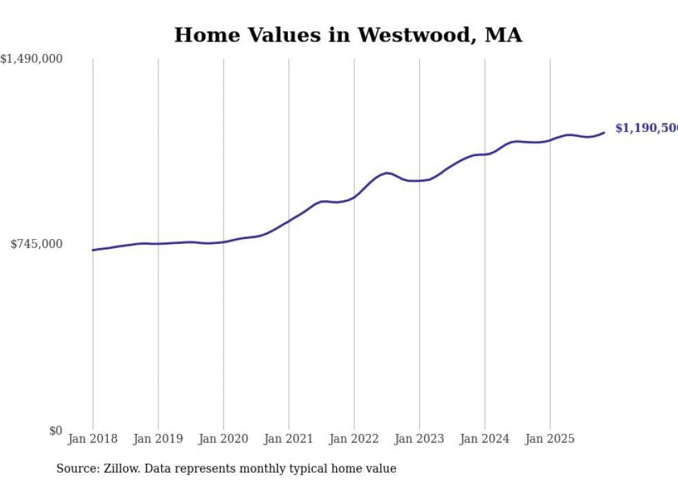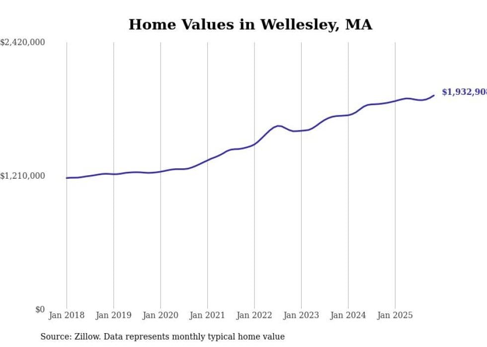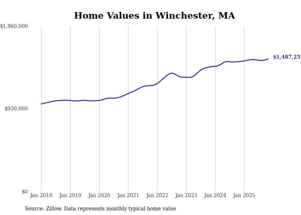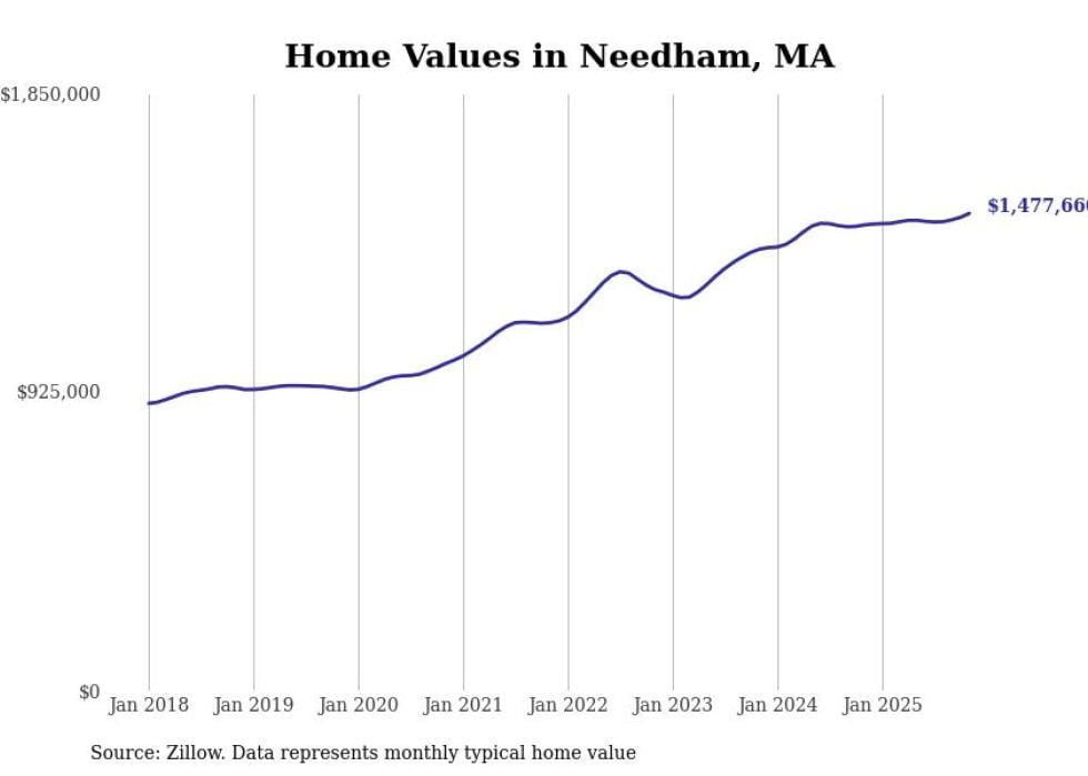 Stacker compiled a list of cities with the most expensive homes in the Boston-Cambridge-Newton, MA-NH metro area using data from Zillow. Charts show the monthly typical home value since January 2018.