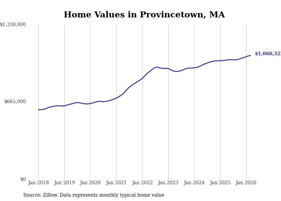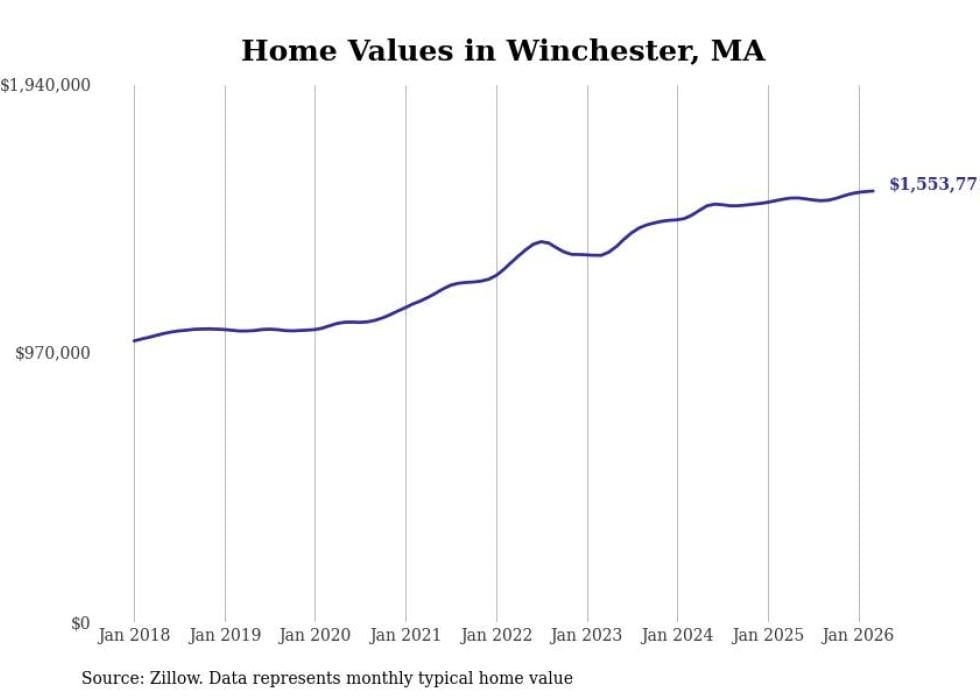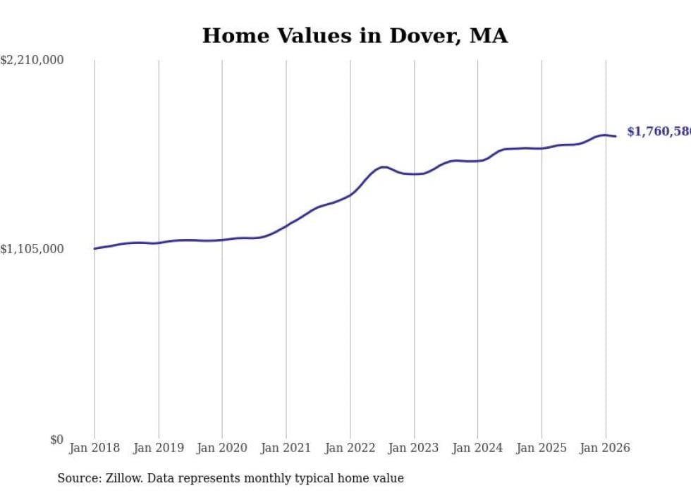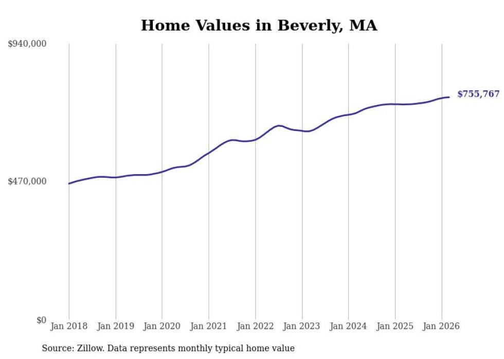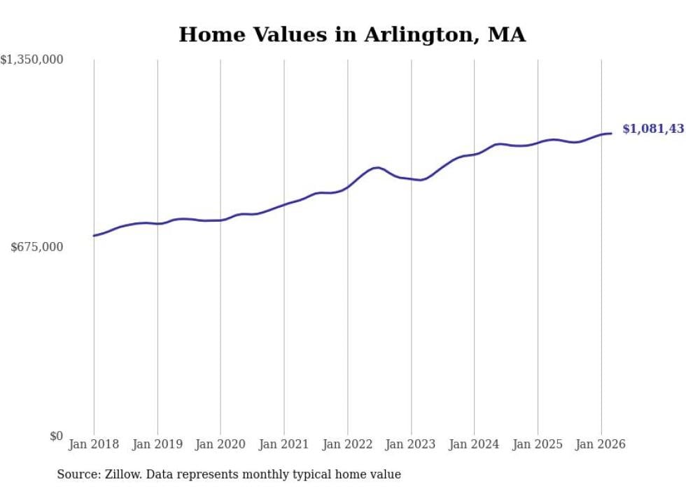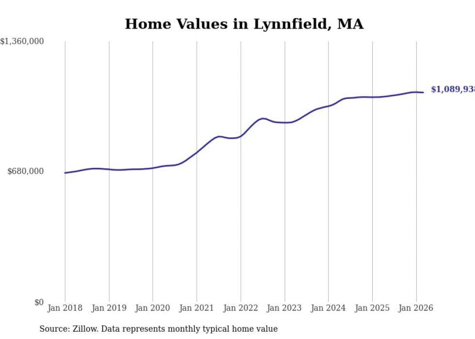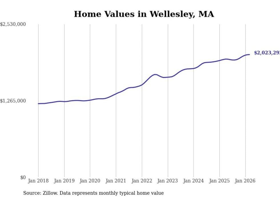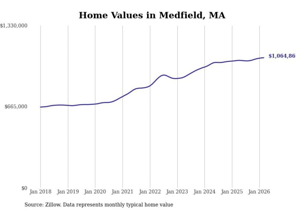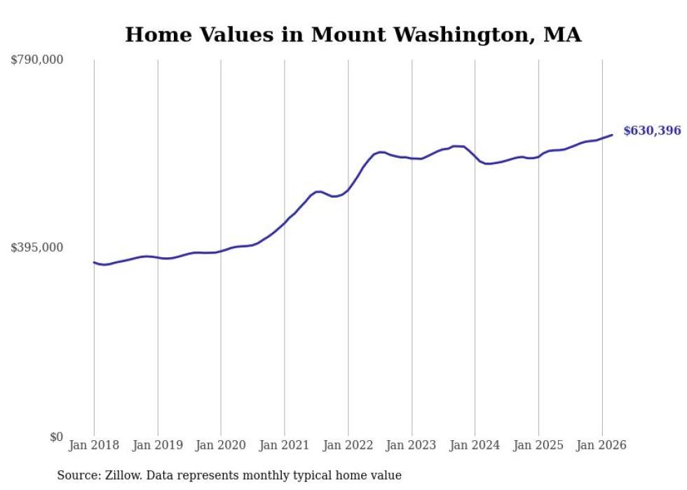 Stacker compiled a list of cities with the fastest-growing home prices in Massachusetts using data from Zillow. Cities are ranked by the dollar change in the Zillow Home Values Index for all homes from the 12 months ending March 2026. The charts in this story were created automatically using Matplotlib. Data was available for 50 cities and towns in Massachusetts.