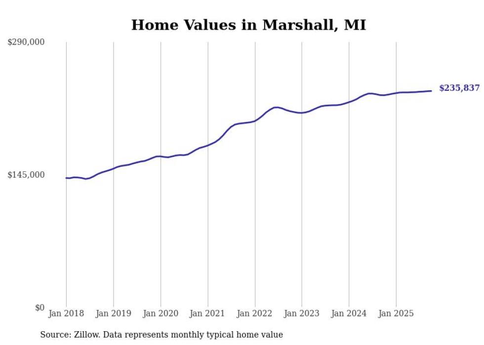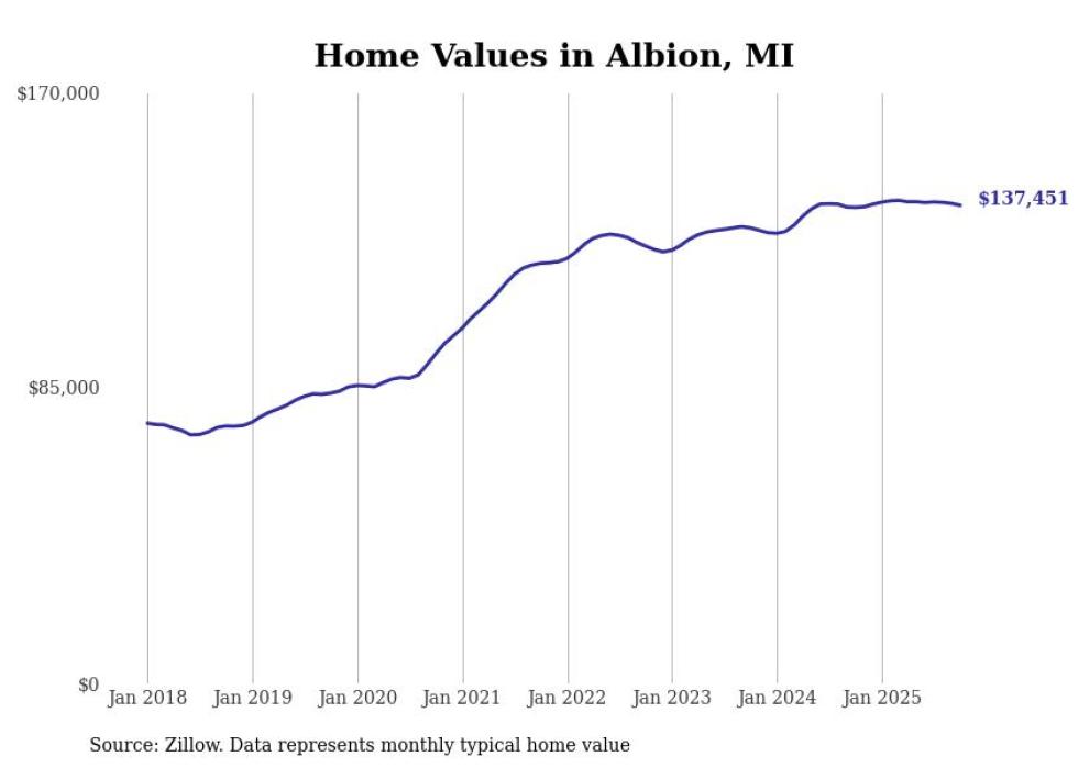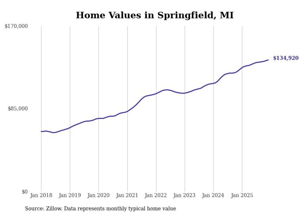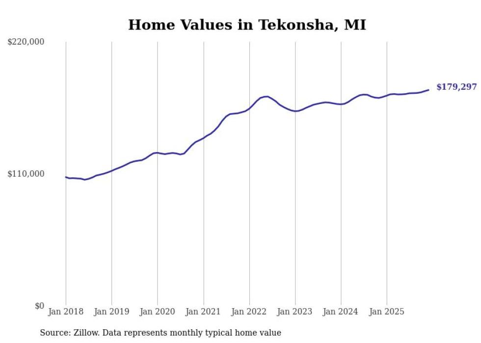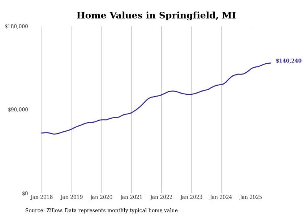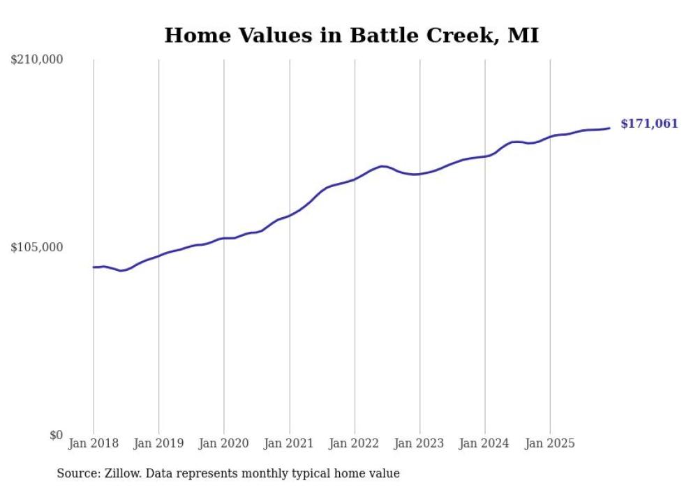 Stacker compiled a list of cities with the most expensive homes in the Battle Creek metro area using data from Zillow. Charts show the monthly typical home value since January 2018. All 10 cities and towns with data available were included in the list.