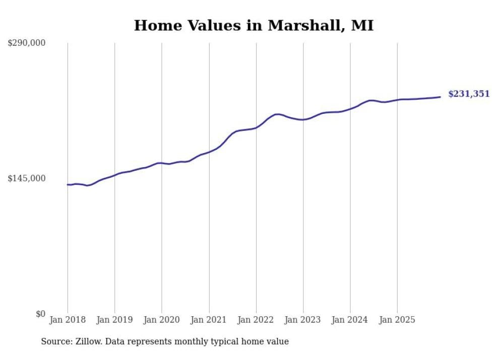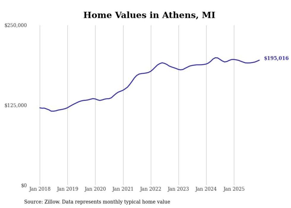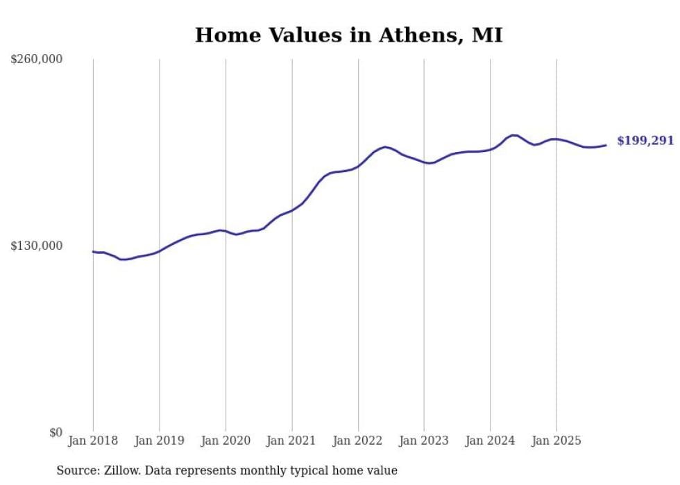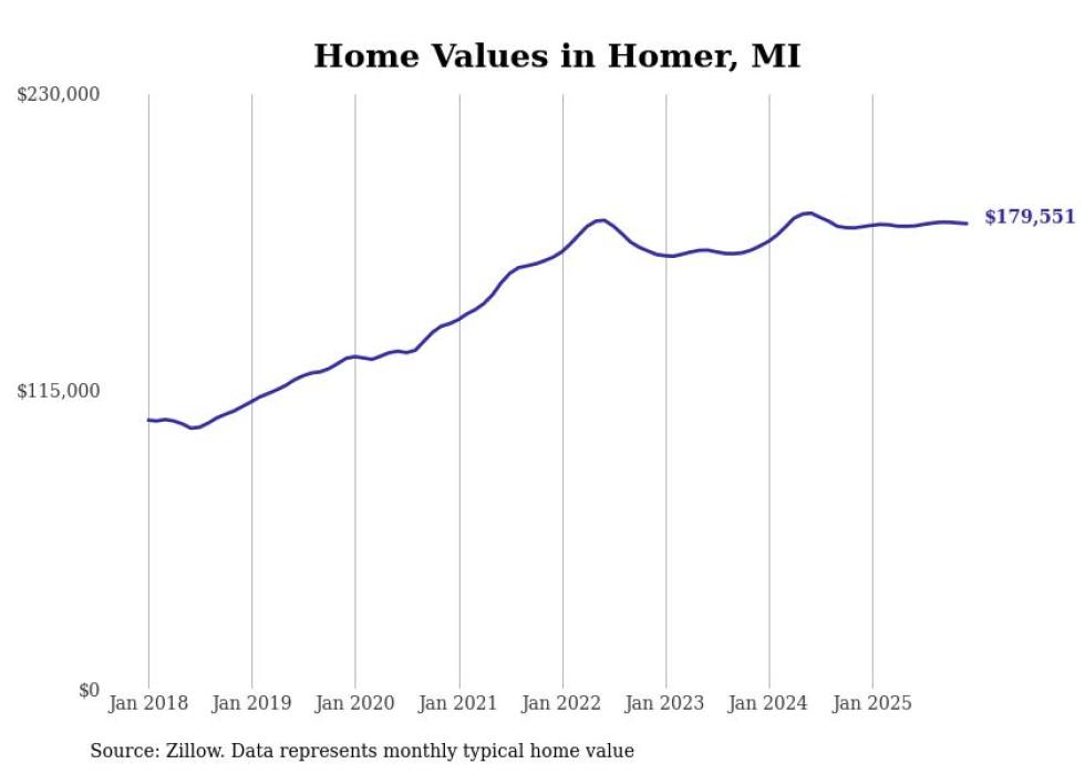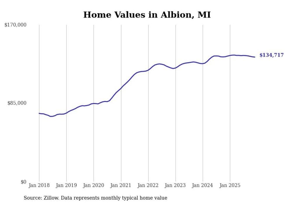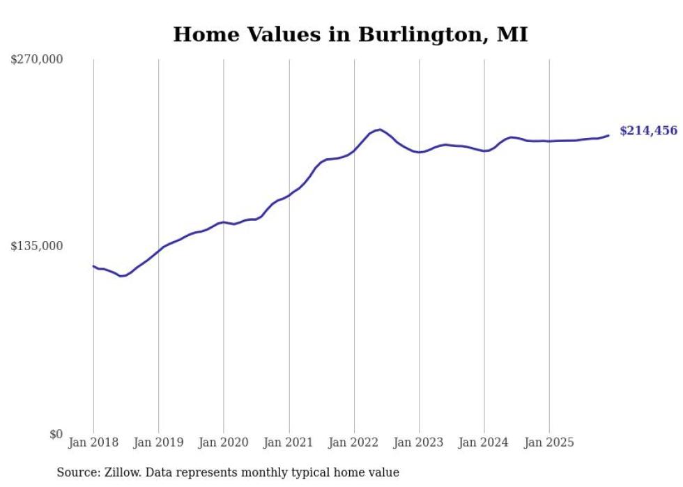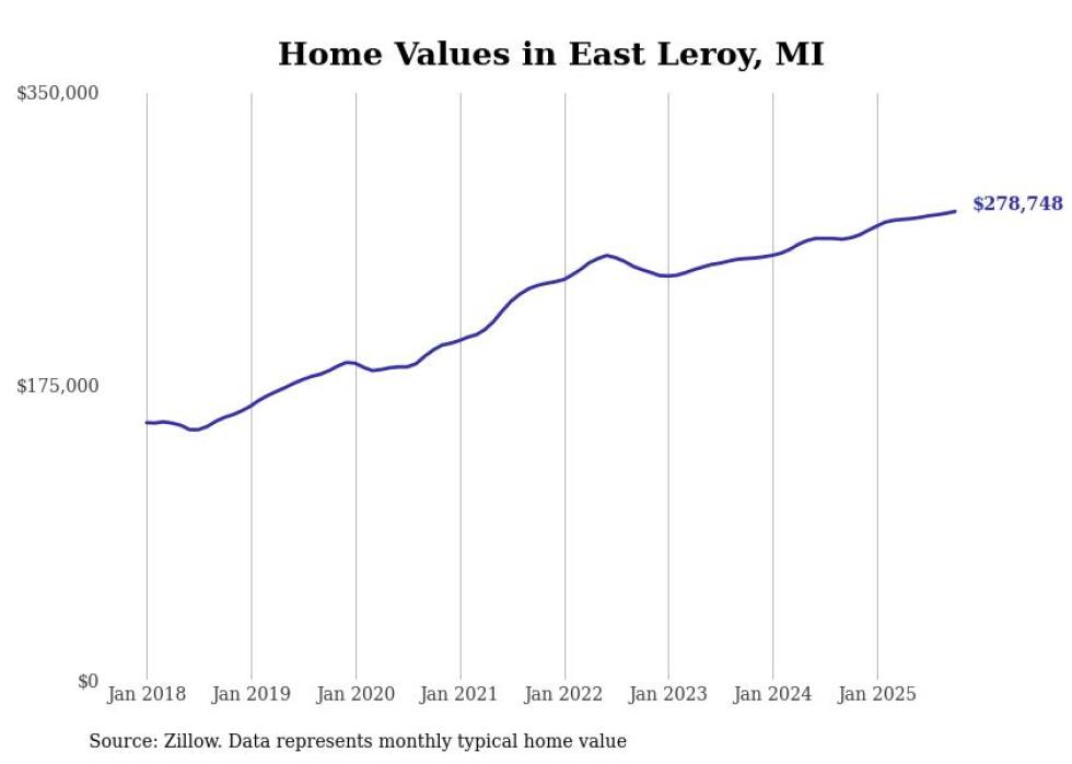Stacker compiled a list of cities with the most expensive homes in the Battle Creek metro area using data from Zillow. Charts show the monthly typical home value since January 2018. All 10 cities and towns with data available were included in the list.