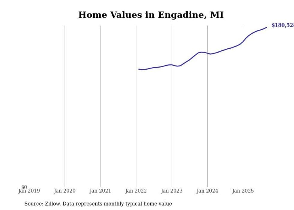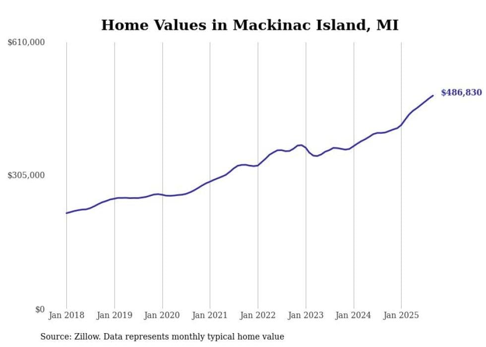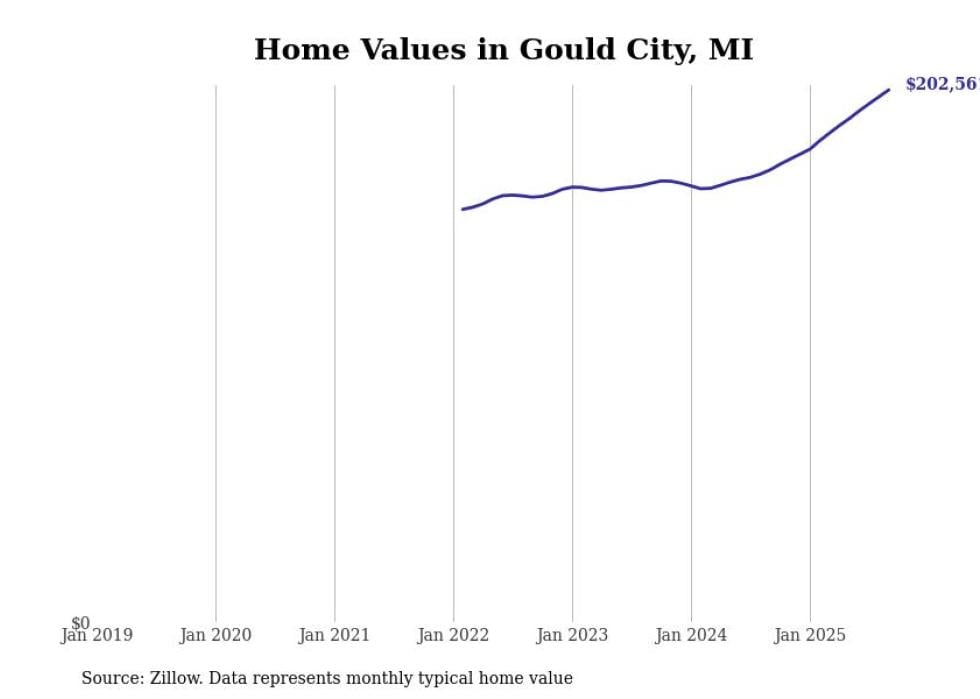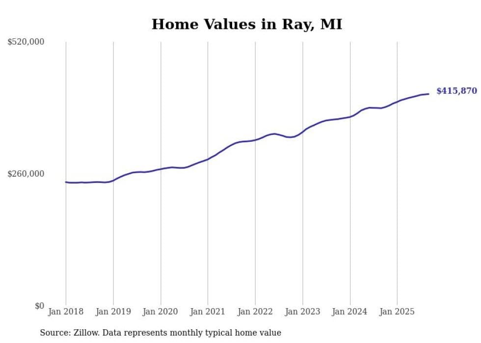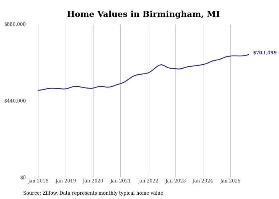 Stacker compiled a list of cities with the fastest-growing home prices in Michigan using data from Zillow. Cities are ranked by the dollar change in the Zillow Home Values Index for all homes from the 12 months ending September 2025. The charts in this story were created automatically using Matplotlib. Data was available for 50 cities and towns in Michigan.