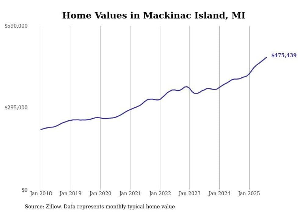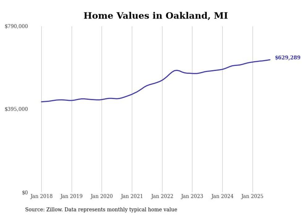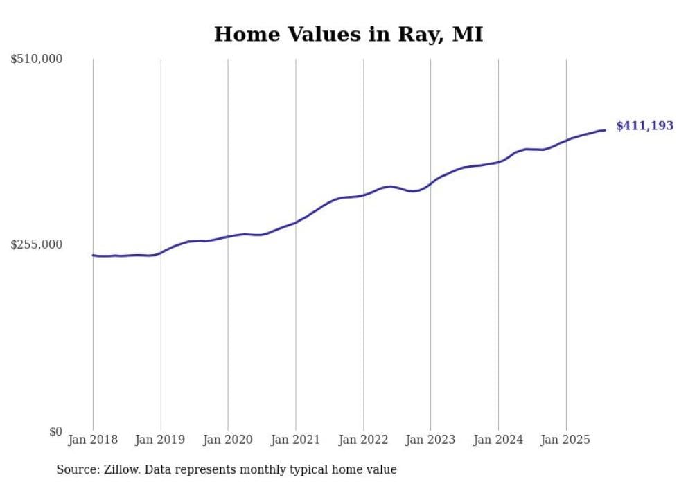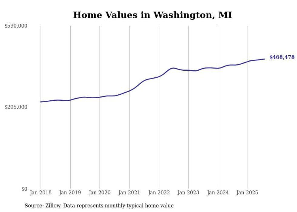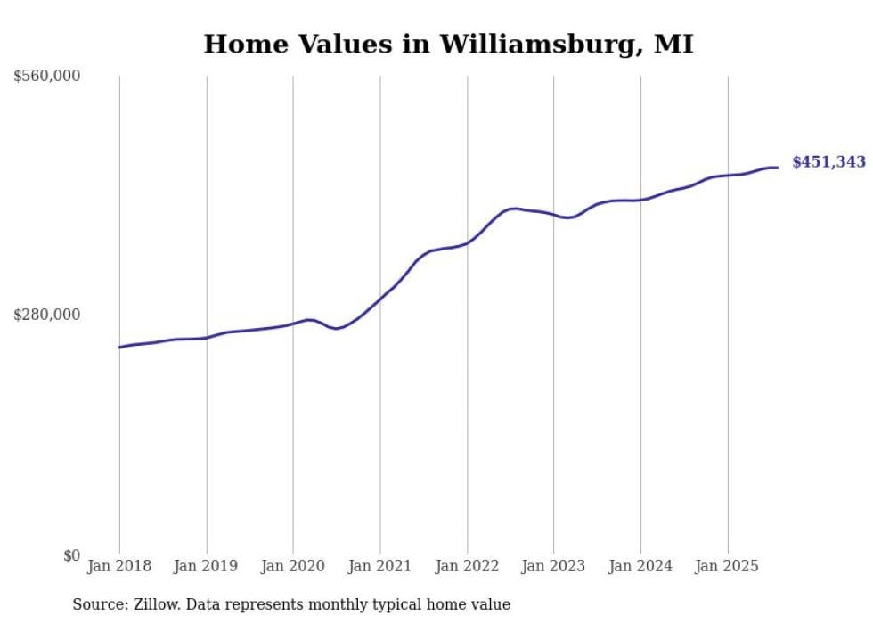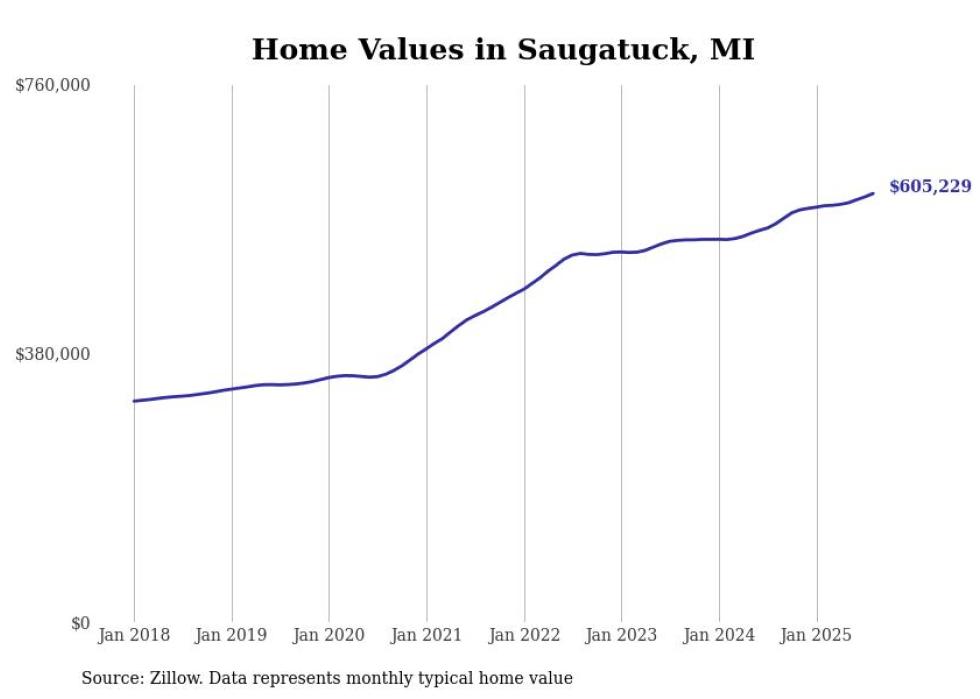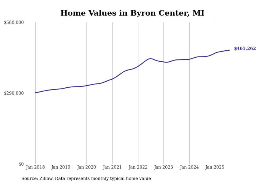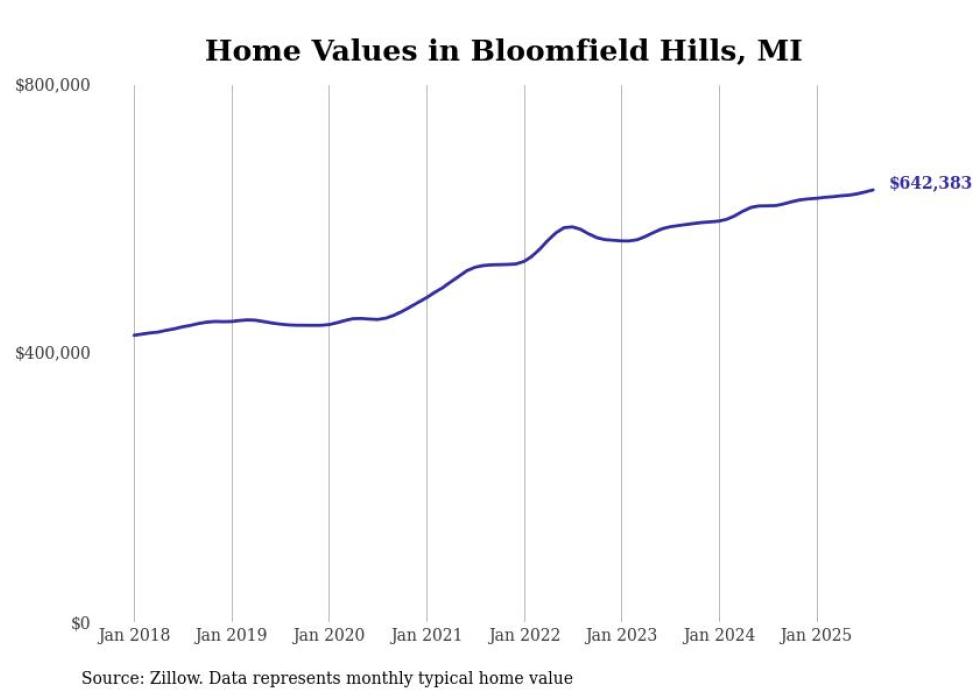 Stacker compiled a list of cities with the fastest-growing home prices in Michigan using data from Zillow. Cities are ranked by the dollar change in the Zillow Home Values Index for all homes from the 12 months ending August 2025. The charts in this story were created automatically using Matplotlib. Data was available for 50 cities and towns in Michigan.