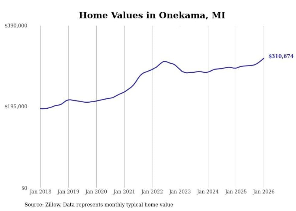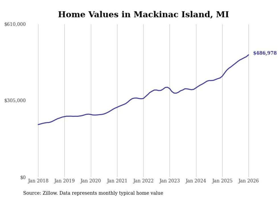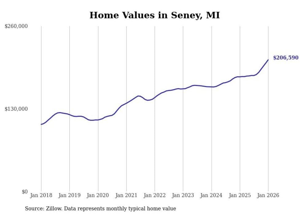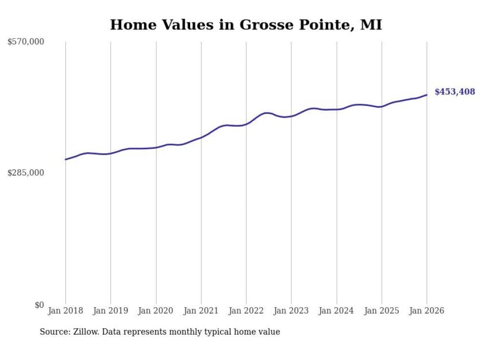 Stacker compiled a list of cities with the fastest-growing home prices in Michigan using data from Zillow. Cities are ranked by the dollar change in the Zillow Home Values Index for all homes from the 12 months ending January 2026. The charts in this story were created automatically using Matplotlib. Data was available for 50 cities and towns in Michigan.