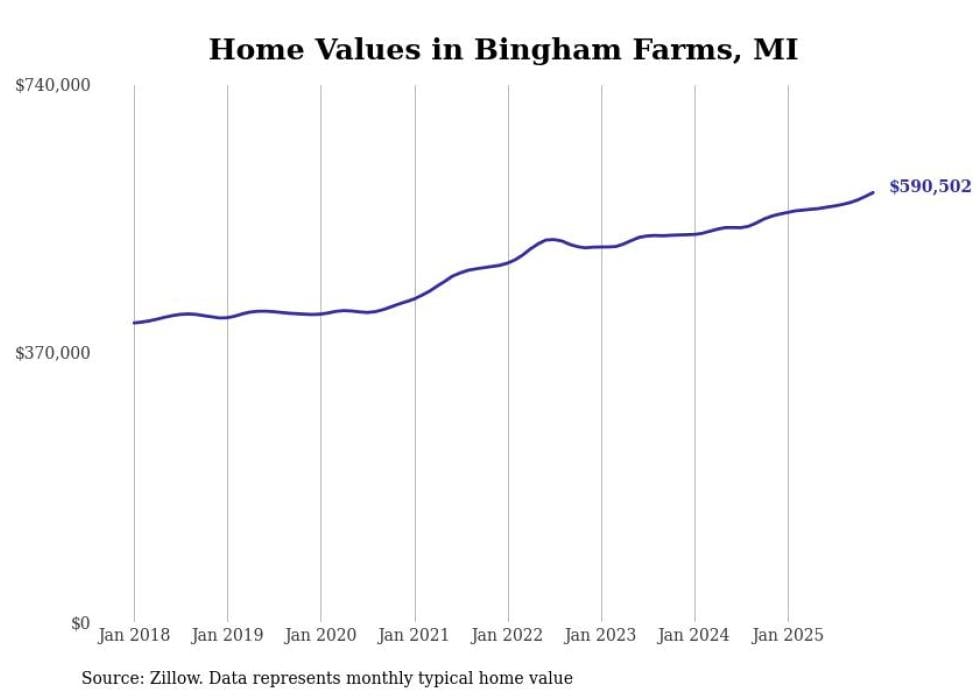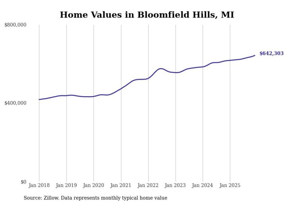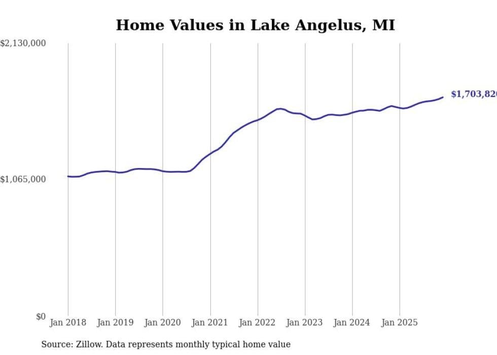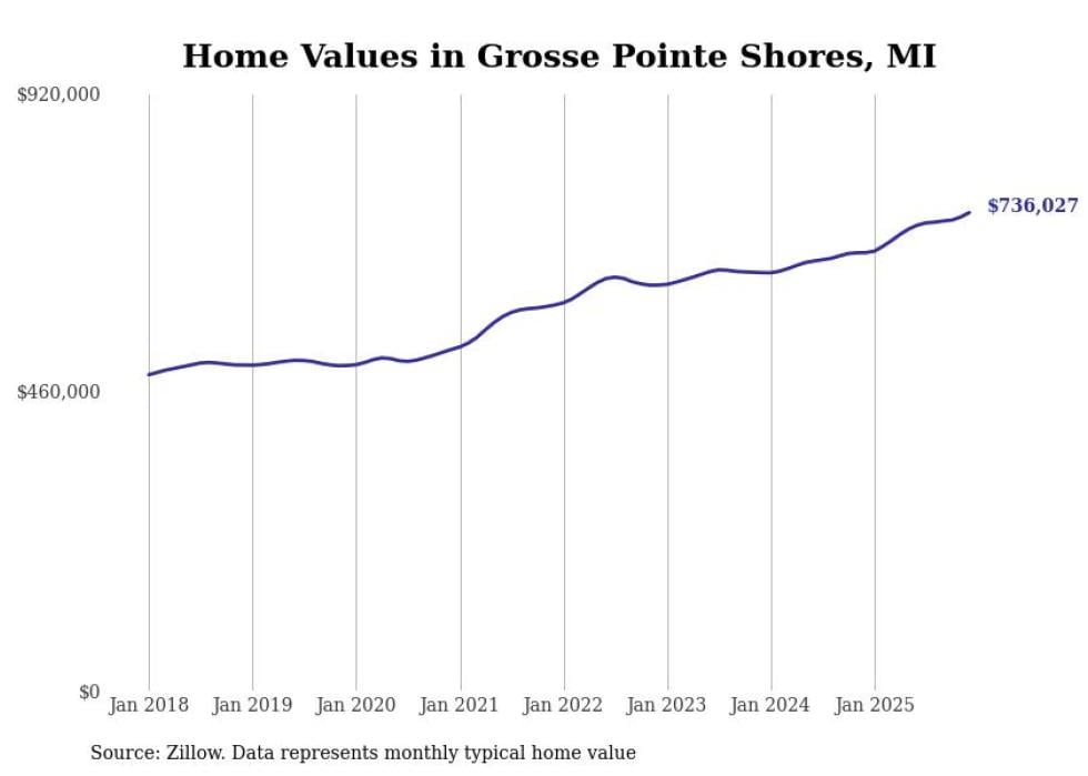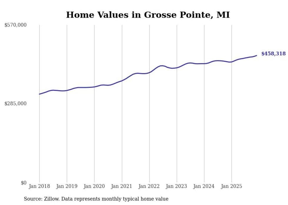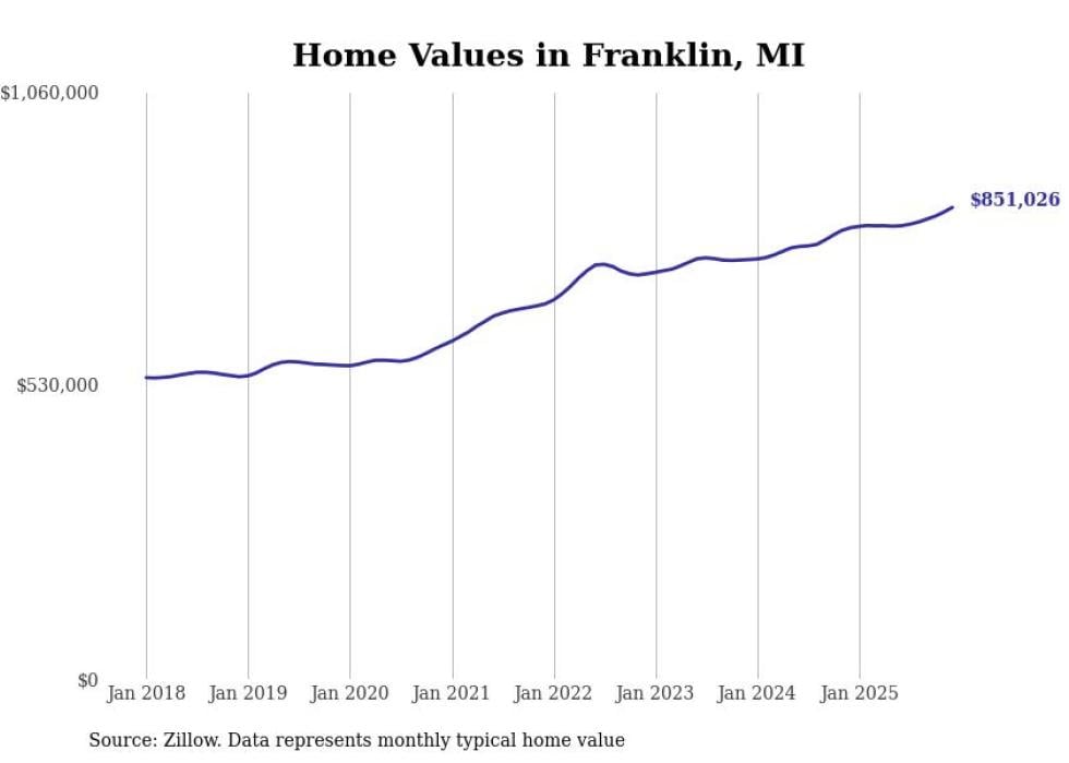 Stacker compiled a list of cities with the most expensive homes in the Detroit metro area using data from Zillow. Charts show the monthly typical home value since January 2018. Data was available for 150 cities and towns.