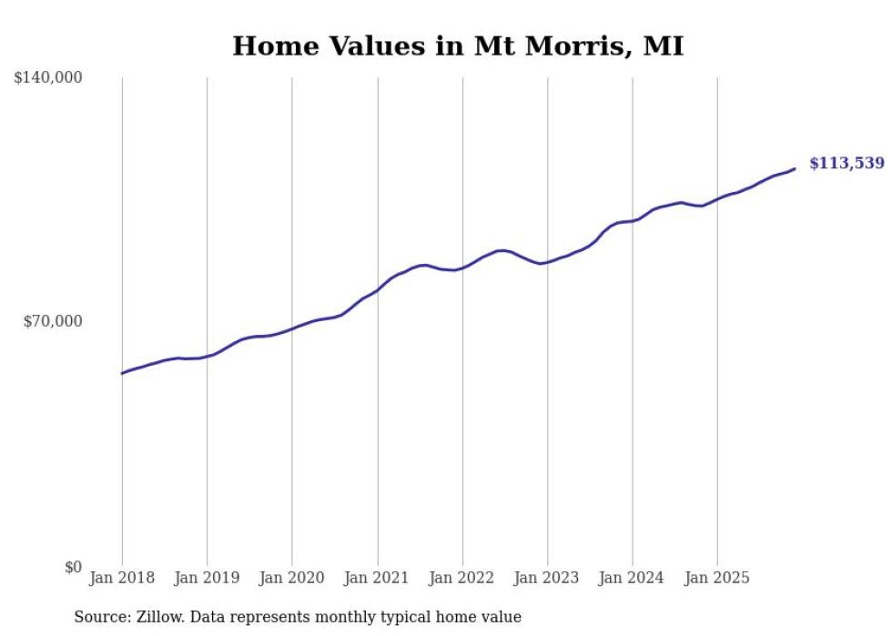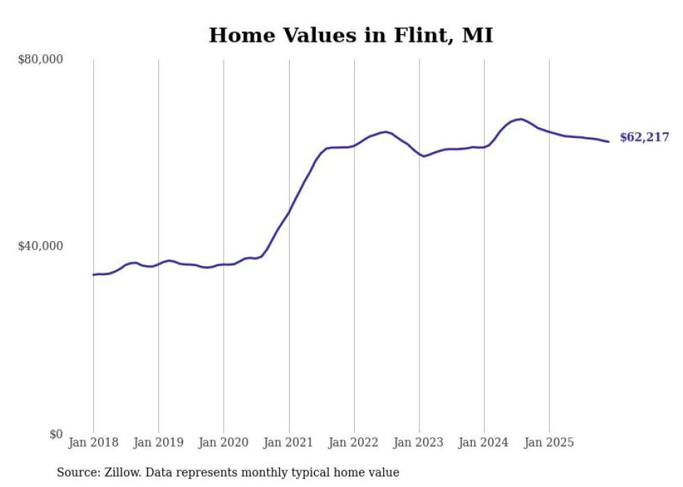 Stacker compiled a list of cities with the most expensive homes in the Flint metro area using data from Zillow. Charts show the monthly typical home value since January 2018. All 18 cities and towns with data available were included in the list.