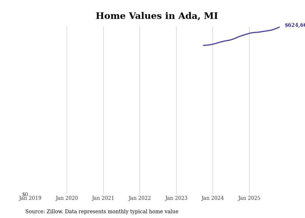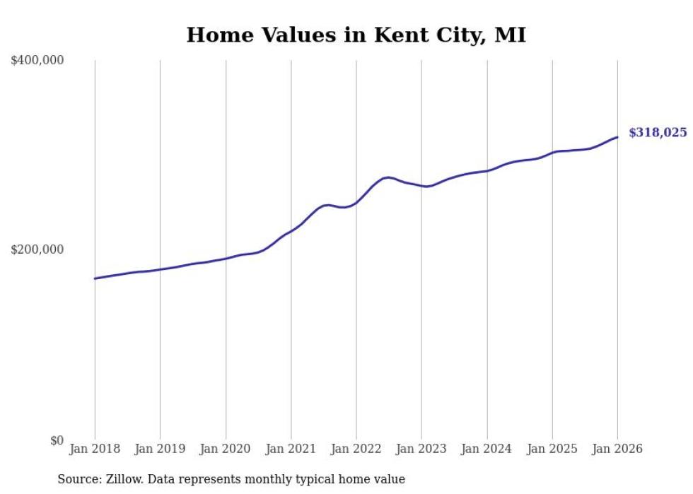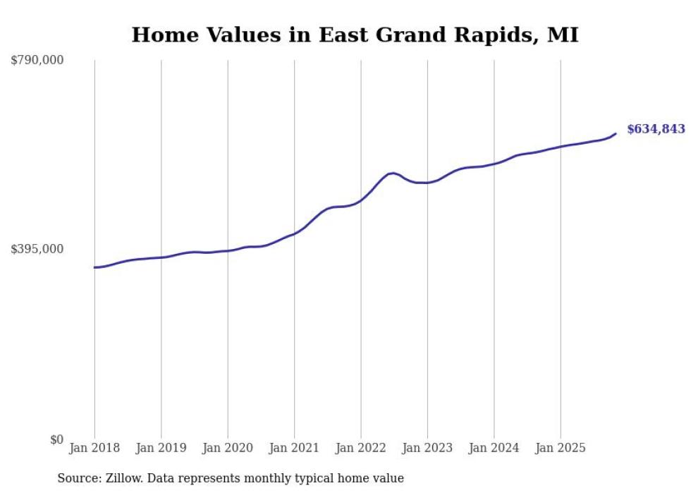 Stacker compiled a list of cities with the most expensive homes in the Grand Rapids-Kentwood, MI metro area using data from Zillow. Charts show the monthly typical home value since January 2018.