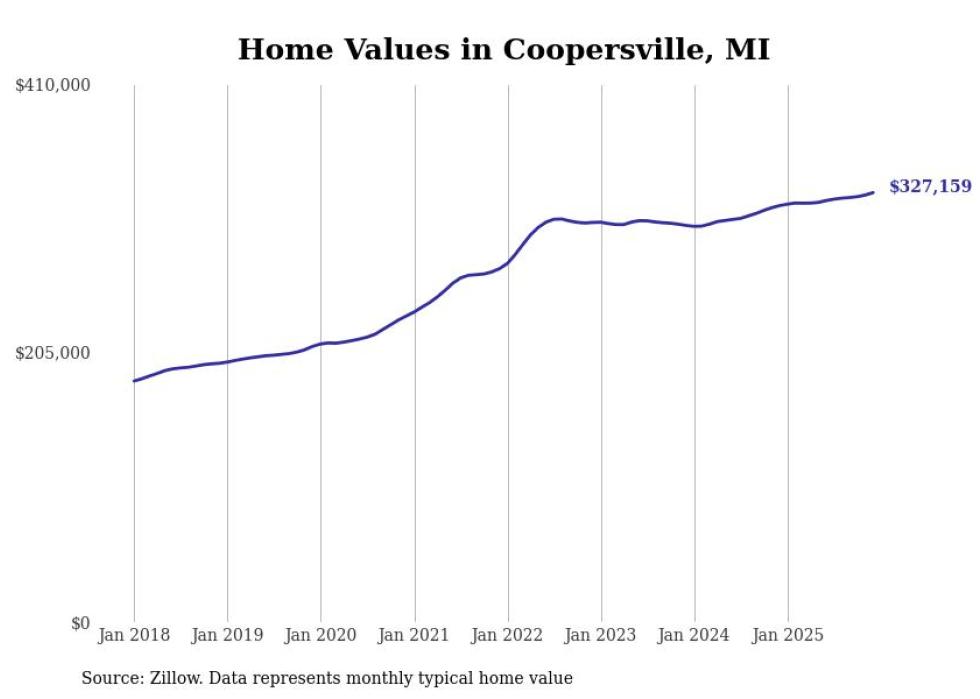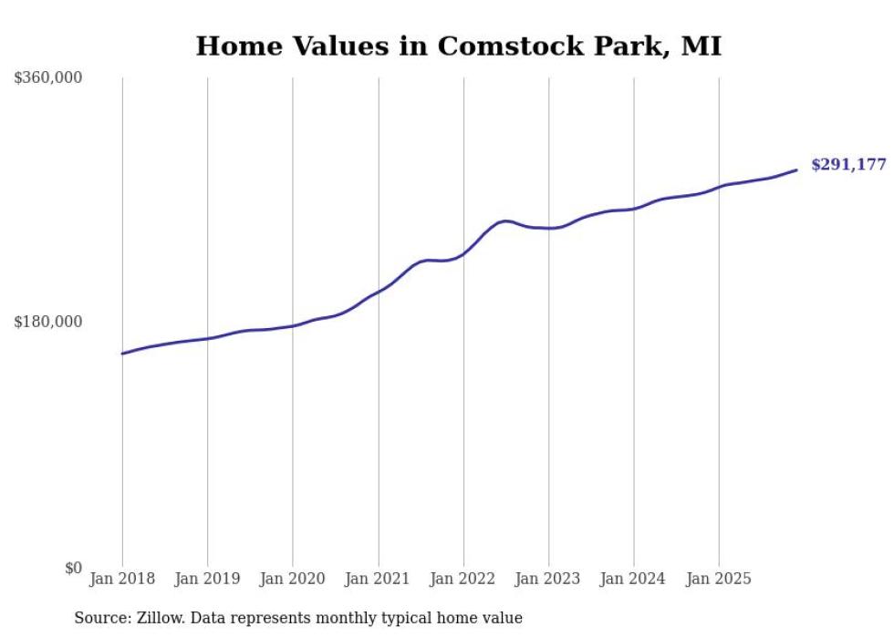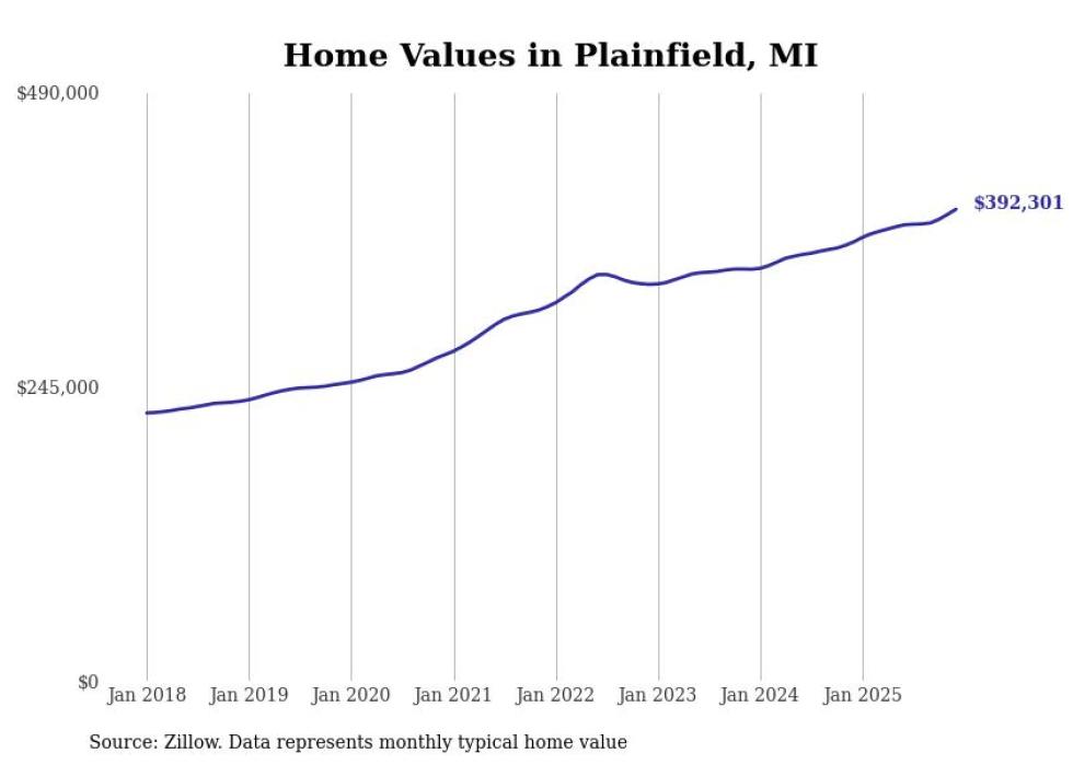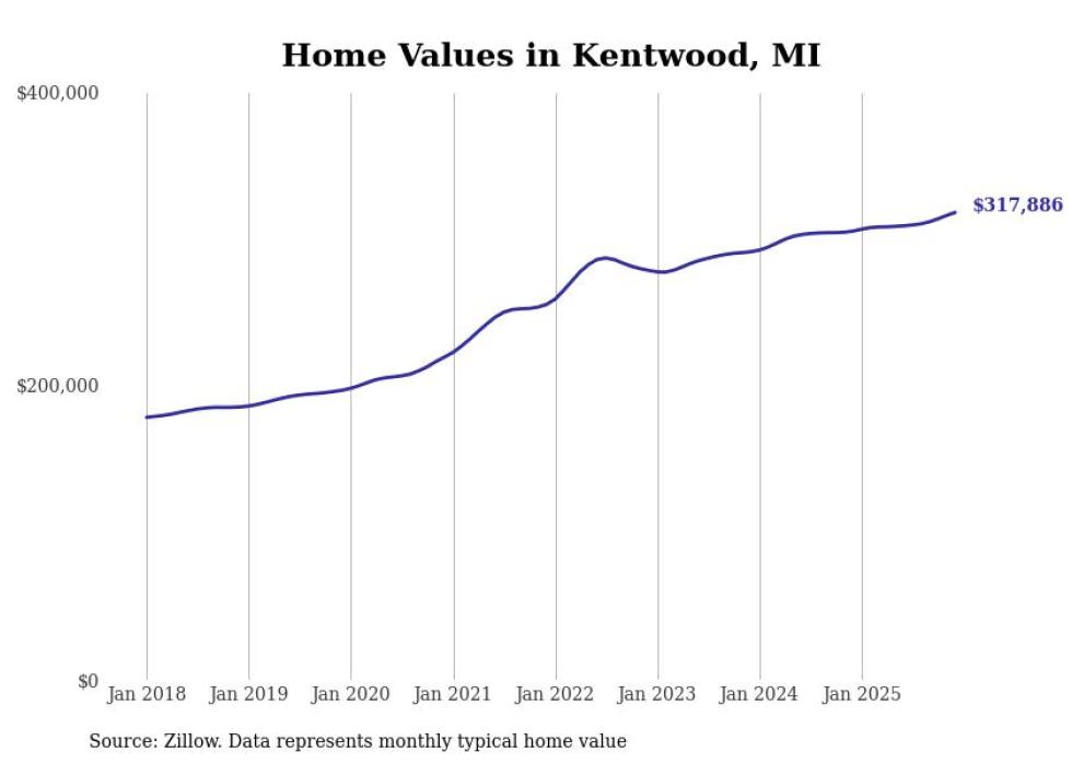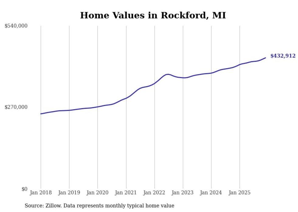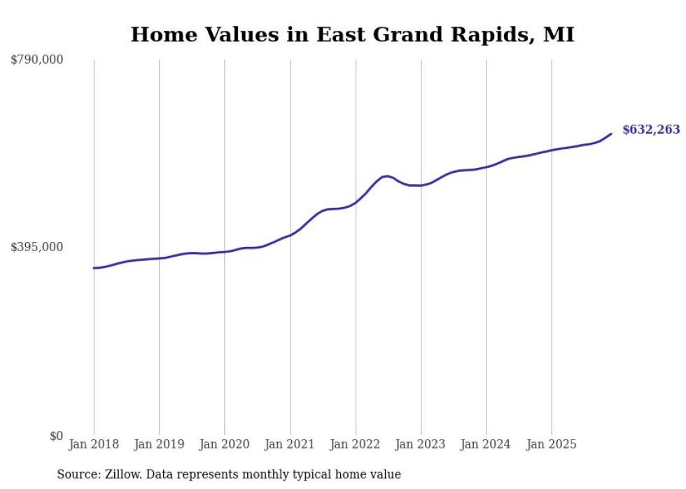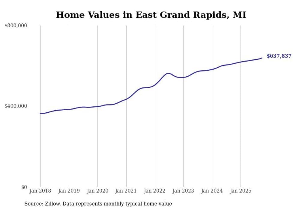 Stacker compiled a list of cities with the most expensive homes in the Grand Rapids metro area using data from Zillow. Charts show the monthly typical home value since January 2018. Data was available for 63 cities and towns.