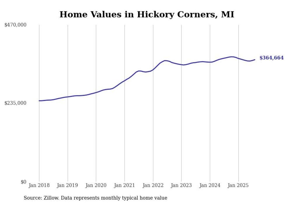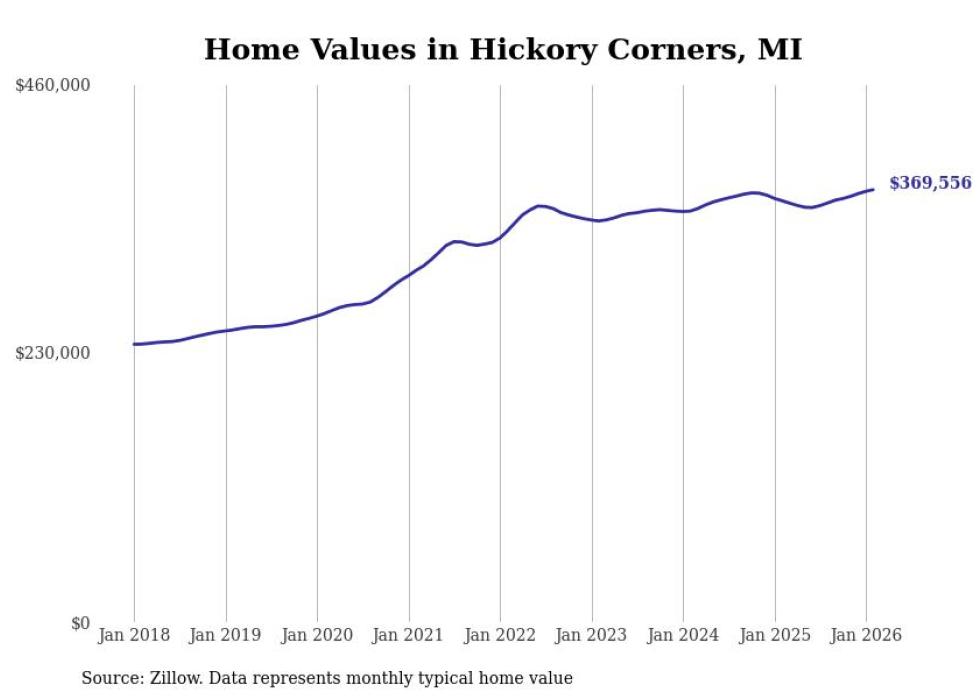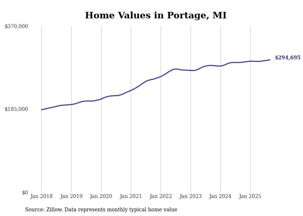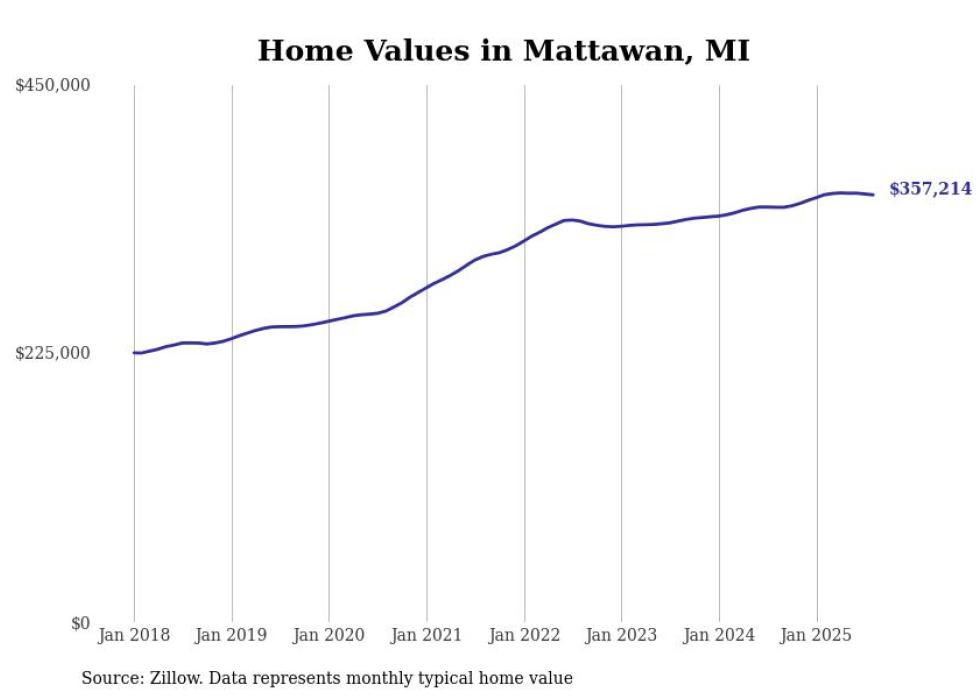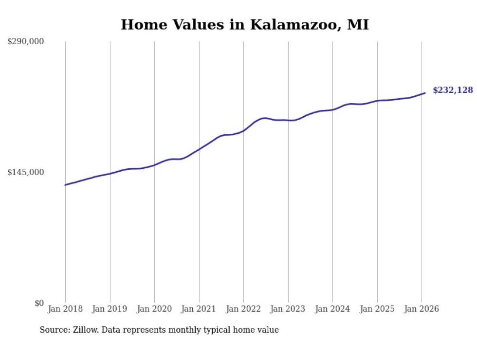 Stacker compiled a list of cities with the most expensive homes in the Kalamazoo metro area using data from Zillow. Charts show the monthly typical home value since January 2018. All 17 cities and towns with data available were included in the list.