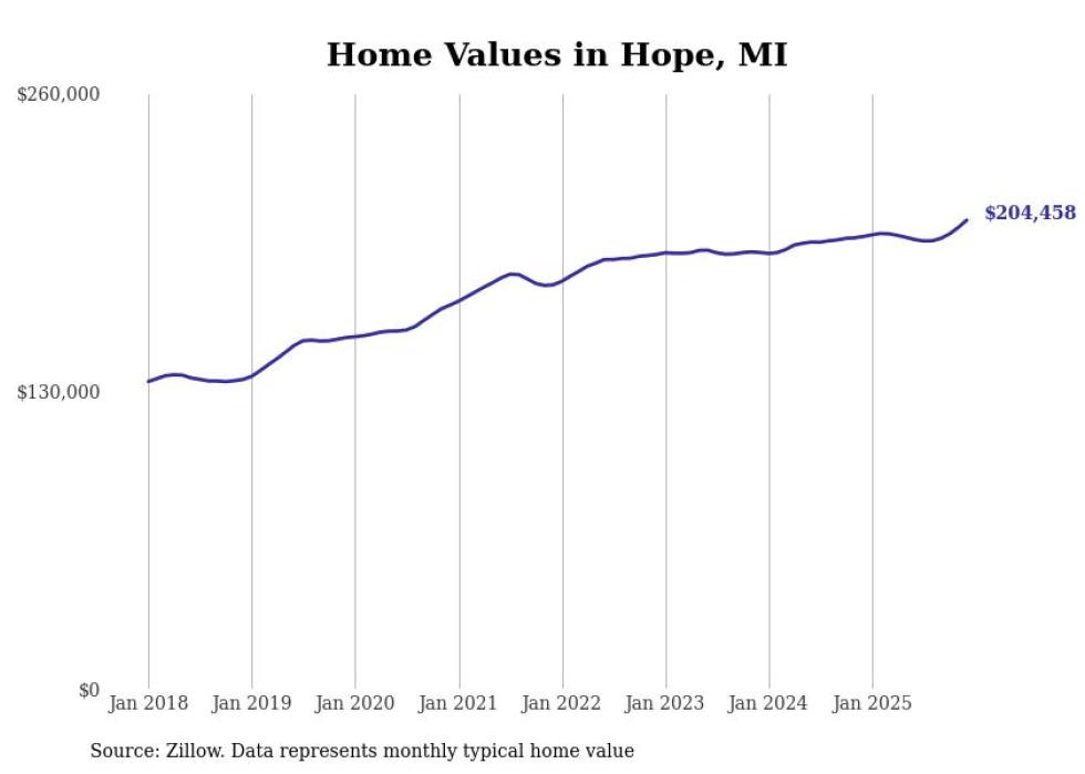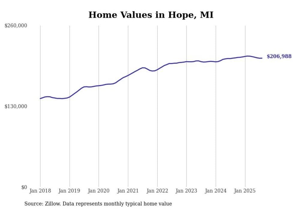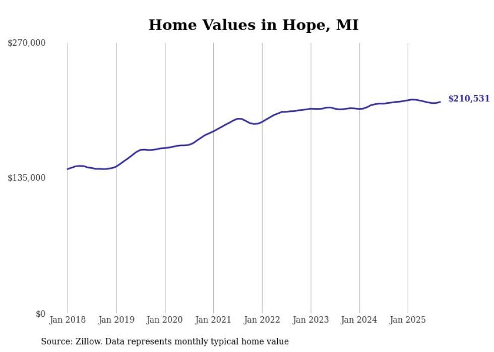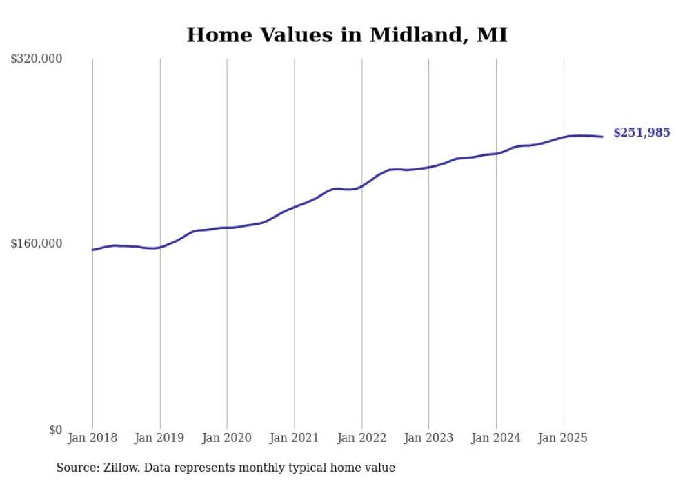 Stacker compiled a list of cities with the most expensive homes in the Midland, MI metro area using data from Zillow. Charts show the monthly typical home value since January 2018.