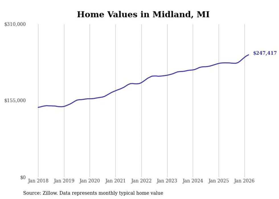Stacker compiled a list of cities with the most expensive homes in the Midland, Michigan metro area using data from Zillow. Charts show the monthly typical home value since January 2018. All 4 cities and towns with data available were included in the list.