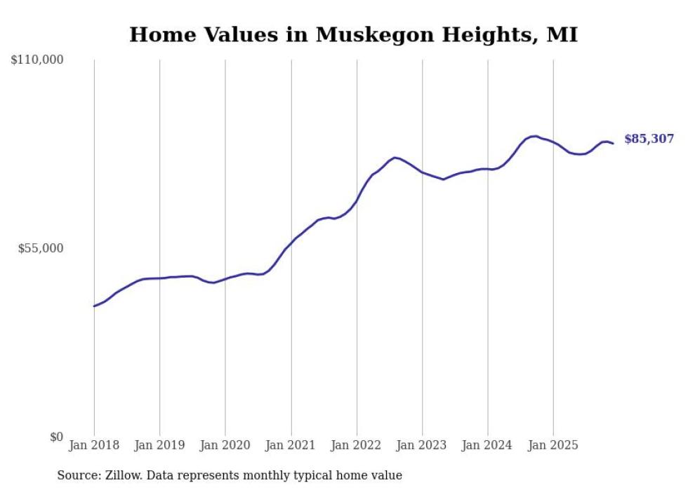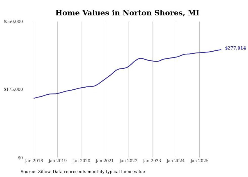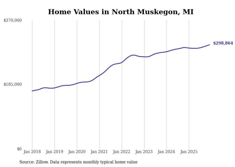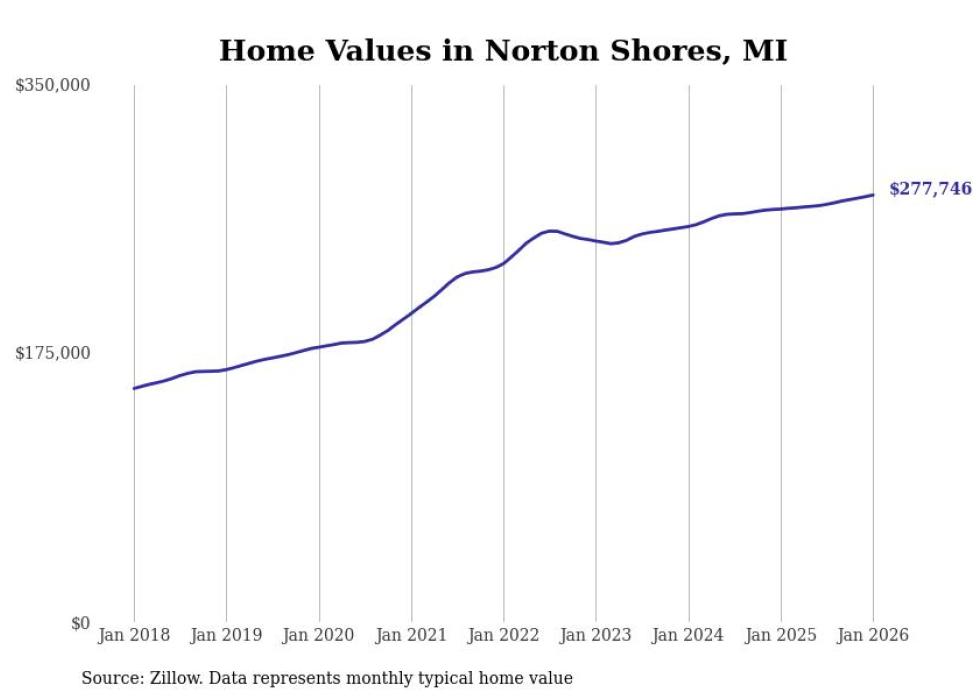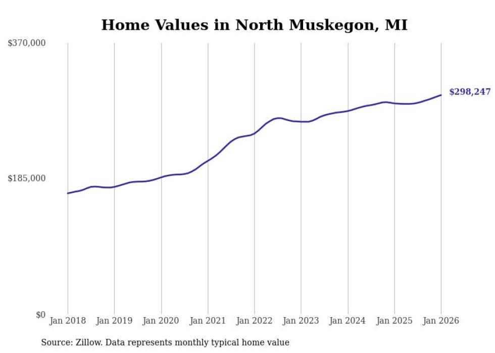 Stacker compiled a list of cities with the most expensive homes in the Muskegon metro area using data from Zillow. Charts show the monthly typical home value since January 2018. All 15 cities and towns with data available were included in the list.