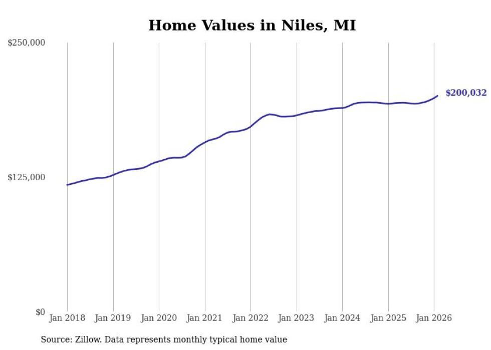 Stacker compiled a list of cities with the most expensive homes in the Niles metro area using data from Zillow. Charts show the monthly typical home value since January 2018. All 22 cities and towns with data available were included in the list.