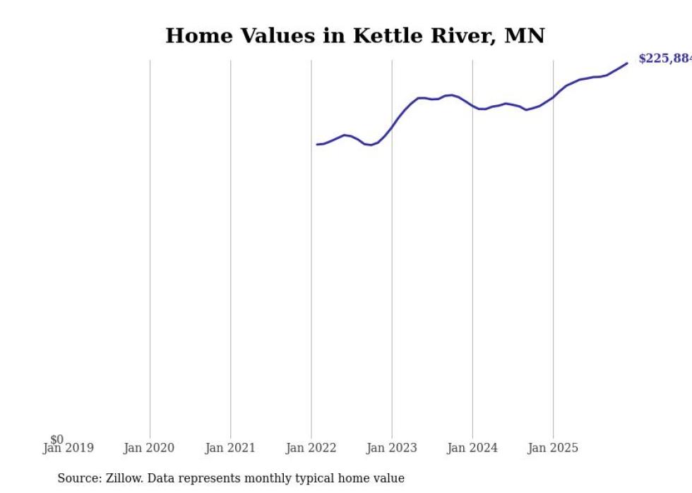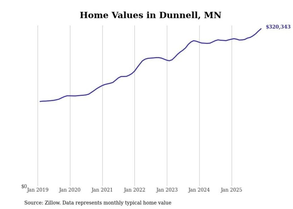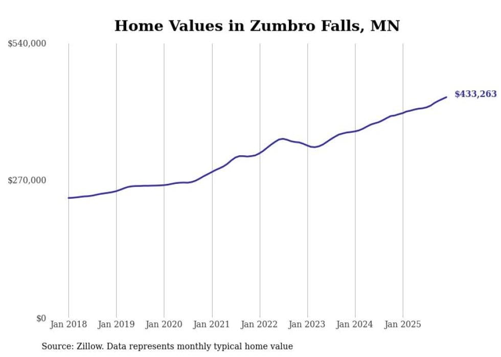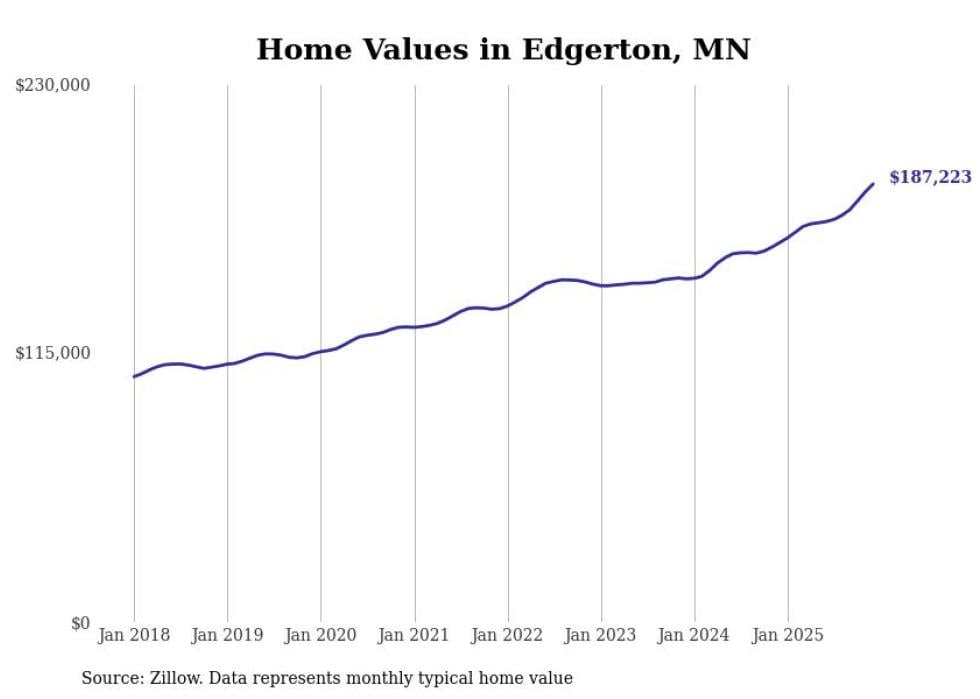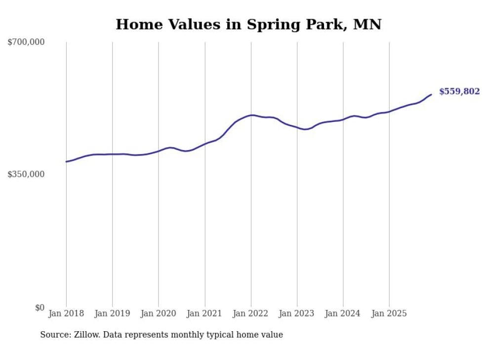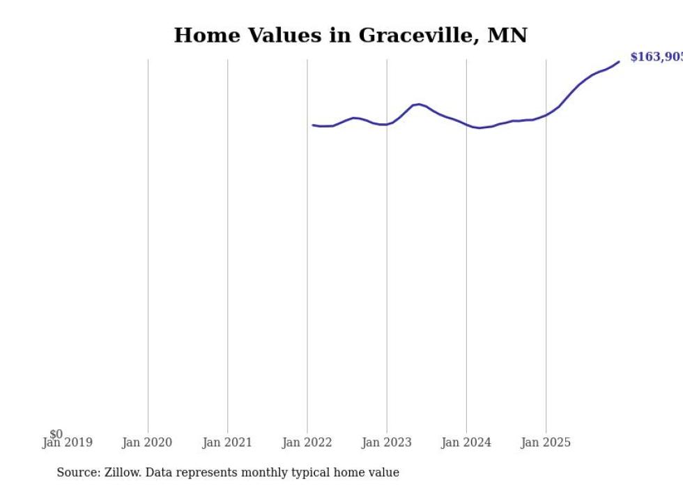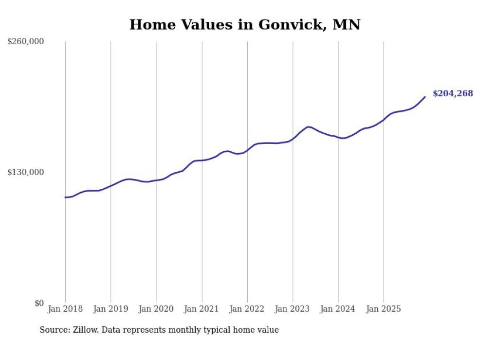 Stacker compiled a list of cities with the fastest-growing home prices in Minnesota using data from Zillow. Cities are ranked by the dollar change in the Zillow Home Values Index for all homes from the 12 months ending December 2025. The charts in this story were created automatically using Matplotlib. Data was available for 50 cities and towns in Minnesota.