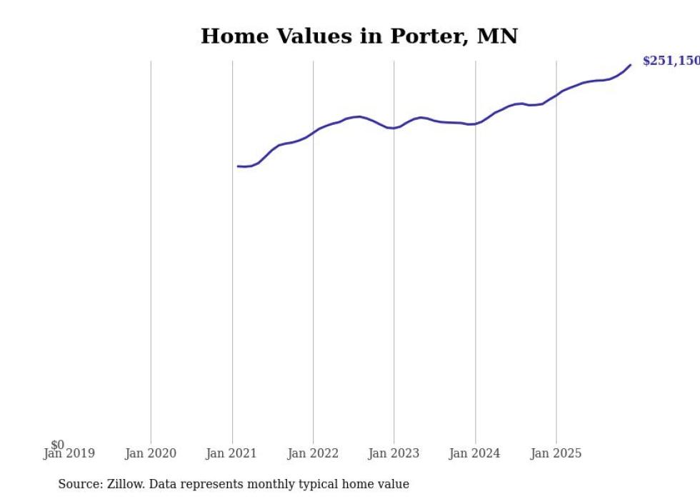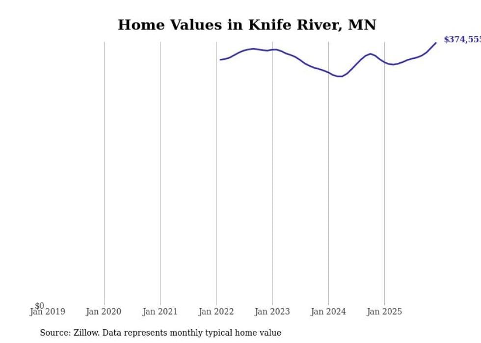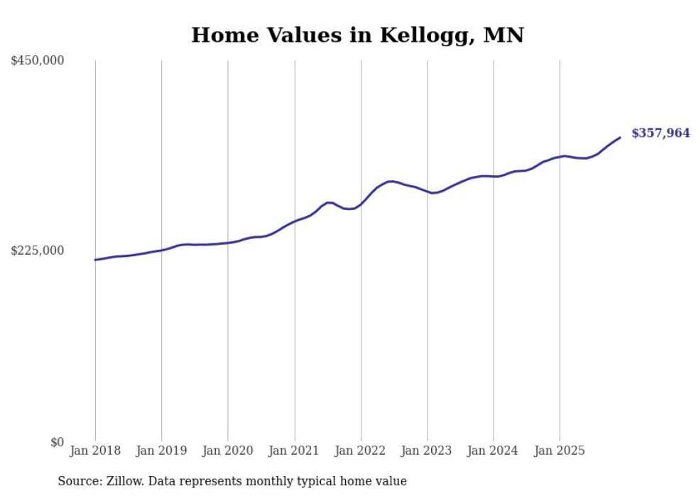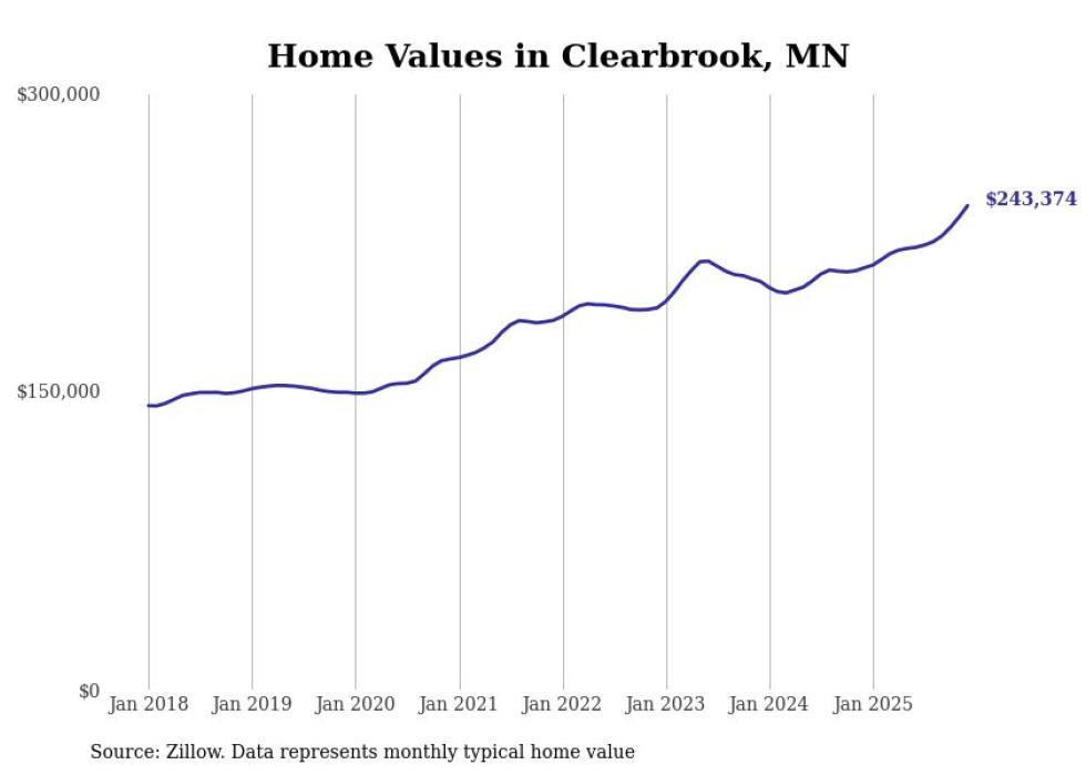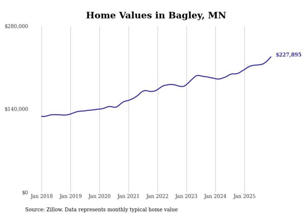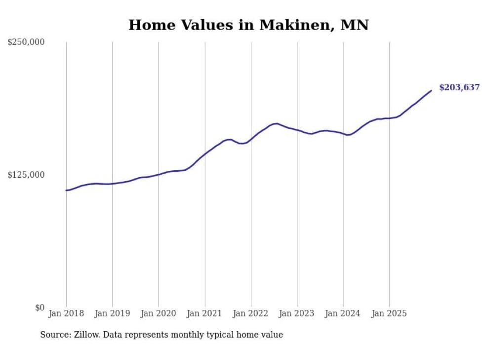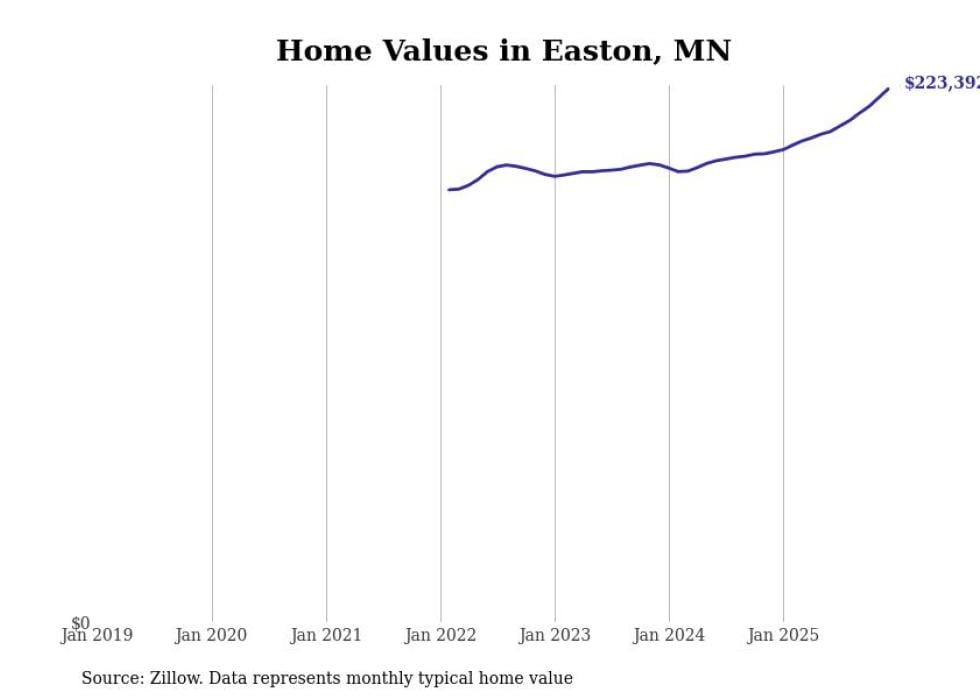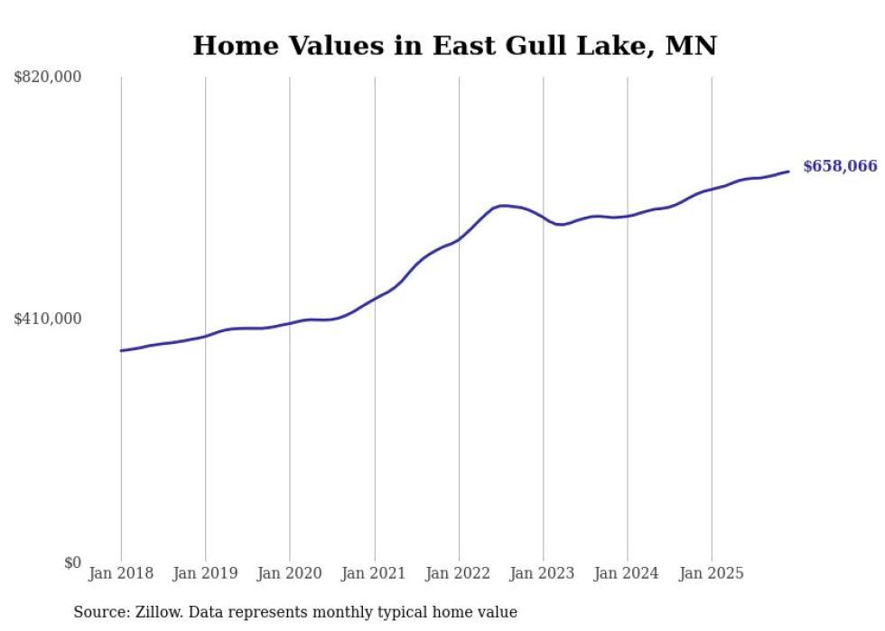Stacker compiled a list of cities with the fastest-growing home prices in Minnesota using data from Zillow. Cities are ranked by the dollar change in the Zillow Home Values Index for all homes from the 12 months ending December 2025. The charts in this story were created automatically using Matplotlib. Data was available for 50 cities and towns in Minnesota.
