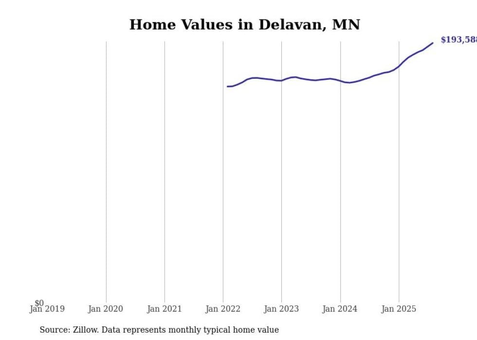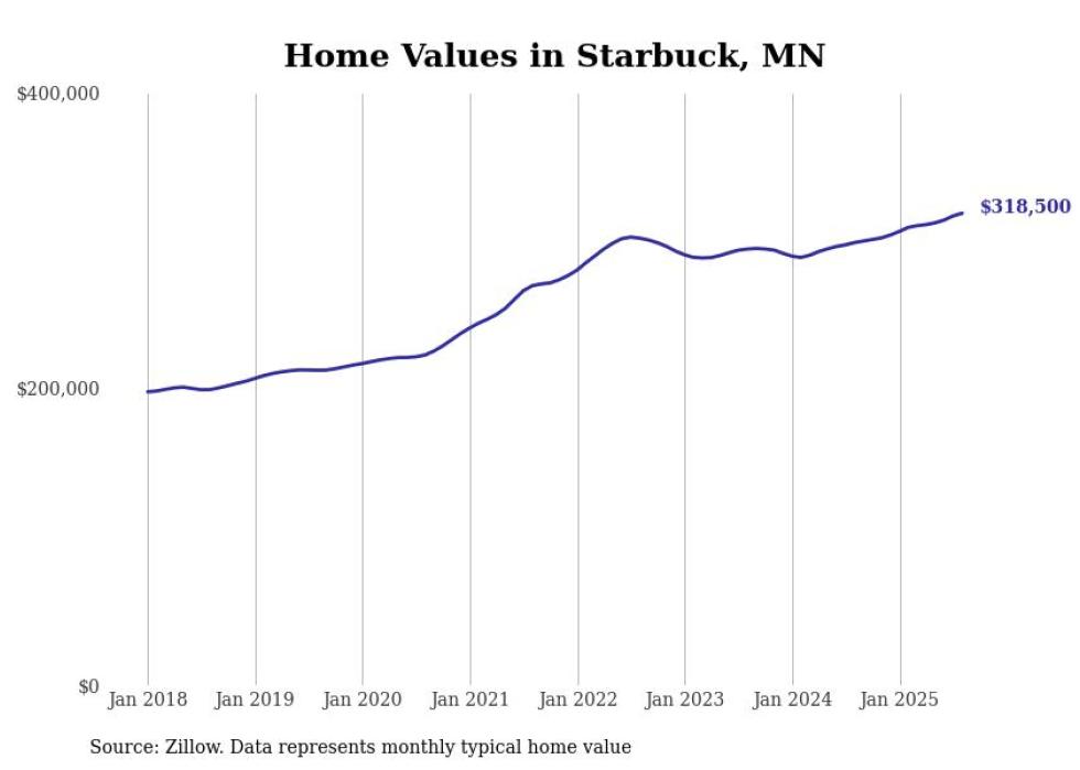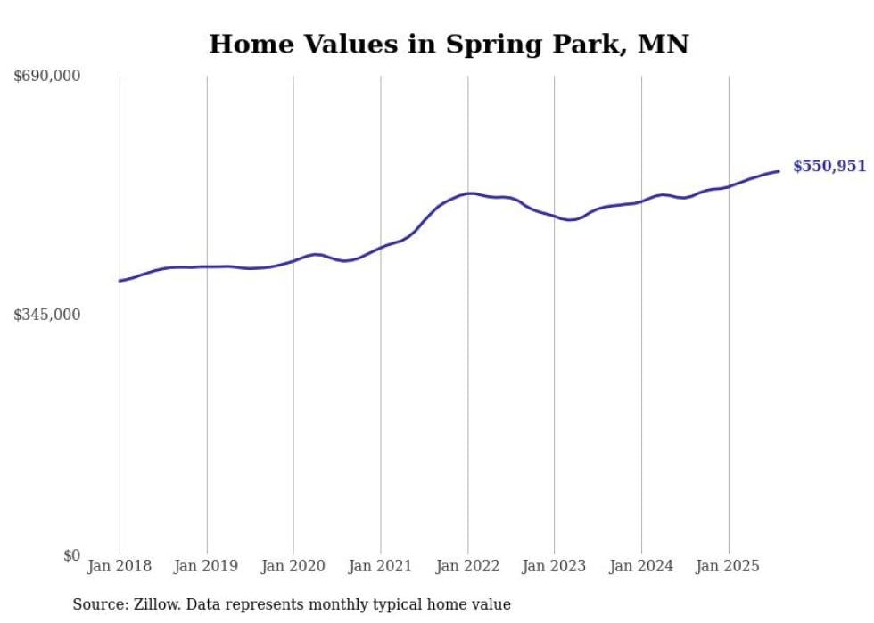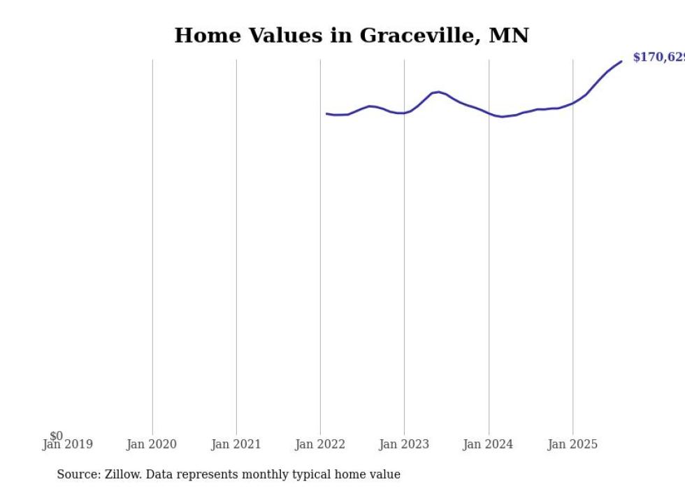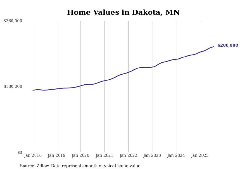 Stacker compiled a list of cities with the fastest-growing home prices in Minnesota using data from Zillow. Cities are ranked by the dollar change in the Zillow Home Values Index for all homes from the 12 months ending August 2025. The charts in this story were created automatically using Matplotlib. Data was available for 50 cities and towns in Minnesota.