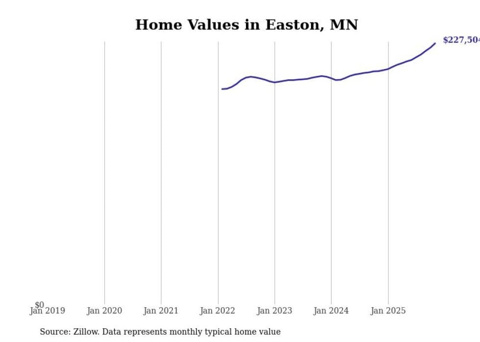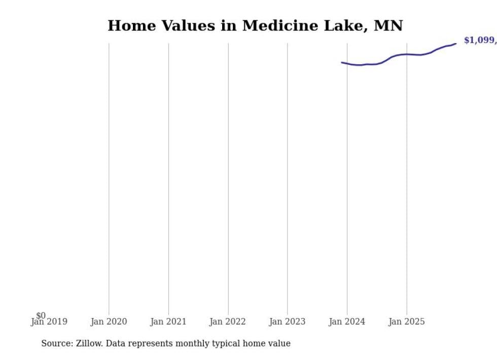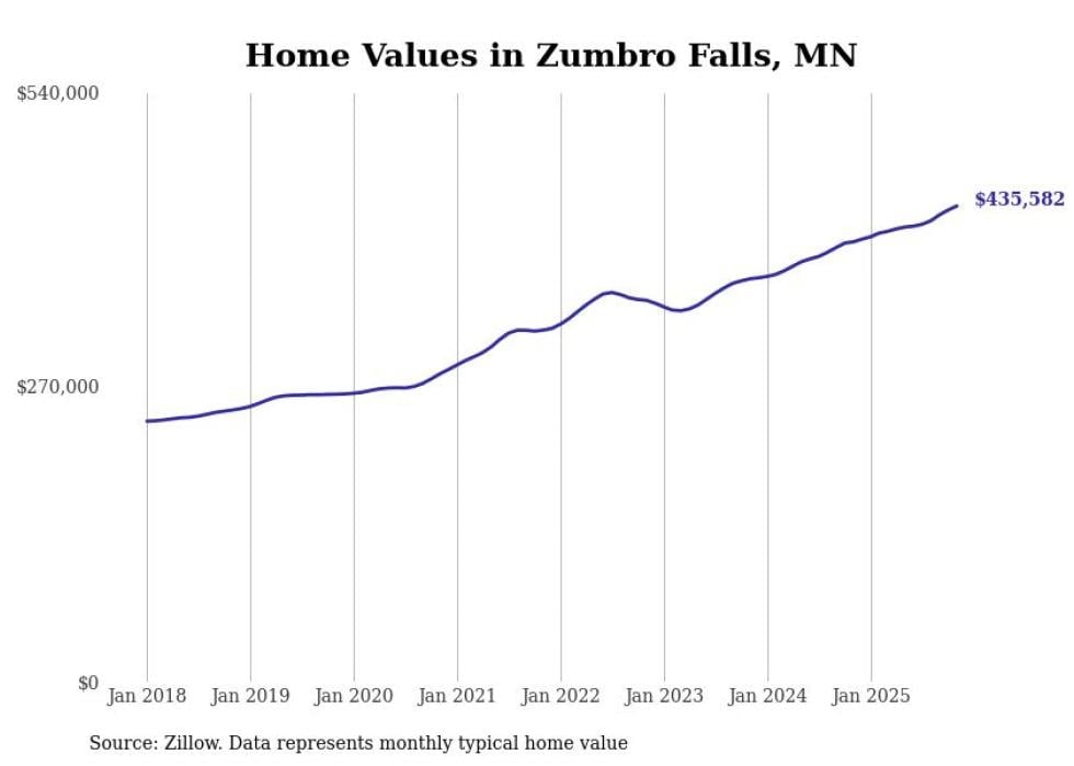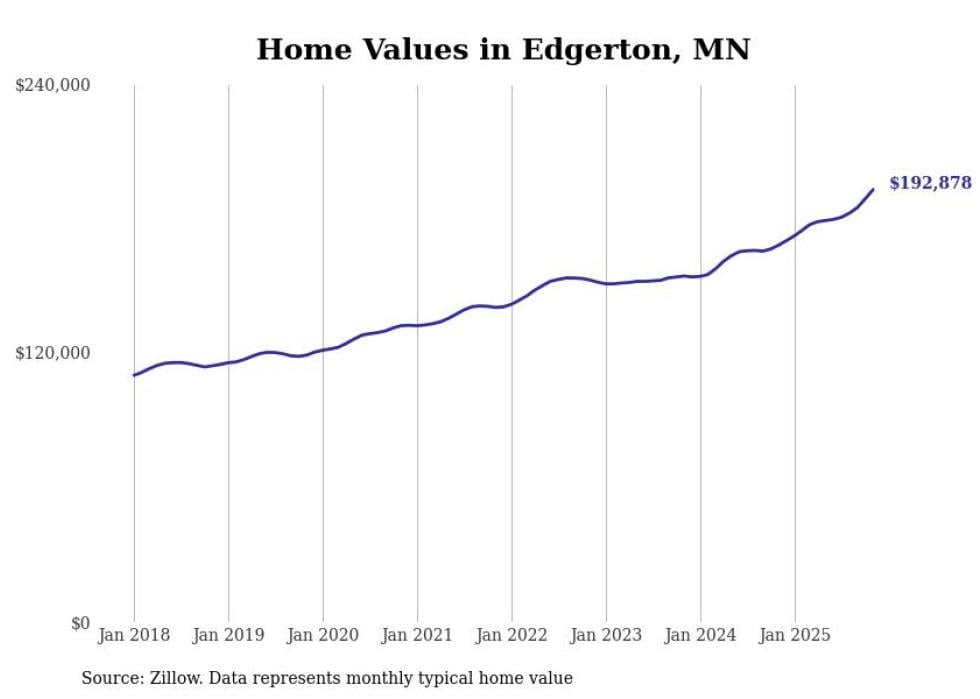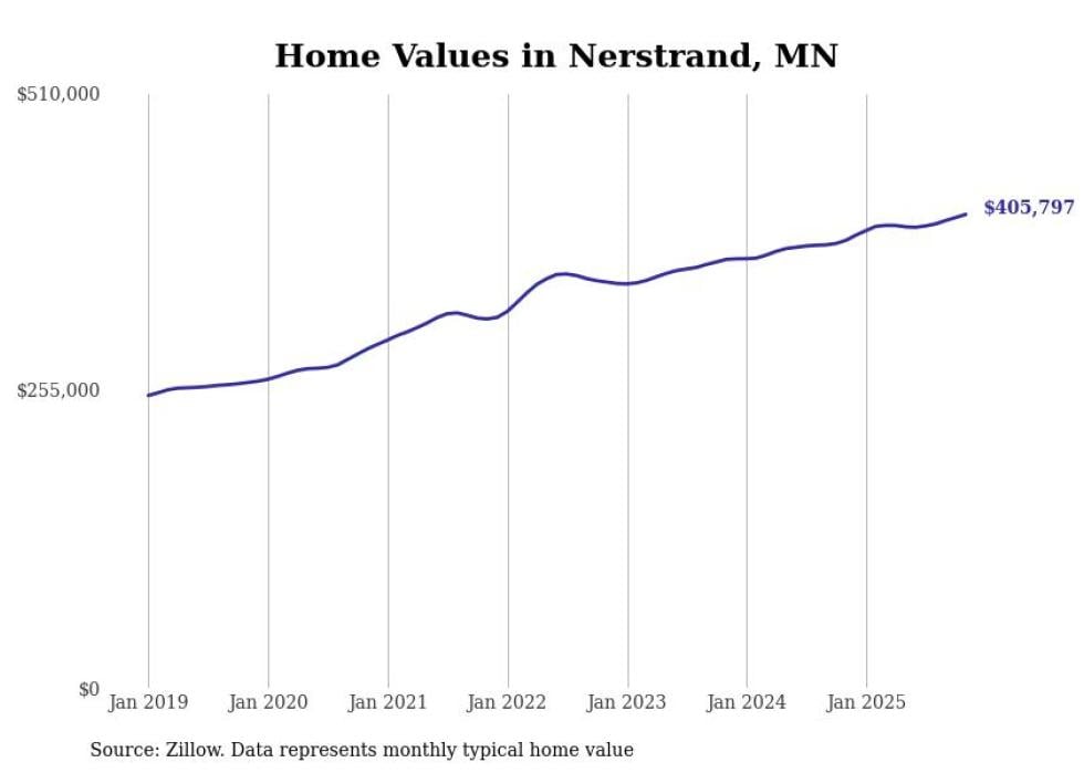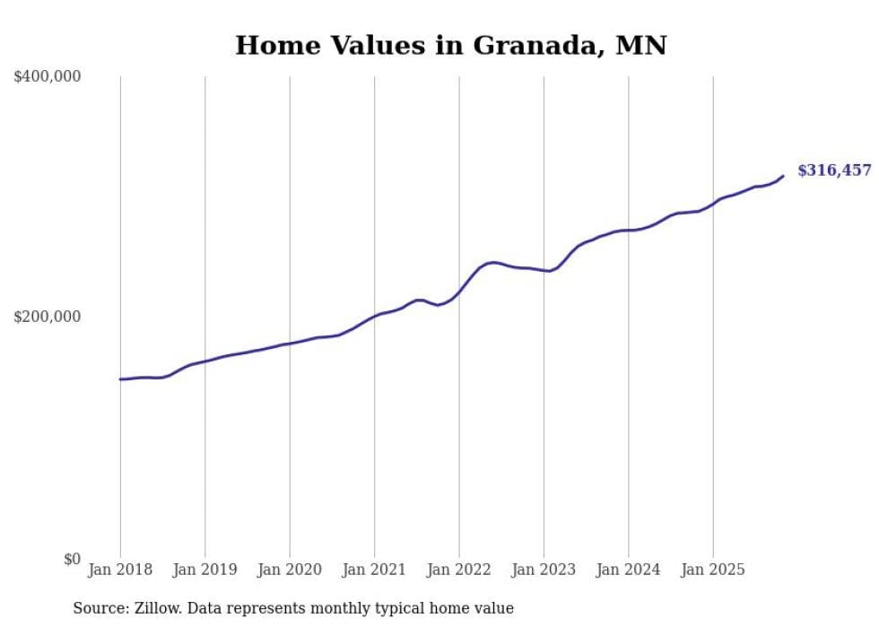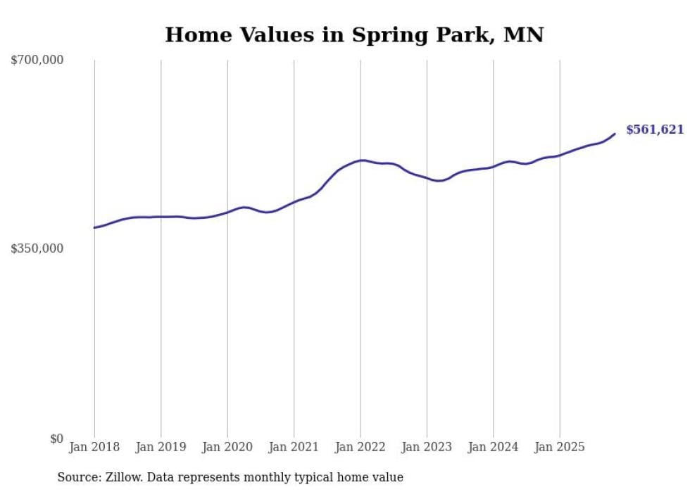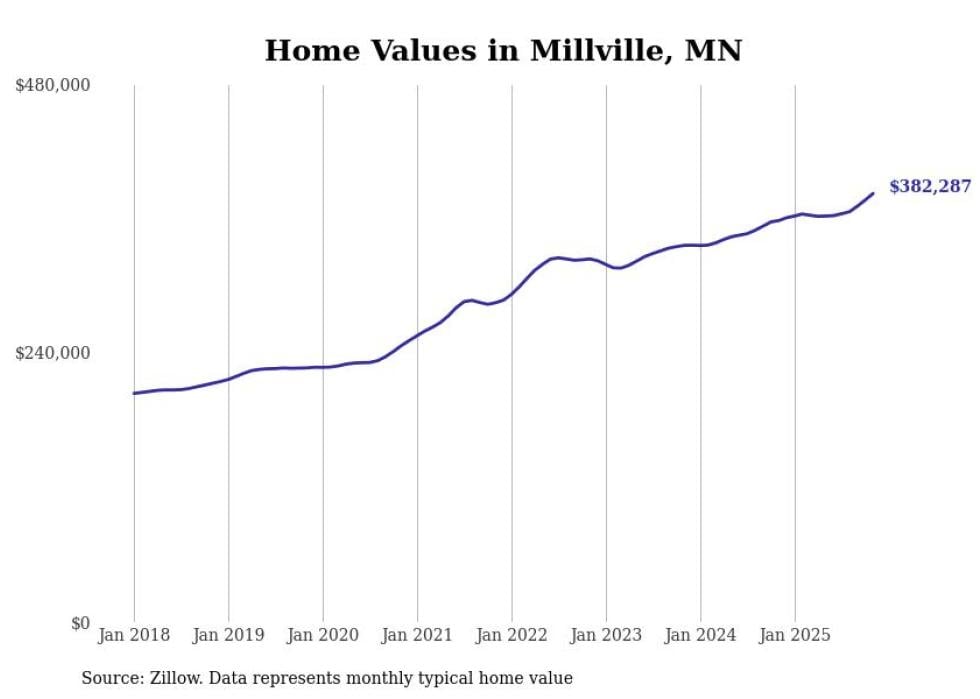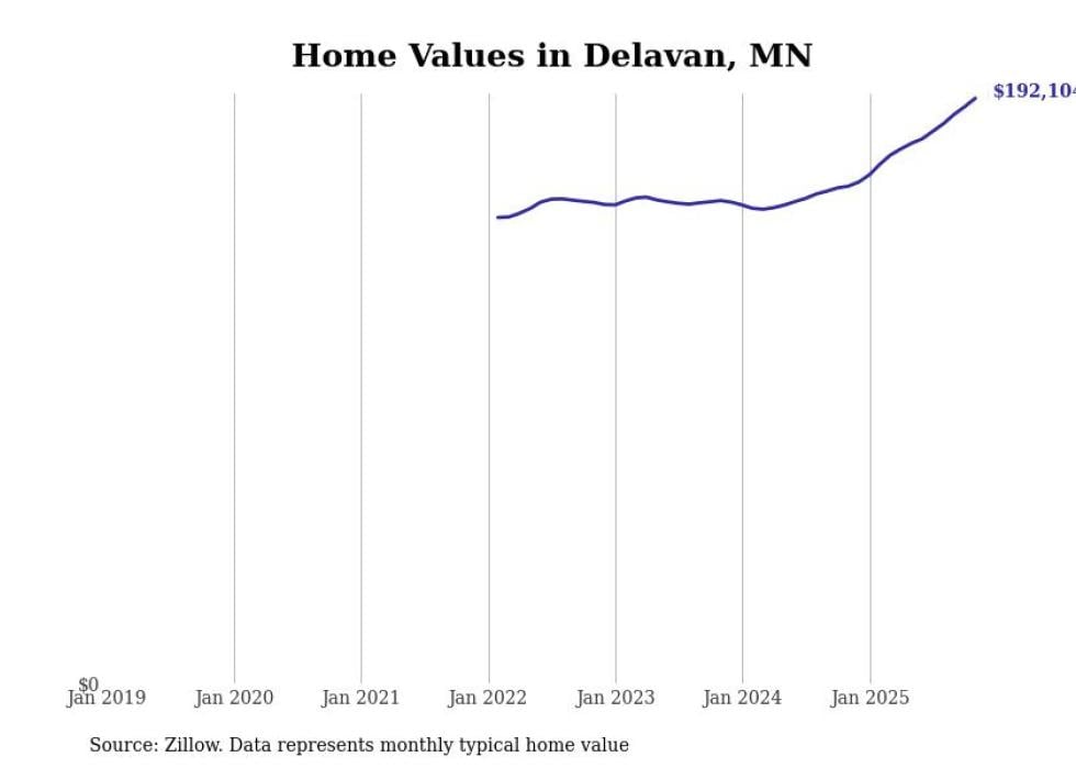 Stacker compiled a list of cities with the fastest-growing home prices in Minnesota using data from Zillow. Cities are ranked by the dollar change in the Zillow Home Values Index for all homes from the 12 months ending November 2025. The charts in this story were created automatically using Matplotlib. Data was available for 50 cities and towns in Minnesota.