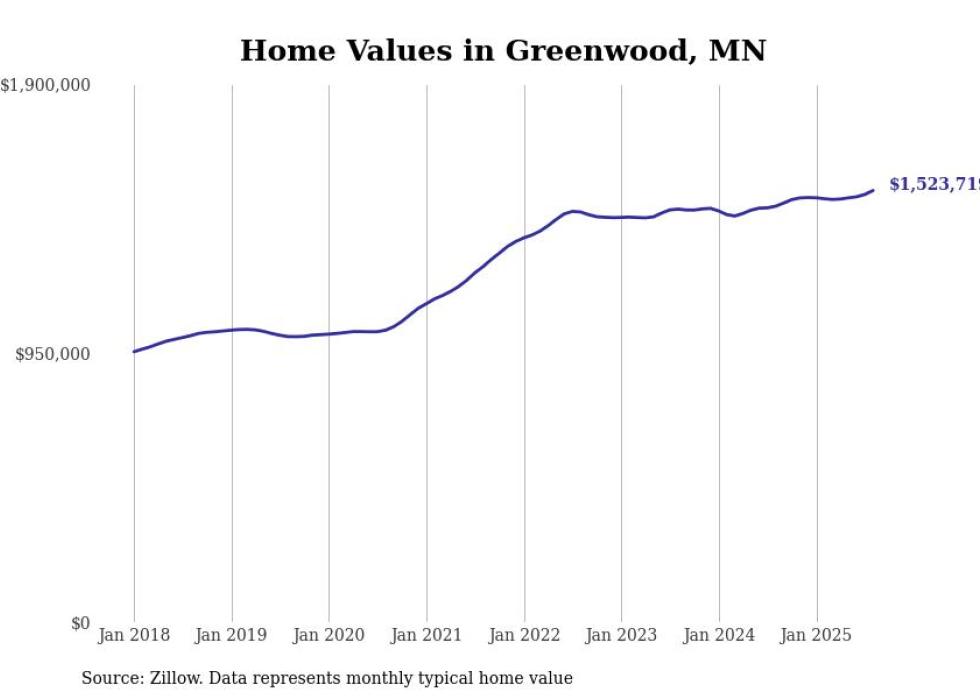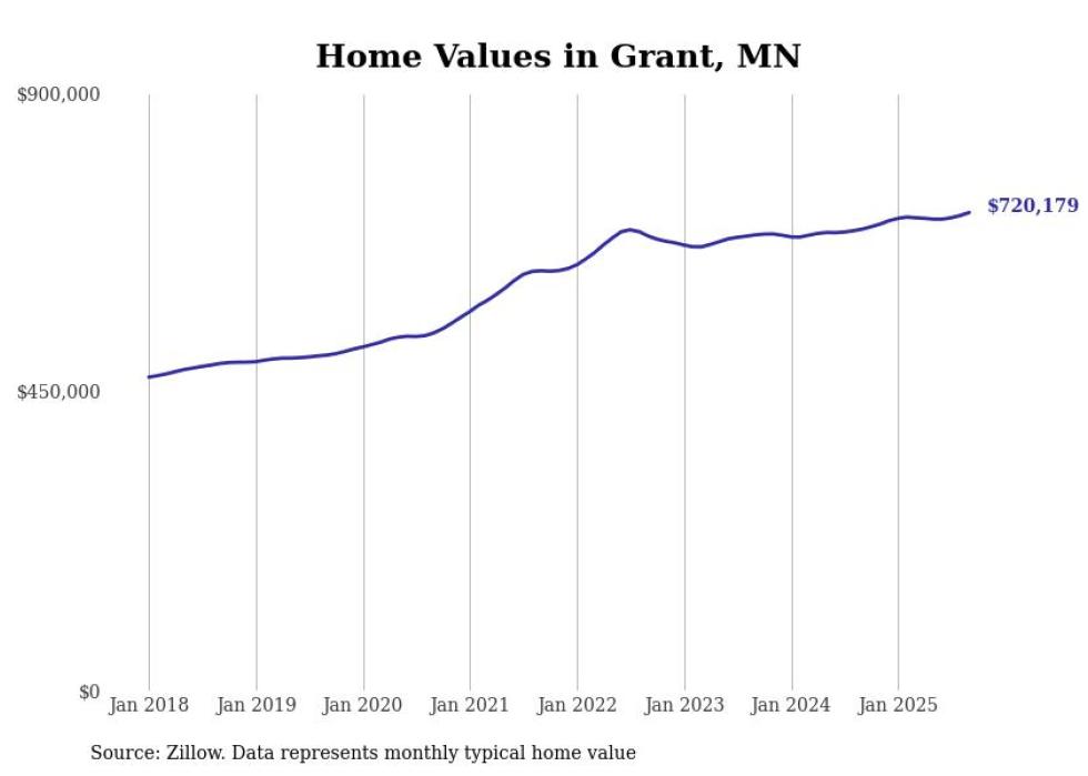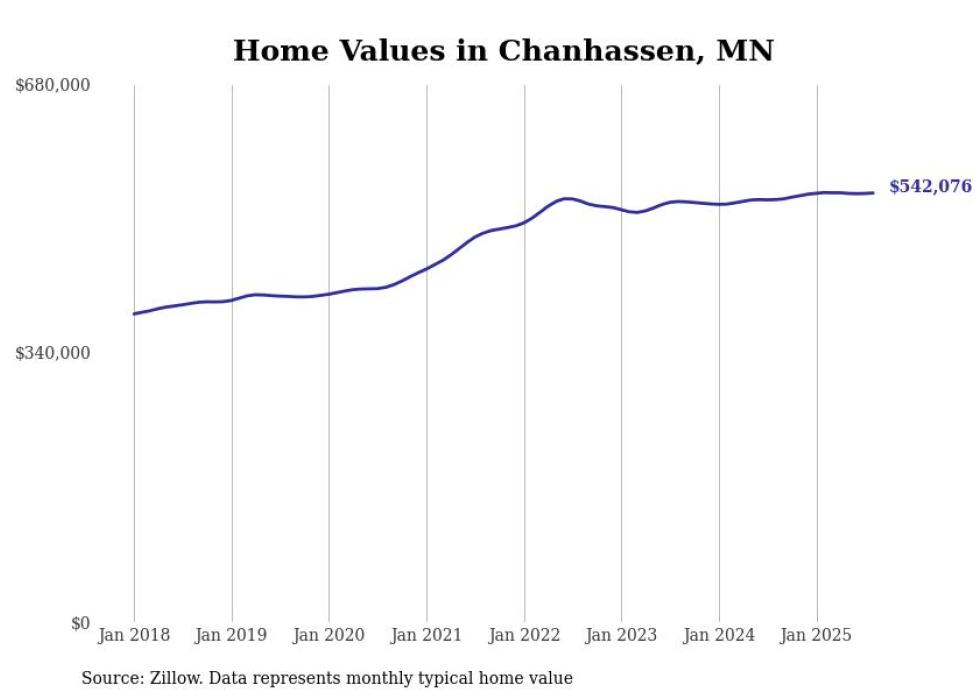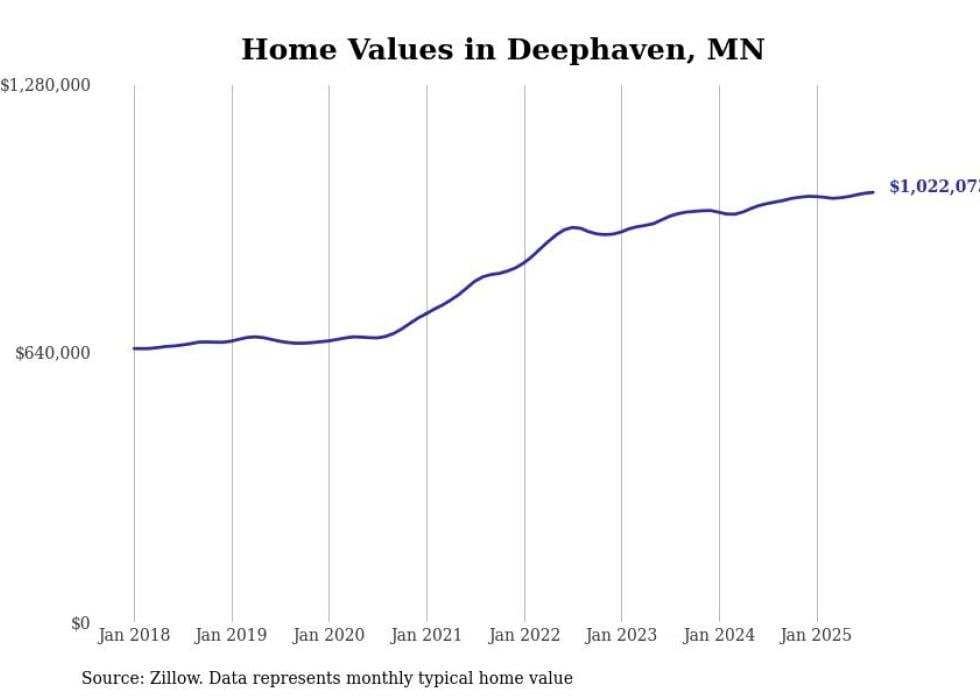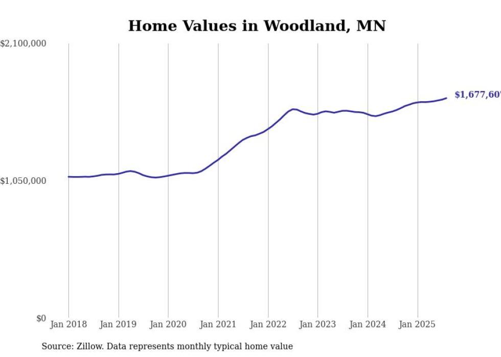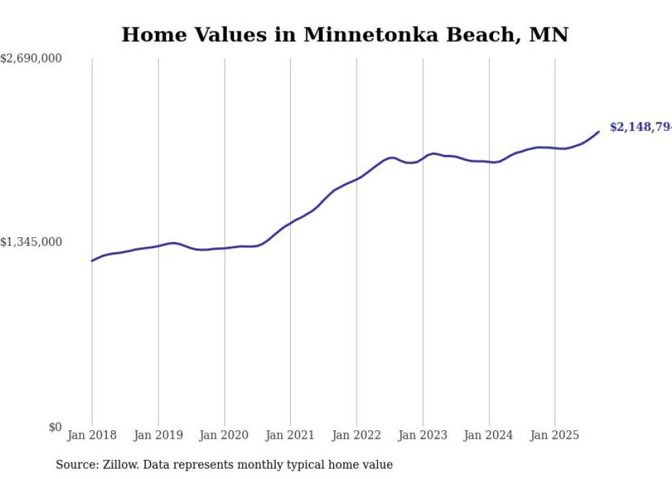 Stacker compiled a list of cities with the most expensive homes in the Minneapolis metro area using data from Zillow. Charts show the monthly typical home value since January 2018. Data was available for 206 cities and towns.