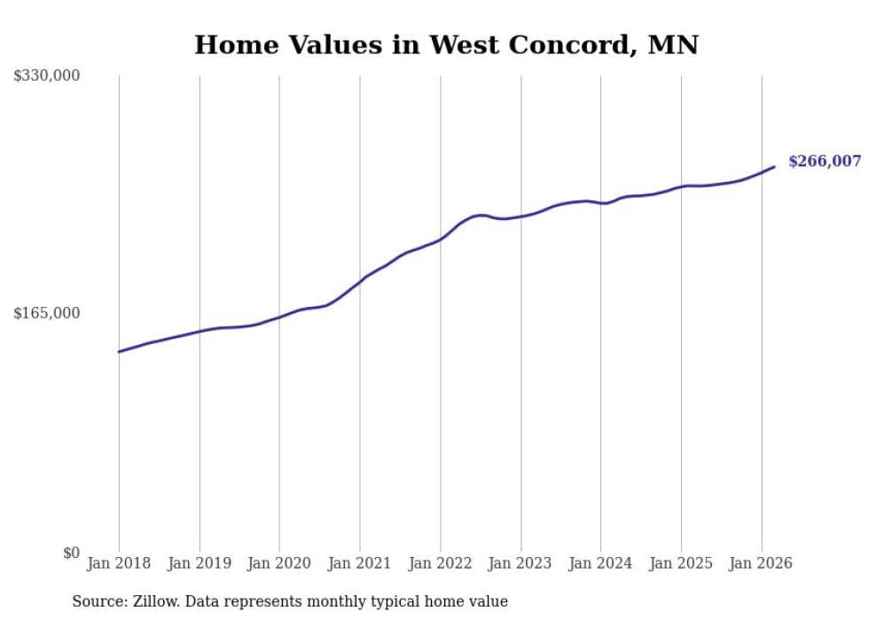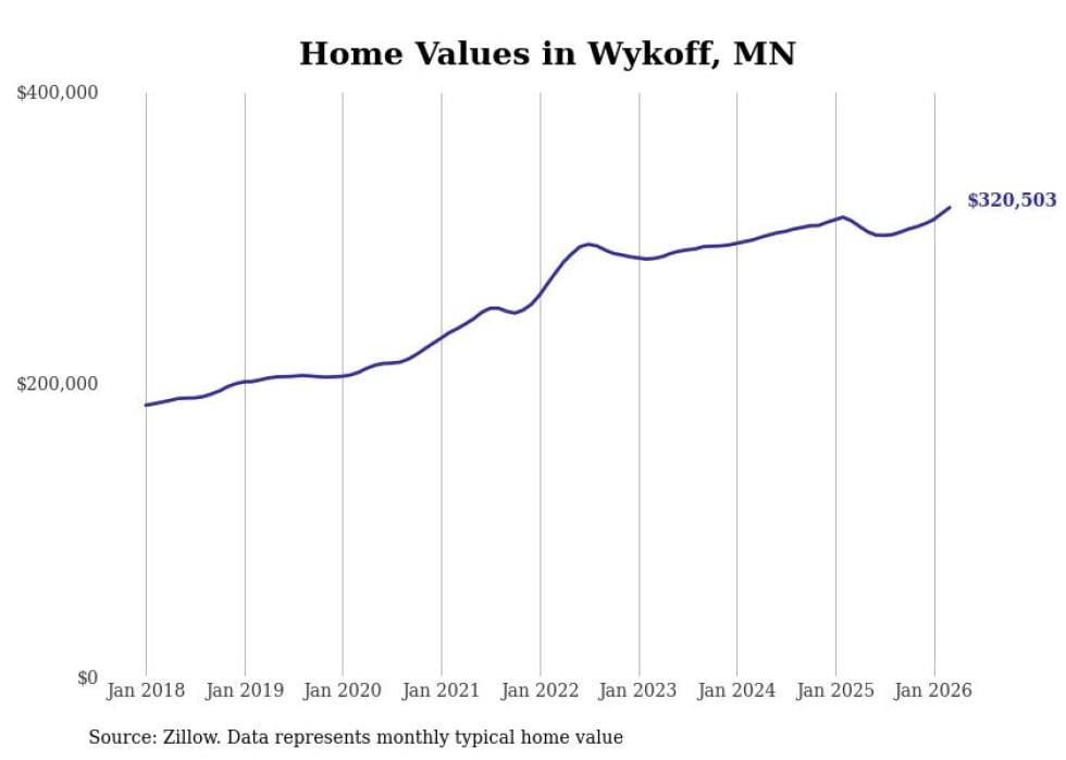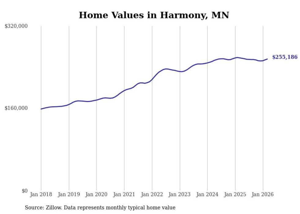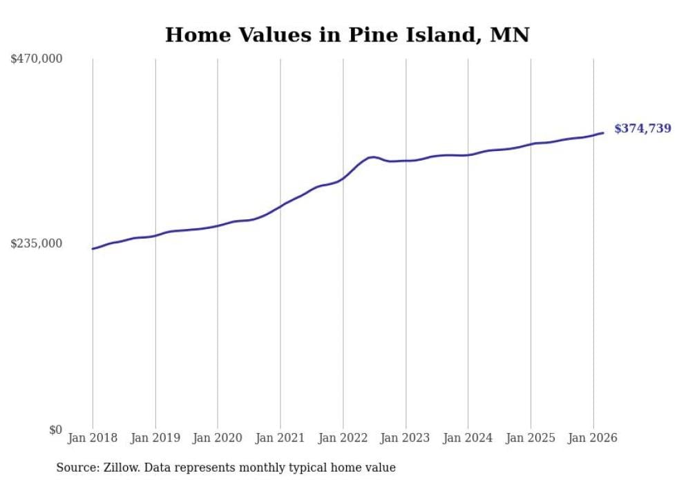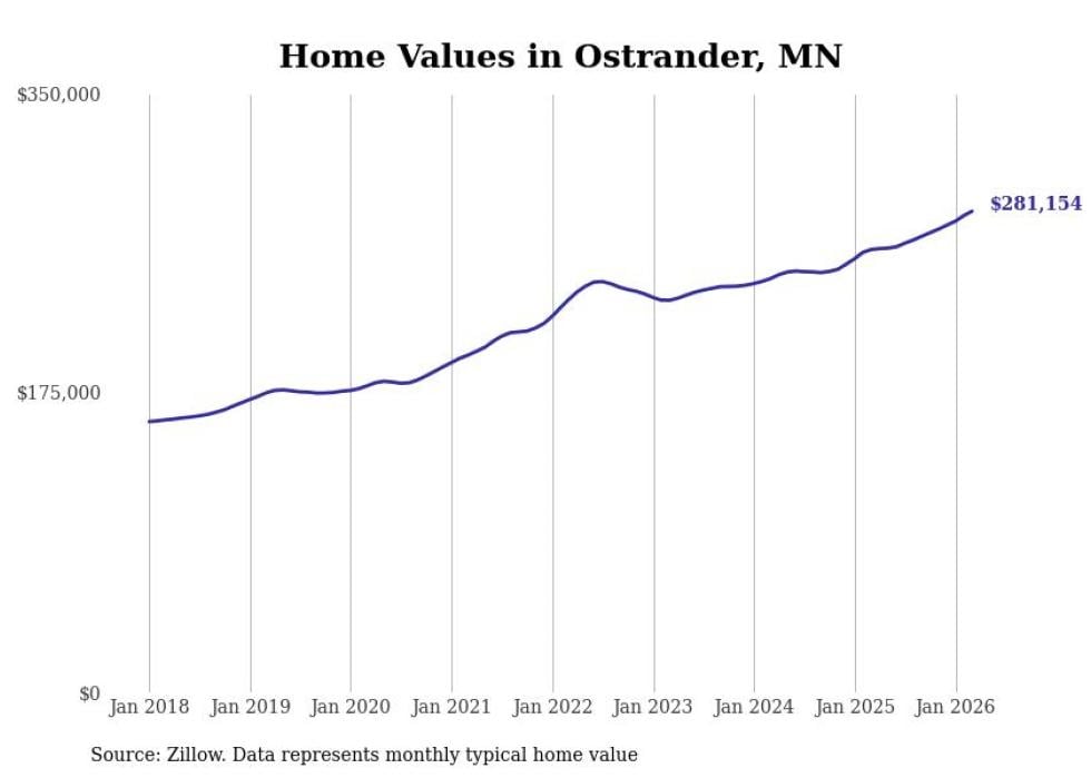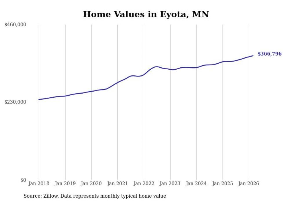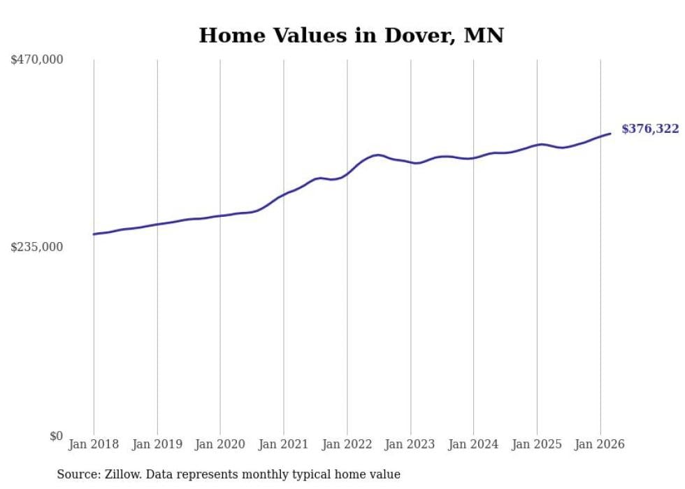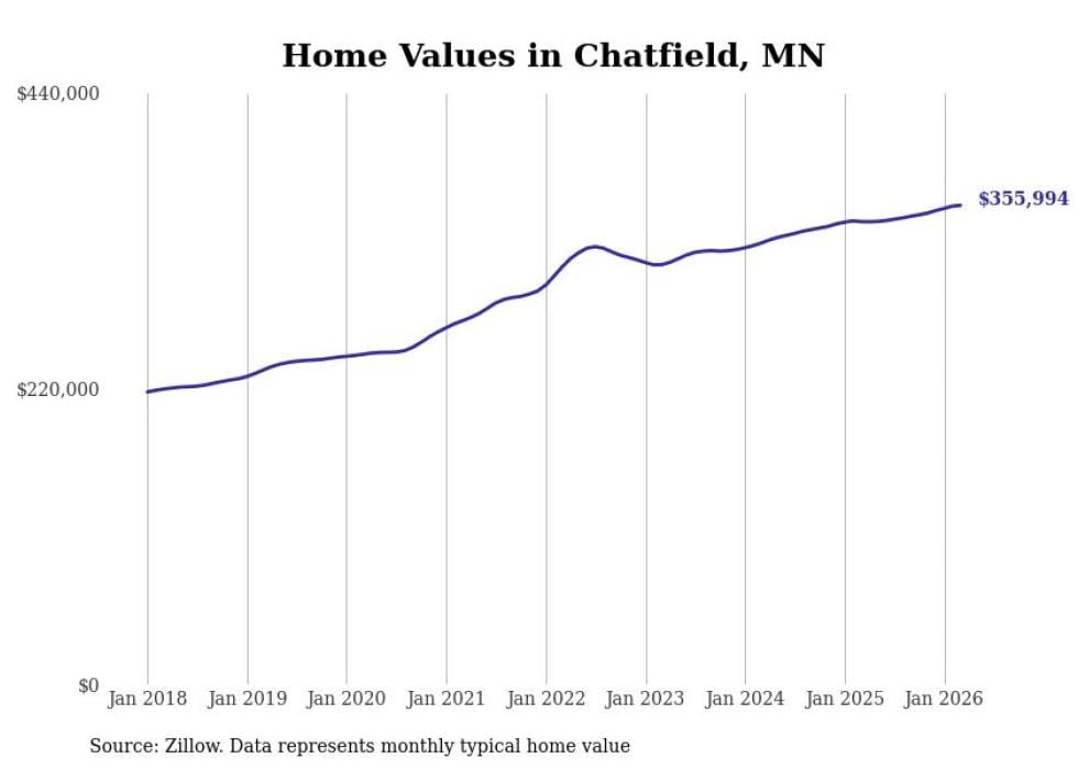 Stacker compiled a list of cities with the most expensive homes in the Rochester, Minnesota metro area using data from Zillow. Charts show the monthly typical home value since January 2018. Data was available for 34 cities and towns.