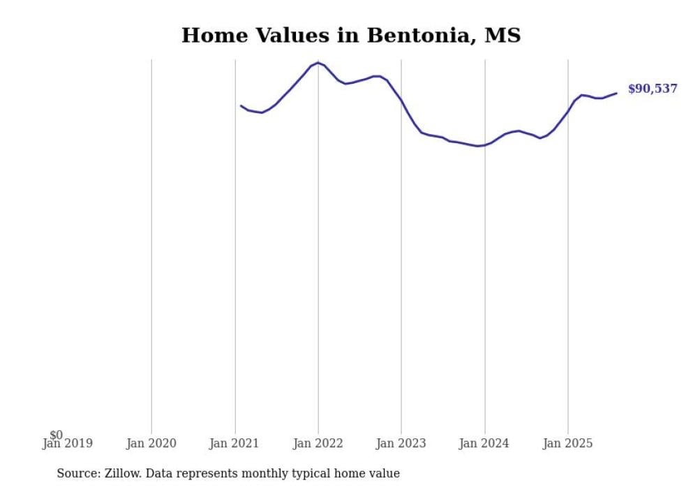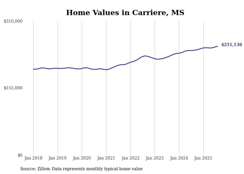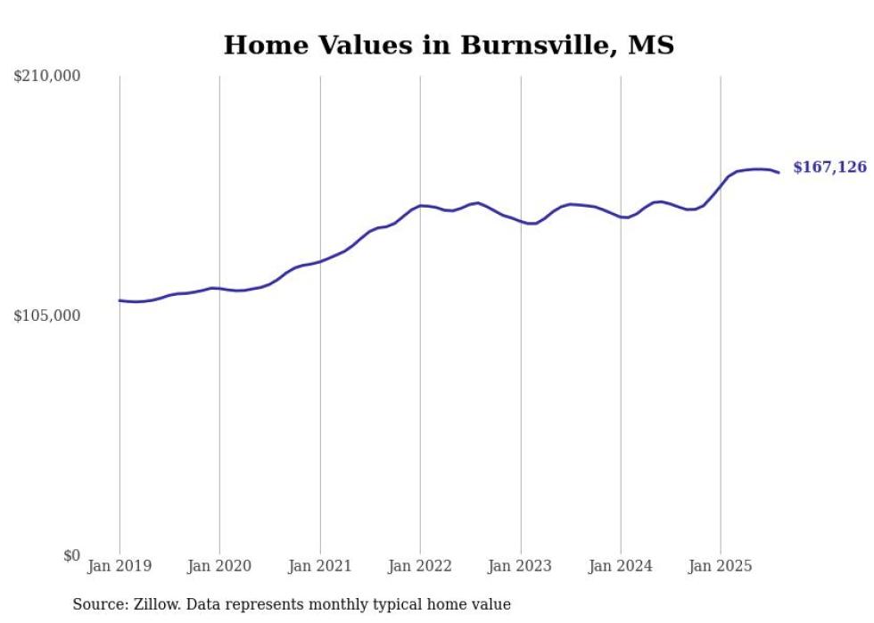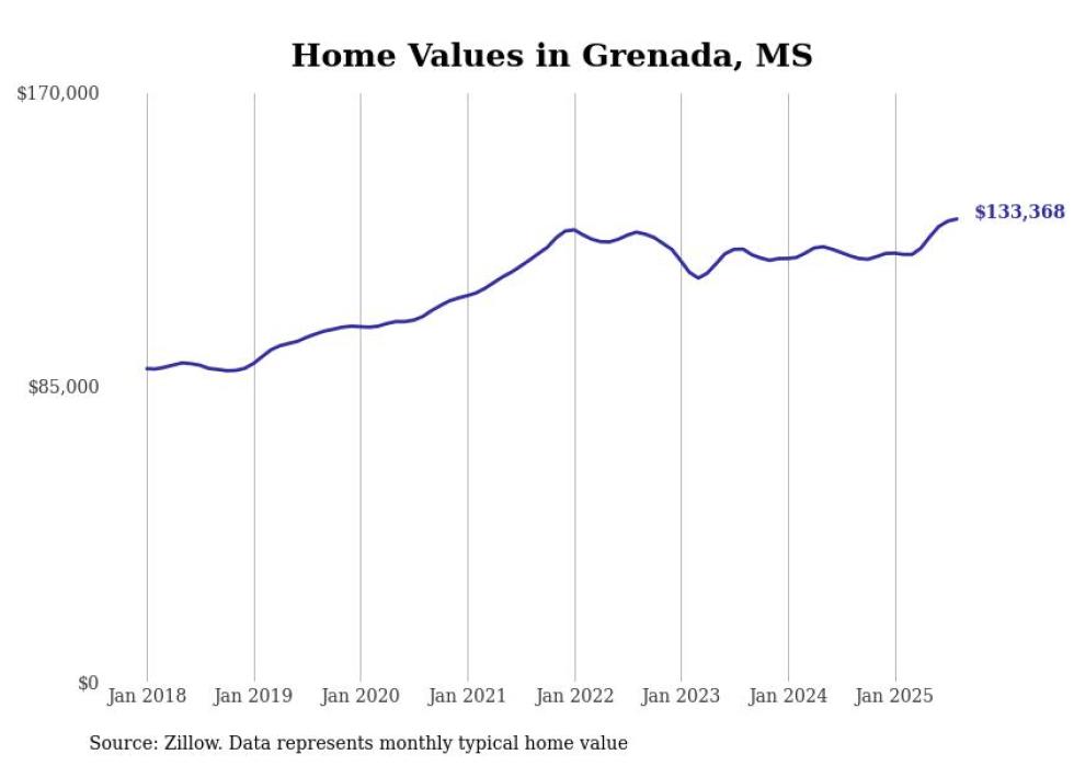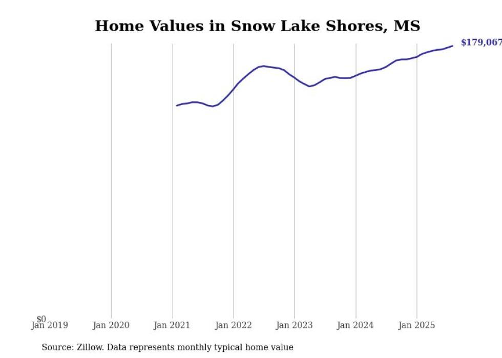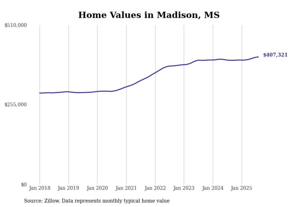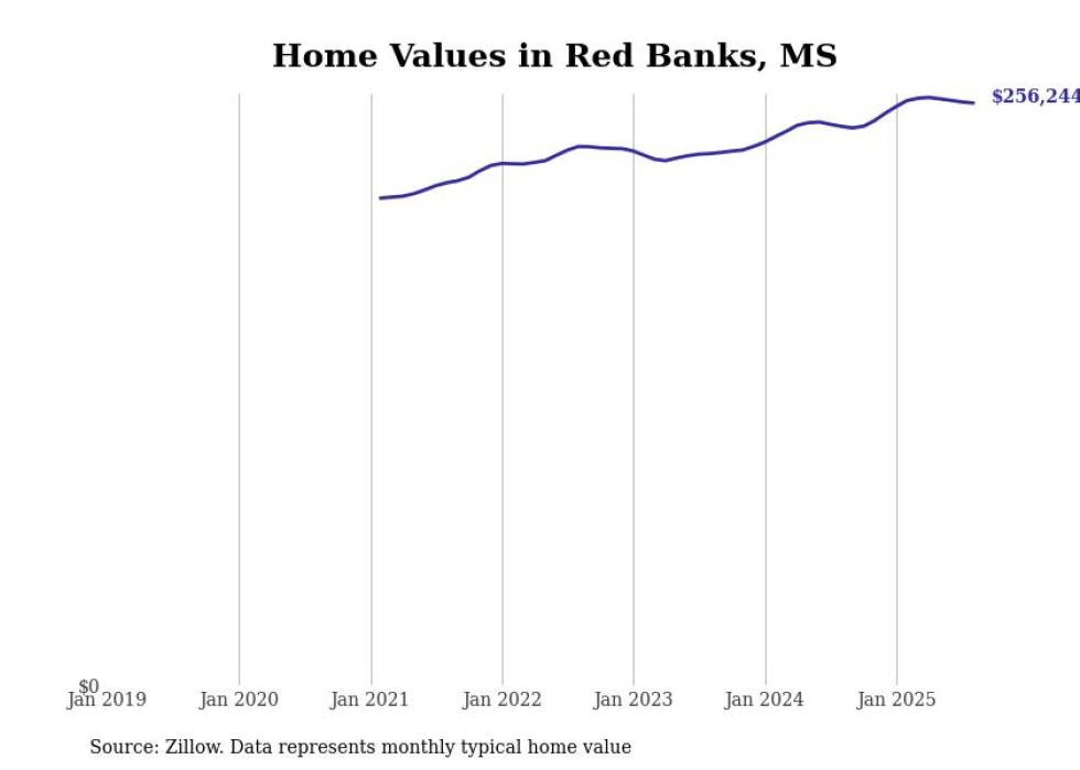 Stacker compiled a list of cities with the fastest-growing home prices in Mississippi using data from Zillow. Cities are ranked by the dollar change in the Zillow Home Values Index for all homes from the 12 months ending August 2025. The charts in this story were created automatically using Matplotlib. Data was available for 50 cities and towns in Mississippi.