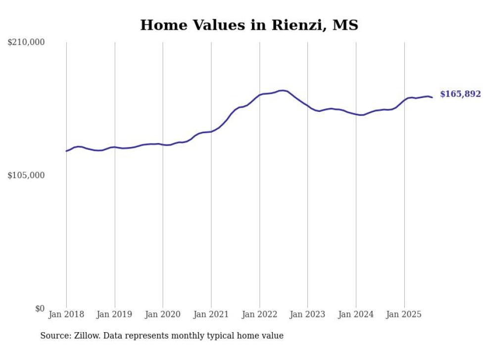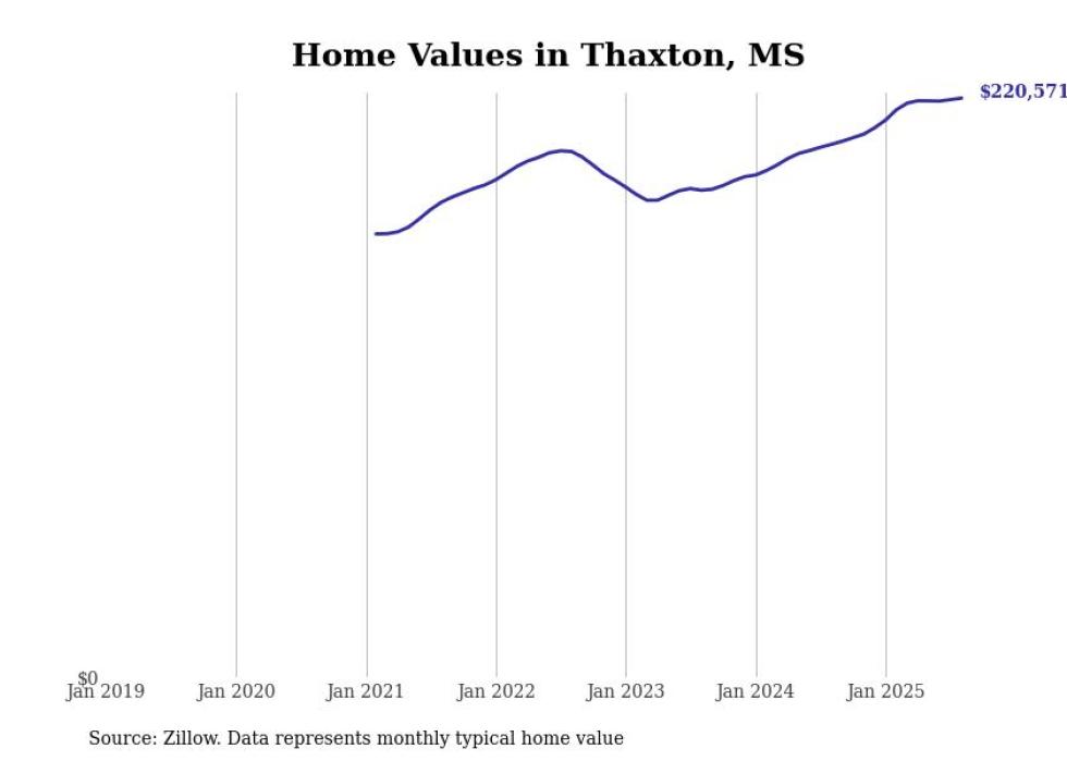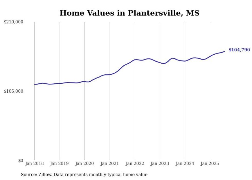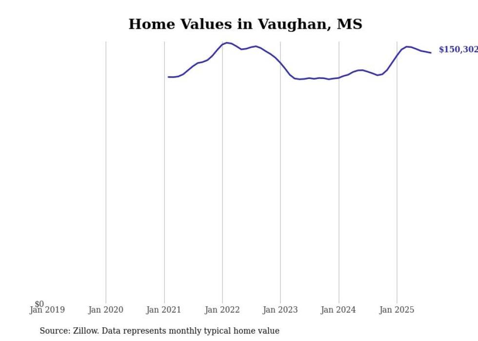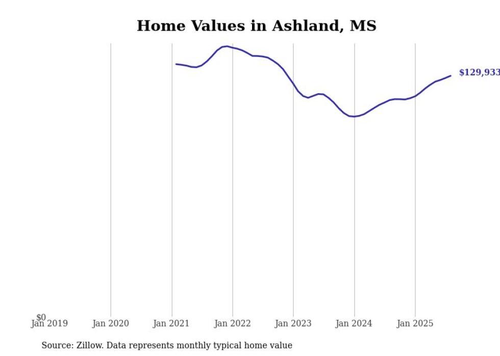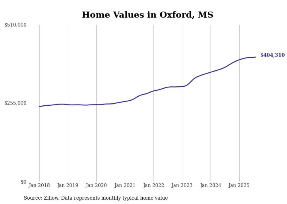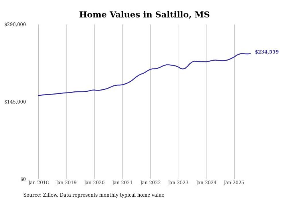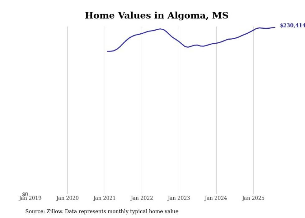 Stacker compiled a list of cities with the fastest-growing home prices in Mississippi using data from Zillow. Cities are ranked by the dollar change in the Zillow Home Values Index for all homes from the 12 months ending August 2025. The charts in this story were created automatically using Matplotlib. Data was available for 50 cities and towns in Mississippi.
