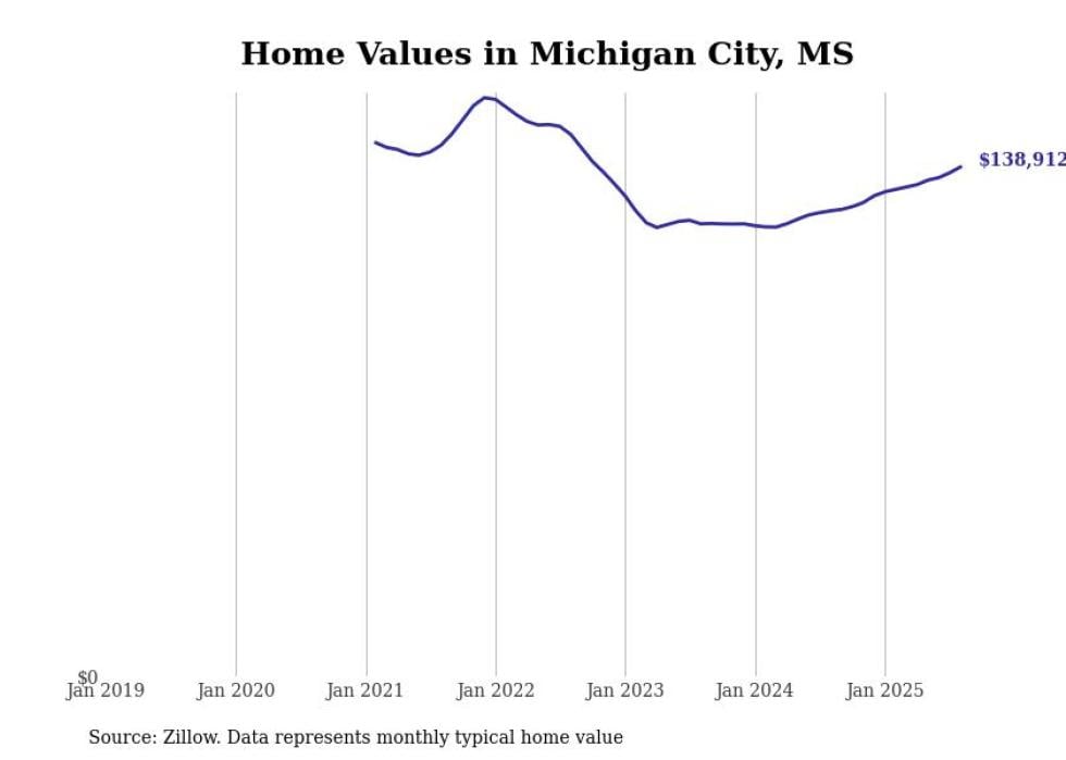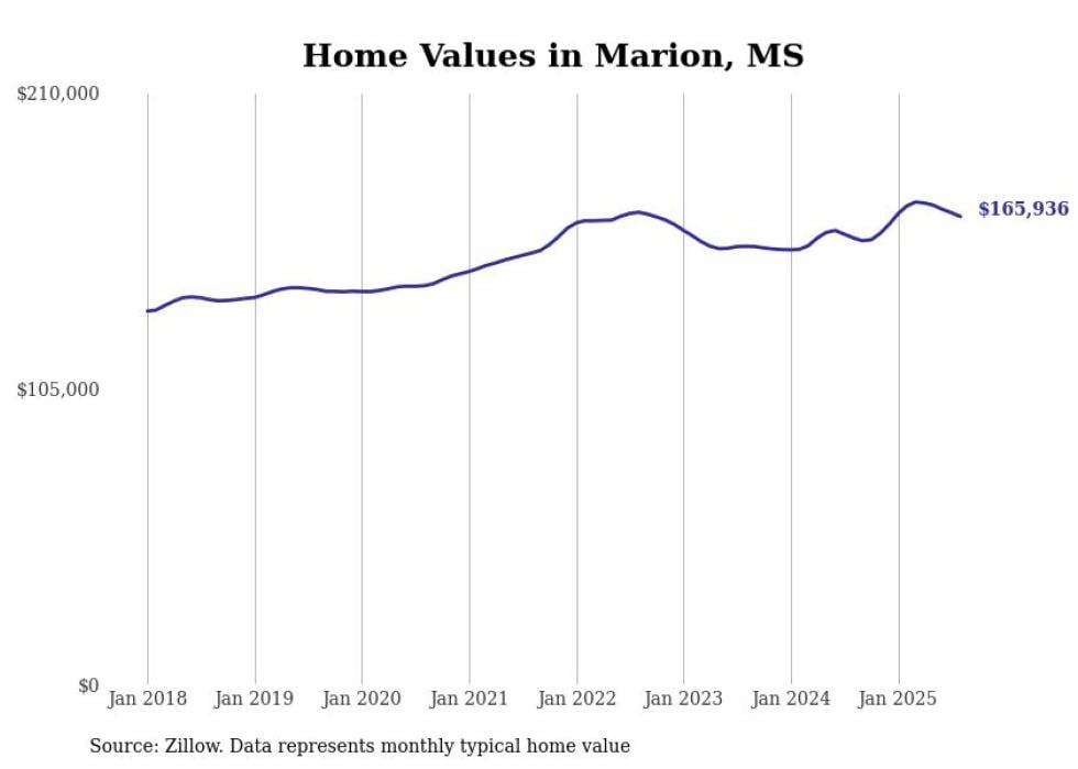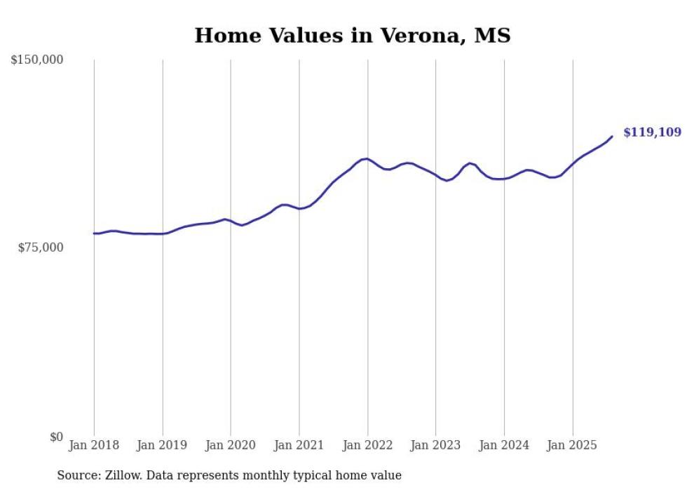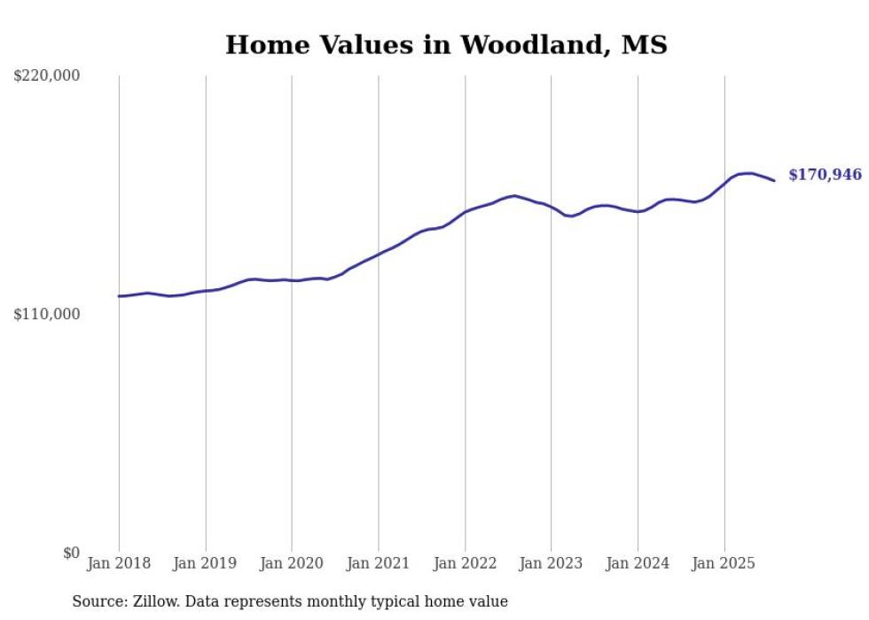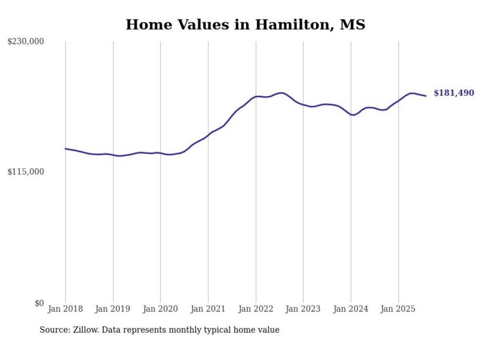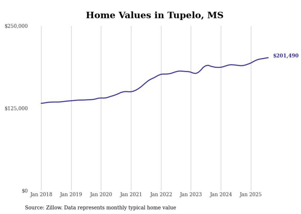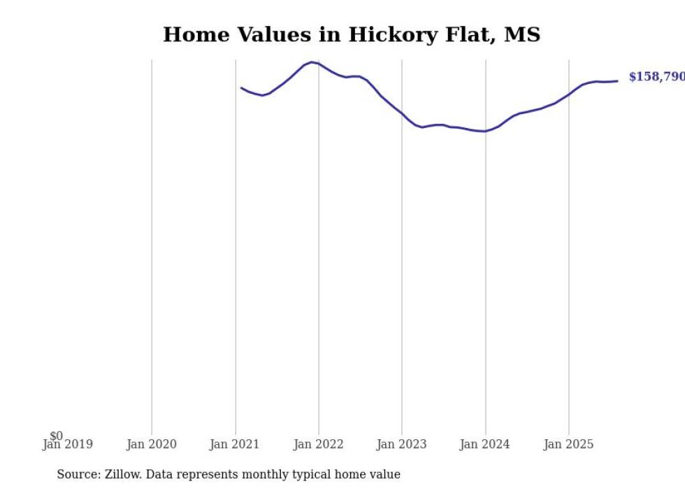 Stacker compiled a list of cities with the fastest-growing home prices in Mississippi using data from Zillow. Cities are ranked by the dollar change in the Zillow Home Values Index for all homes from the 12 months ending August 2025. The charts in this story were created automatically using Matplotlib. Data was available for 50 cities and towns in Mississippi.