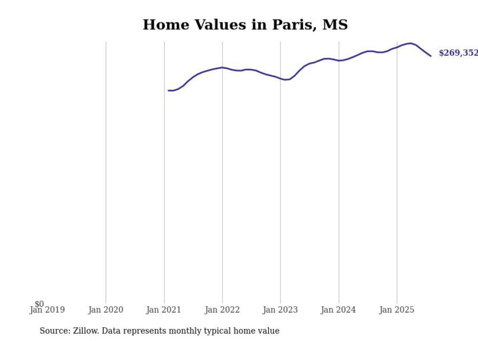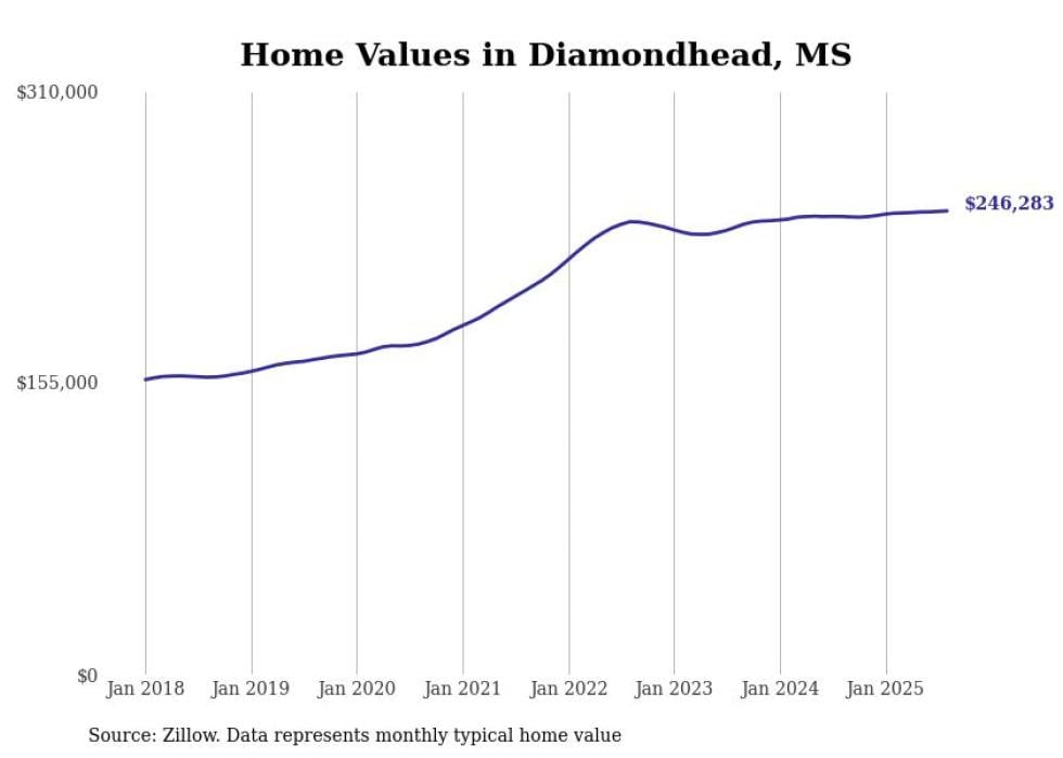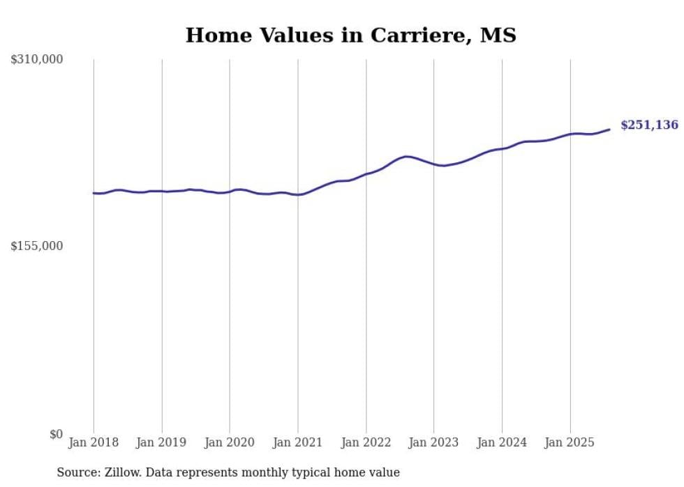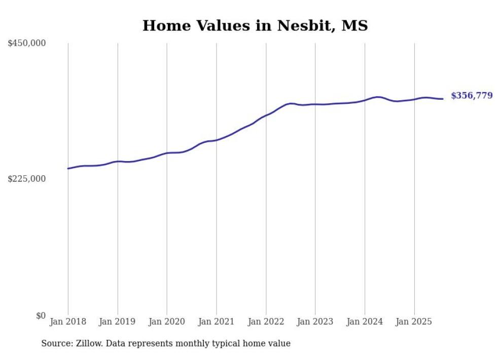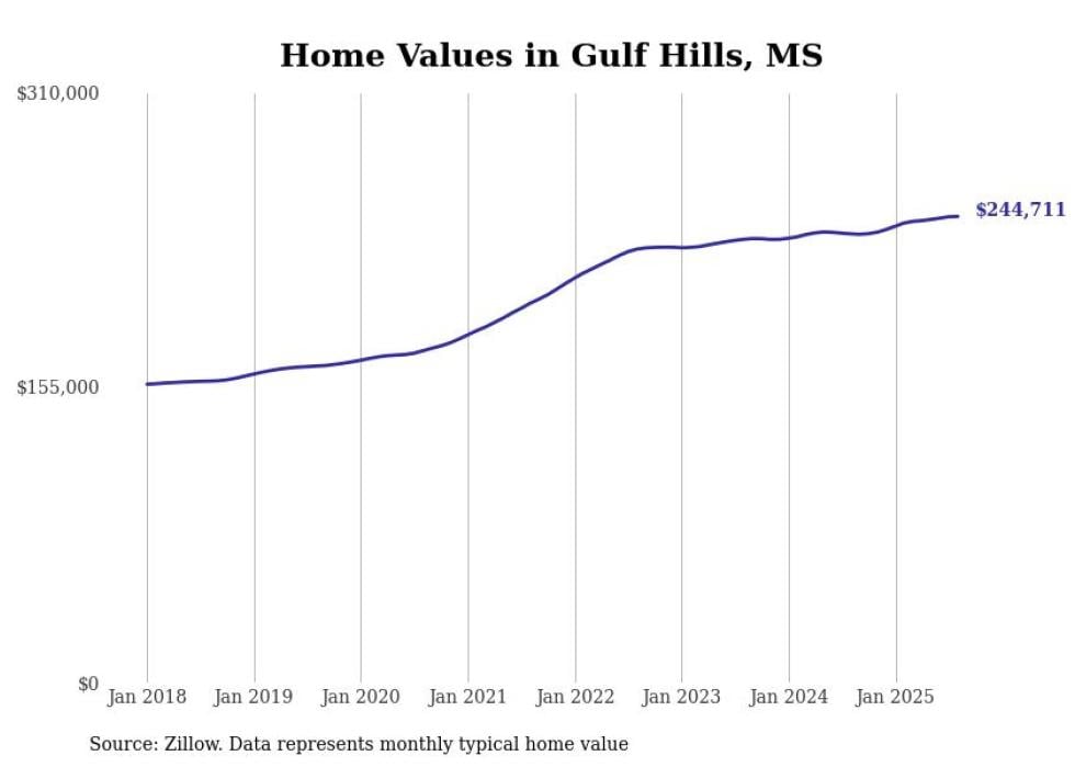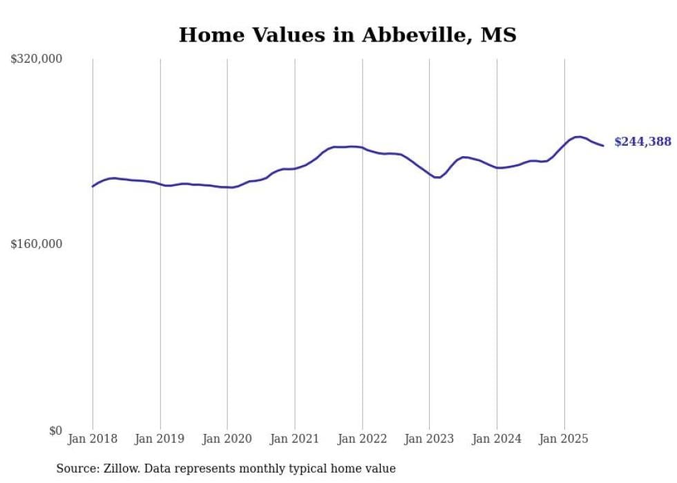 Stacker compiled a list of cities with the most expensive homes in Mississippi using data from Zillow. Cities are ranked by the Zillow Home Values Index for all homes as of August 2025. The charts in this story were created automatically using Matplotlib.