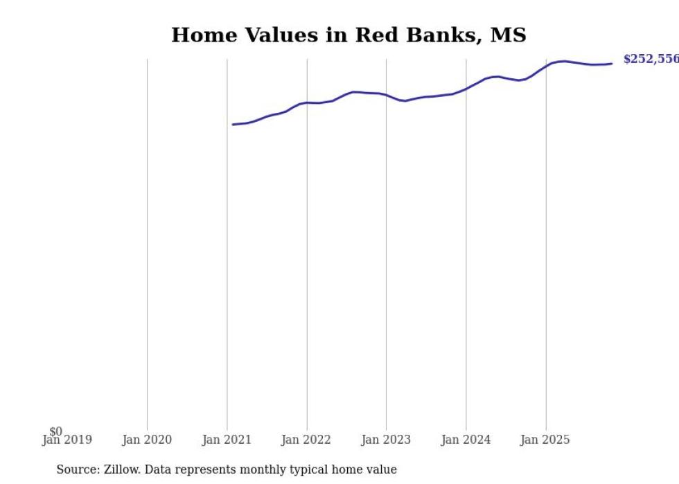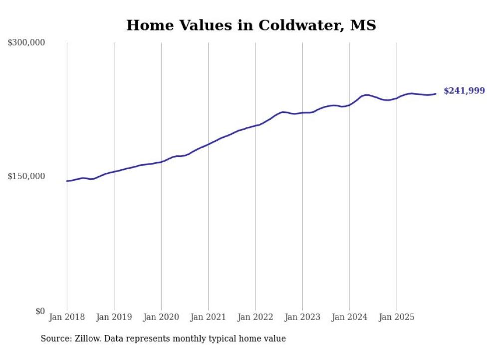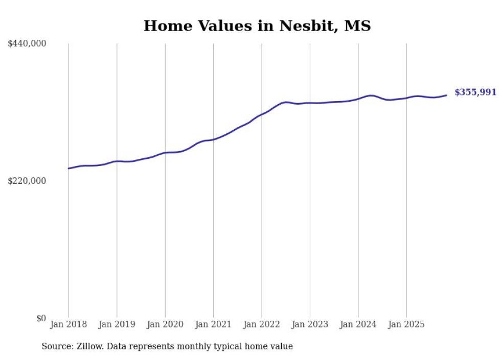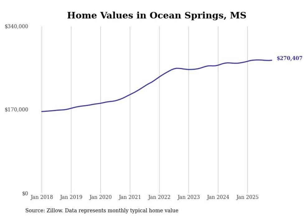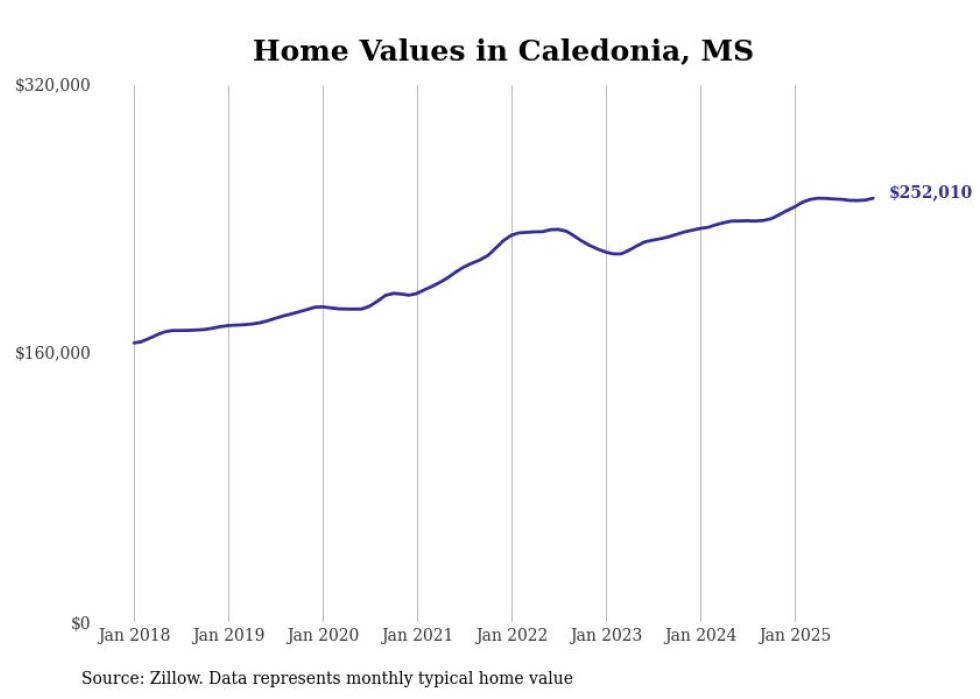 Stacker compiled a list of cities with the most expensive homes in Mississippi using data from Zillow. Cities are ranked by the Zillow Home Values Index for all homes as of November 2025. The charts in this story were created automatically using Matplotlib.