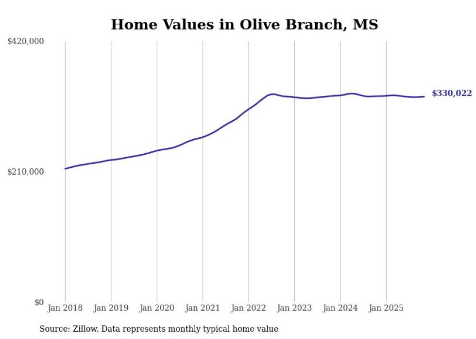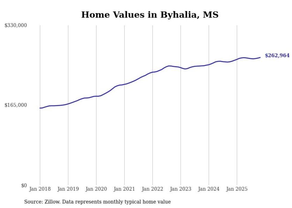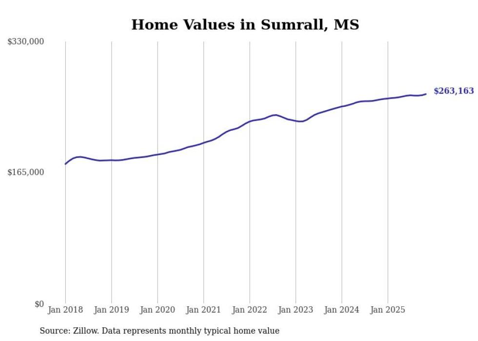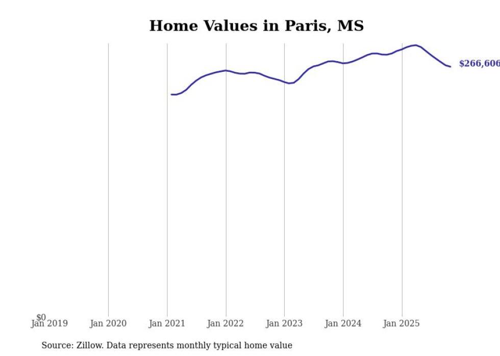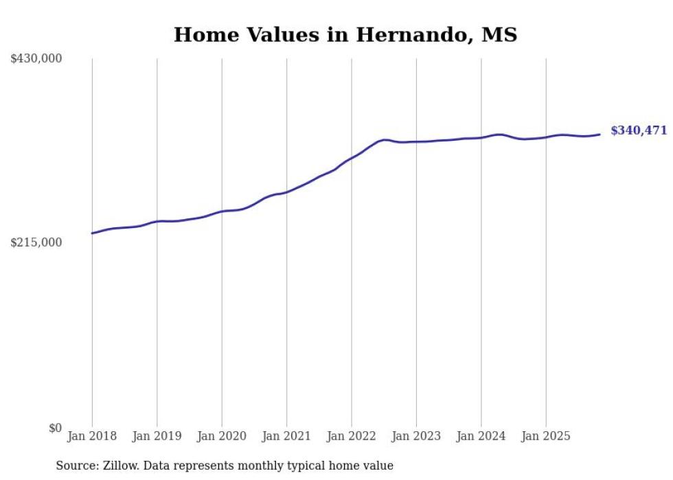 Stacker compiled a list of cities with the most expensive homes in Mississippi using data from Zillow. Cities are ranked by the Zillow Home Values Index for all homes as of November 2025. The charts in this story were created automatically using Matplotlib.