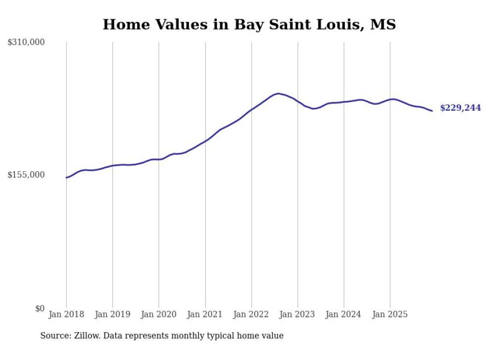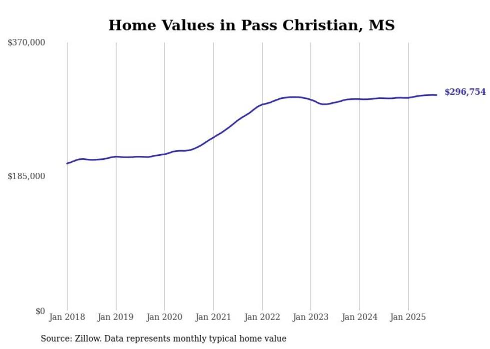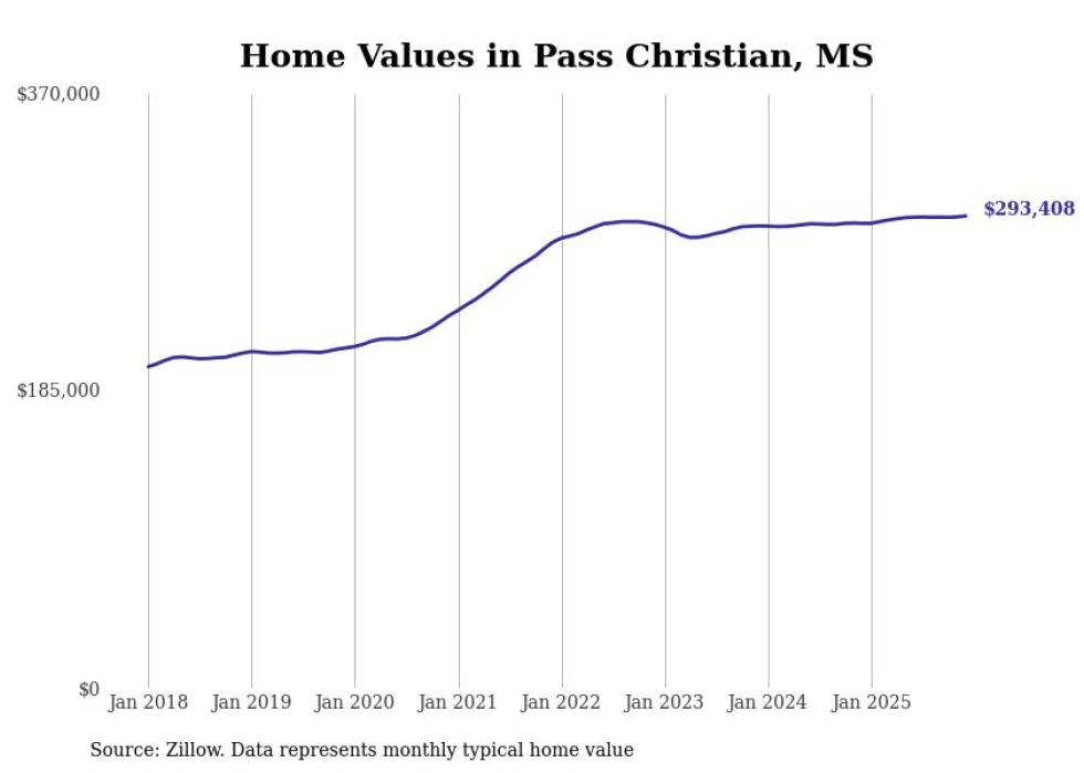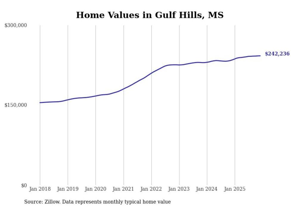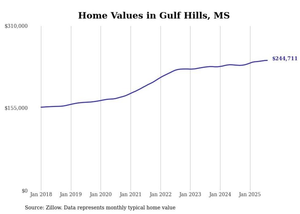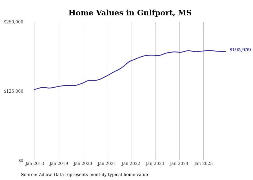 Stacker compiled a list of cities with the most expensive homes in the Gulfport metro area using data from Zillow. Charts show the monthly typical home value since January 2018. All 20 cities and towns with data available were included in the list.