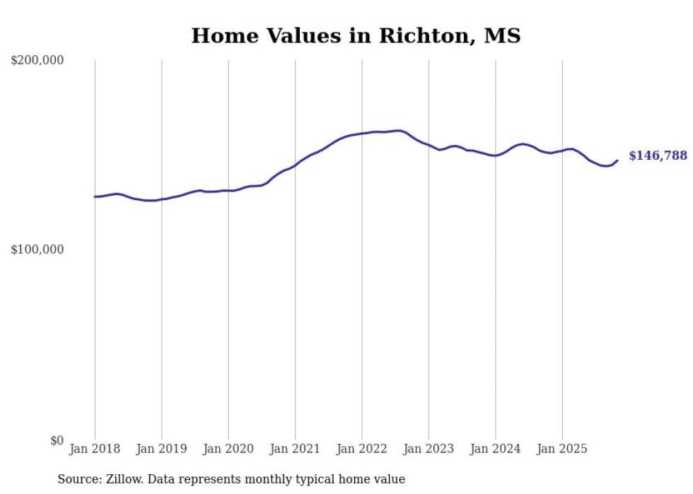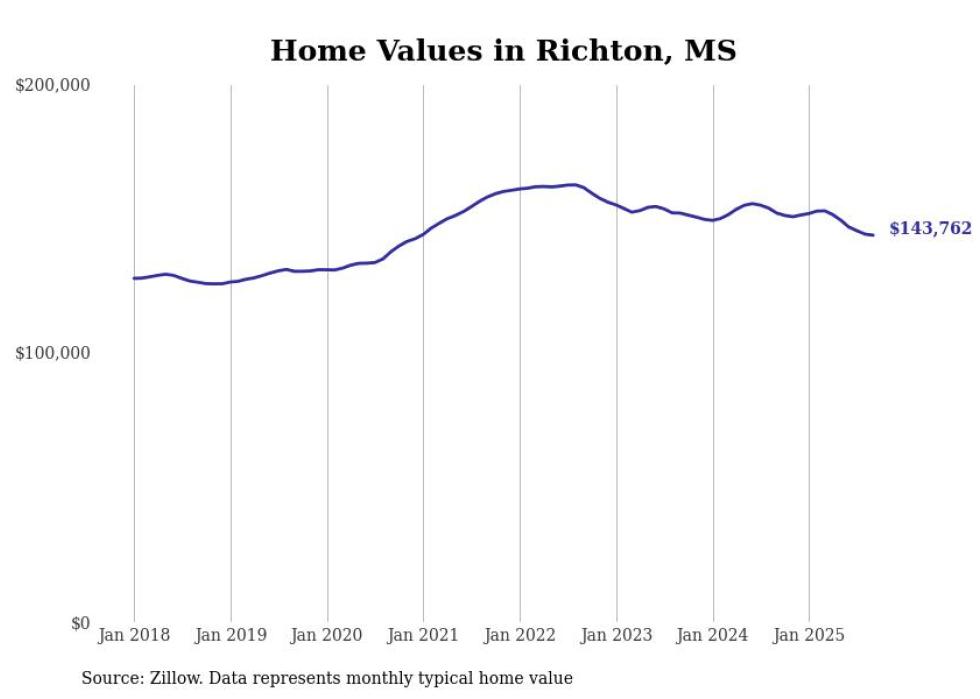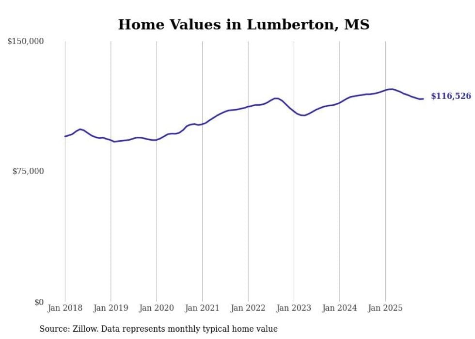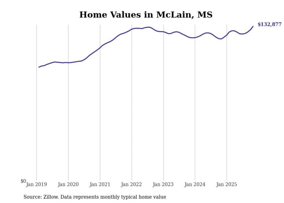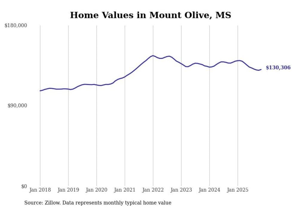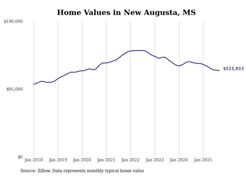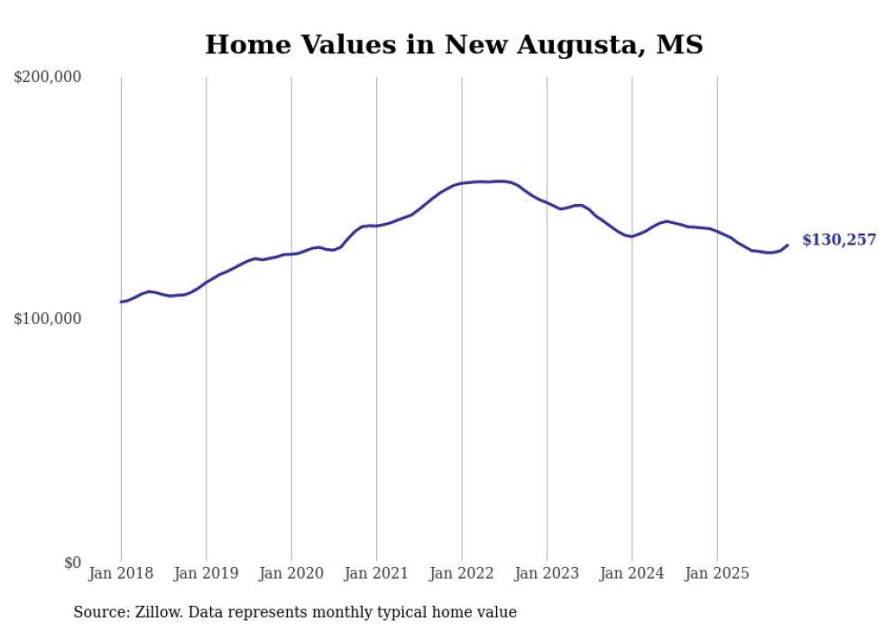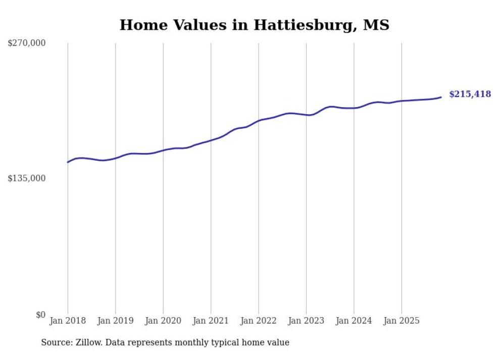 Stacker compiled a list of cities with the most expensive homes in the Hattiesburg metro area using data from Zillow. Charts show the monthly typical home value since January 2018. All 14 cities and towns with data available were included in the list.