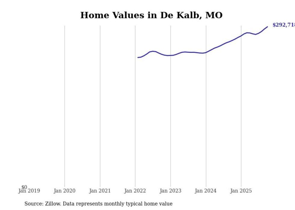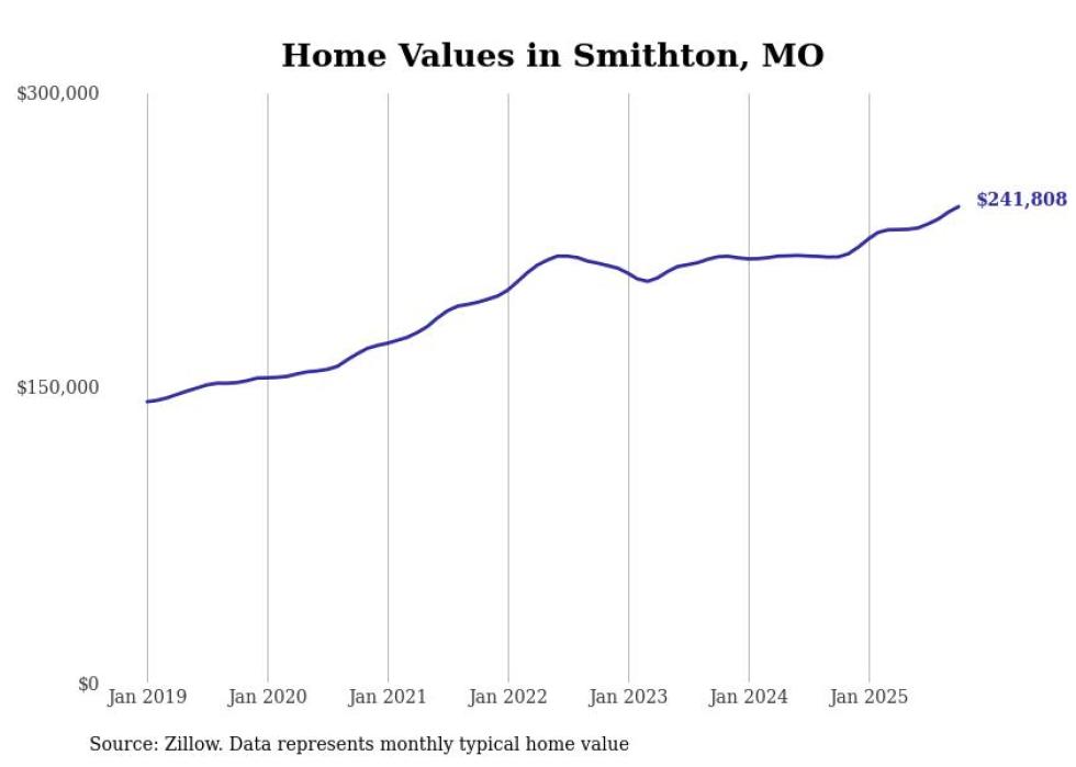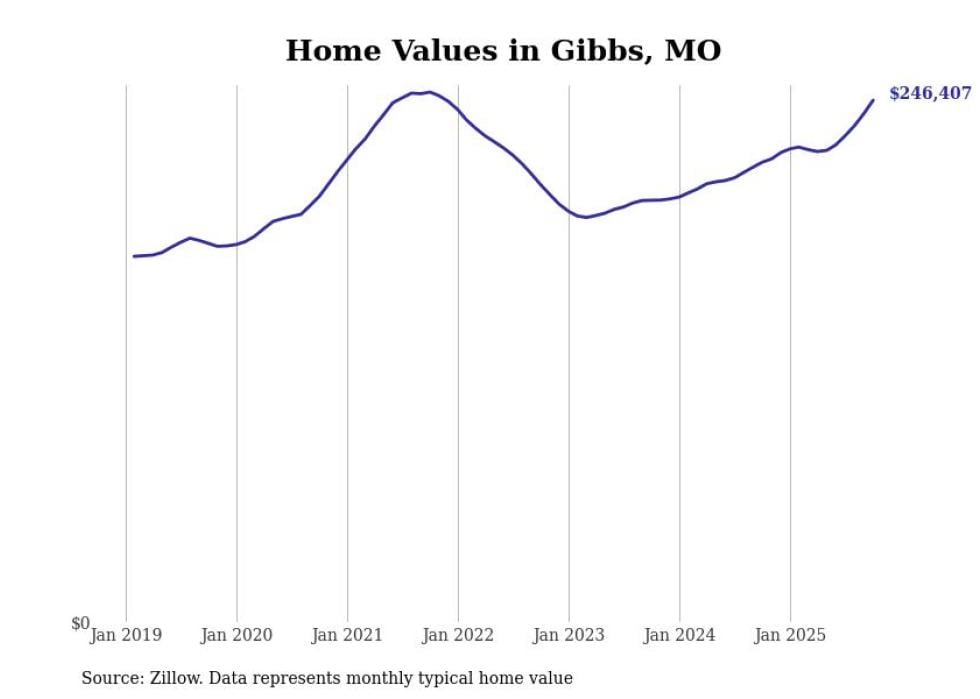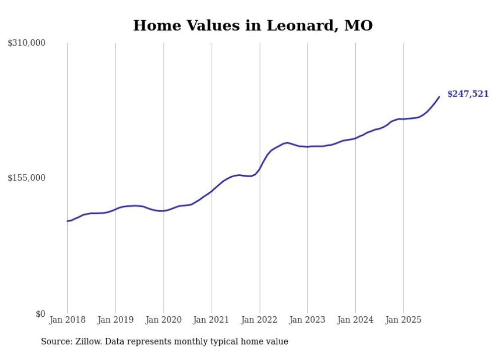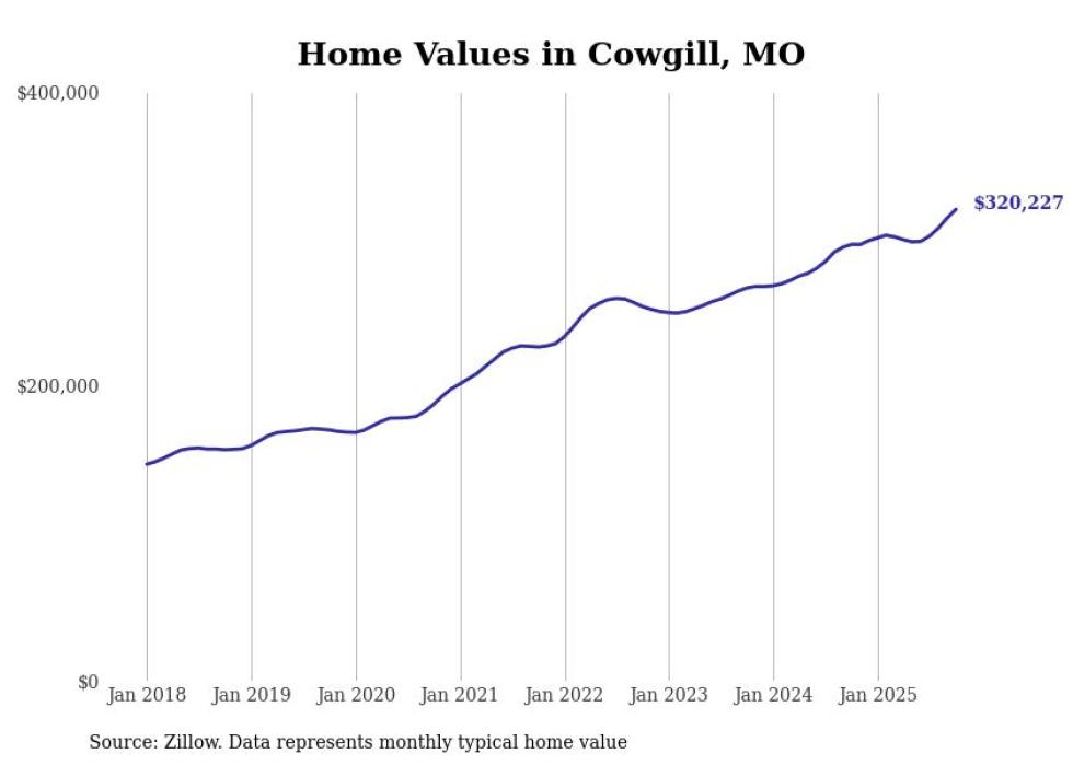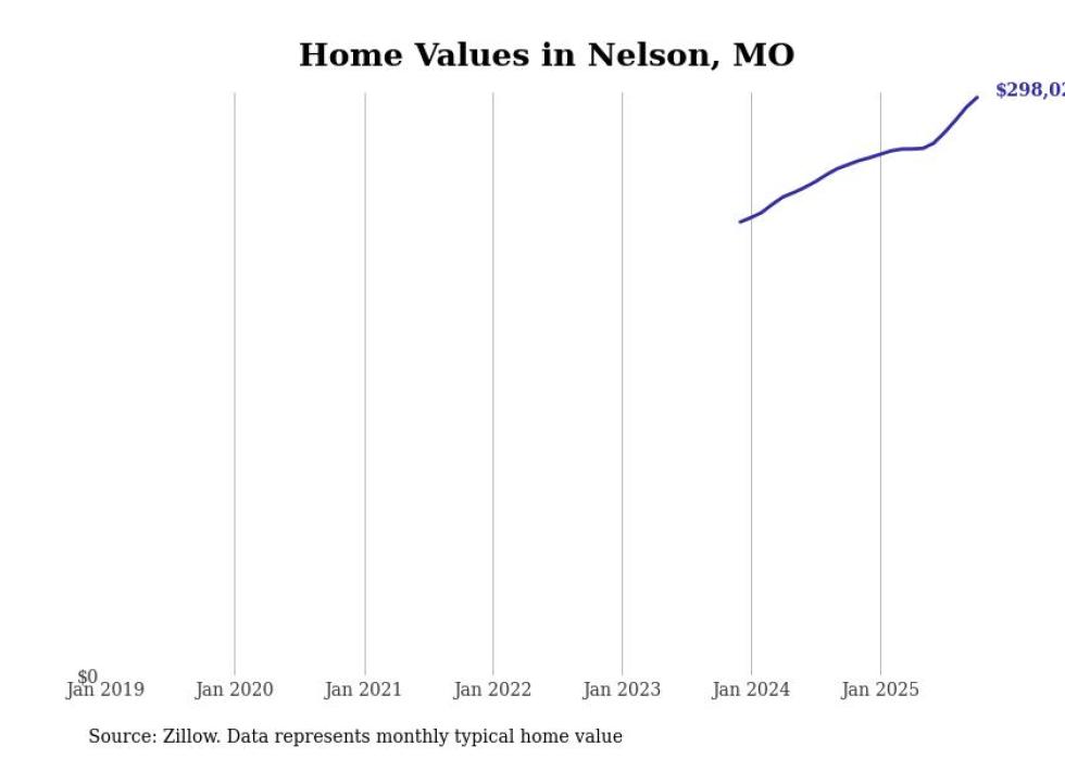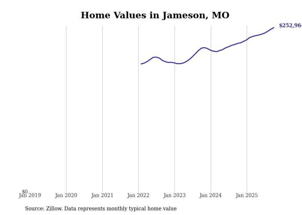Stacker compiled a list of cities with the fastest-growing home prices in Missouri using data from Zillow. Cities are ranked by the dollar change in the Zillow Home Values Index for all homes from the 12 months ending October 2025. The charts in this story were created automatically using Matplotlib. Data was available for 50 cities and towns in Missouri.