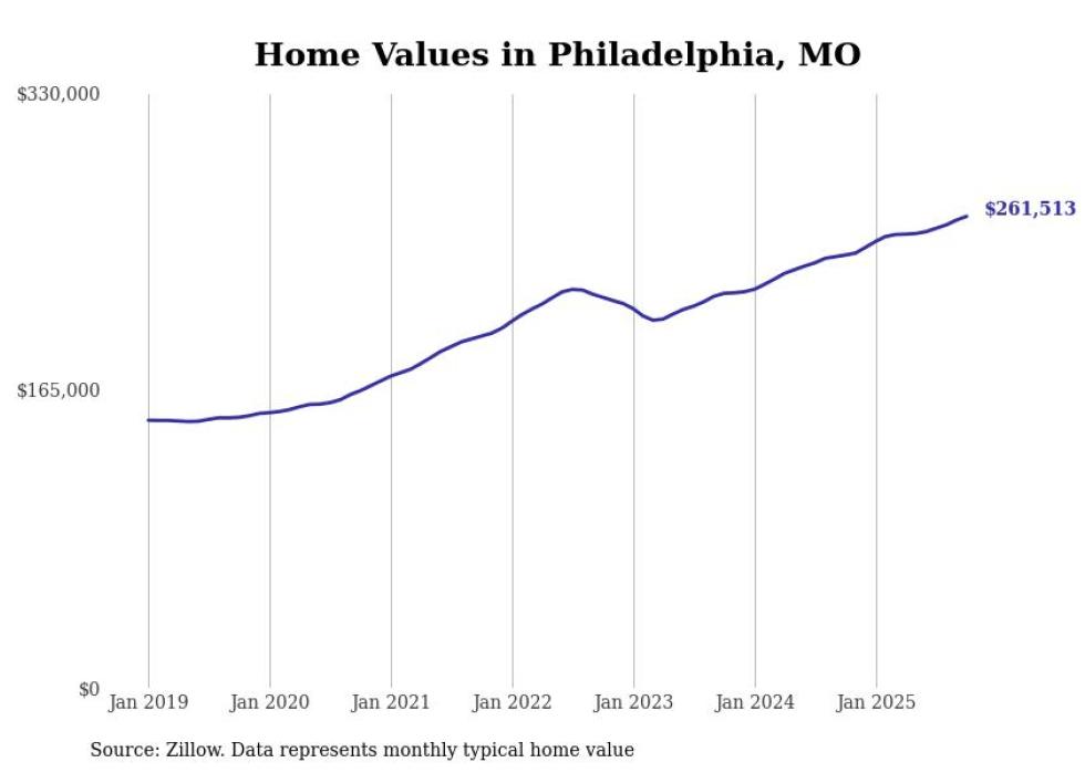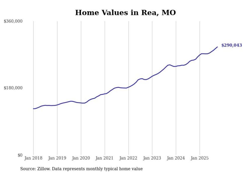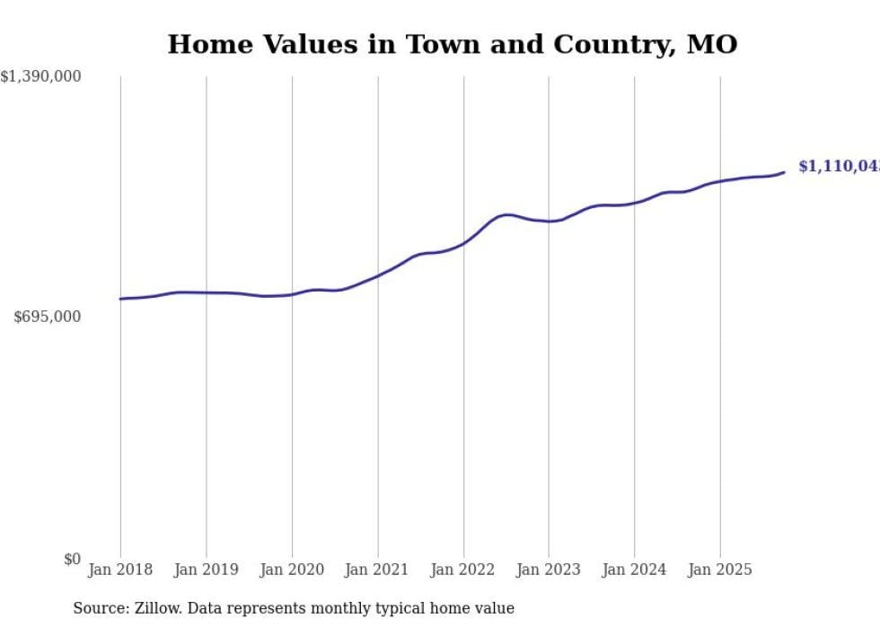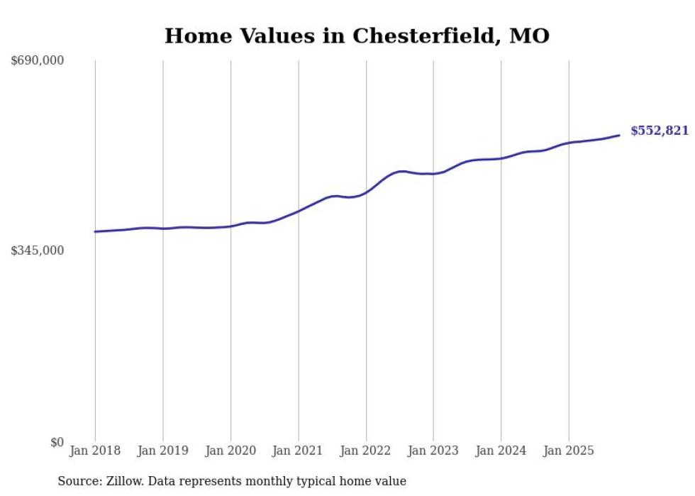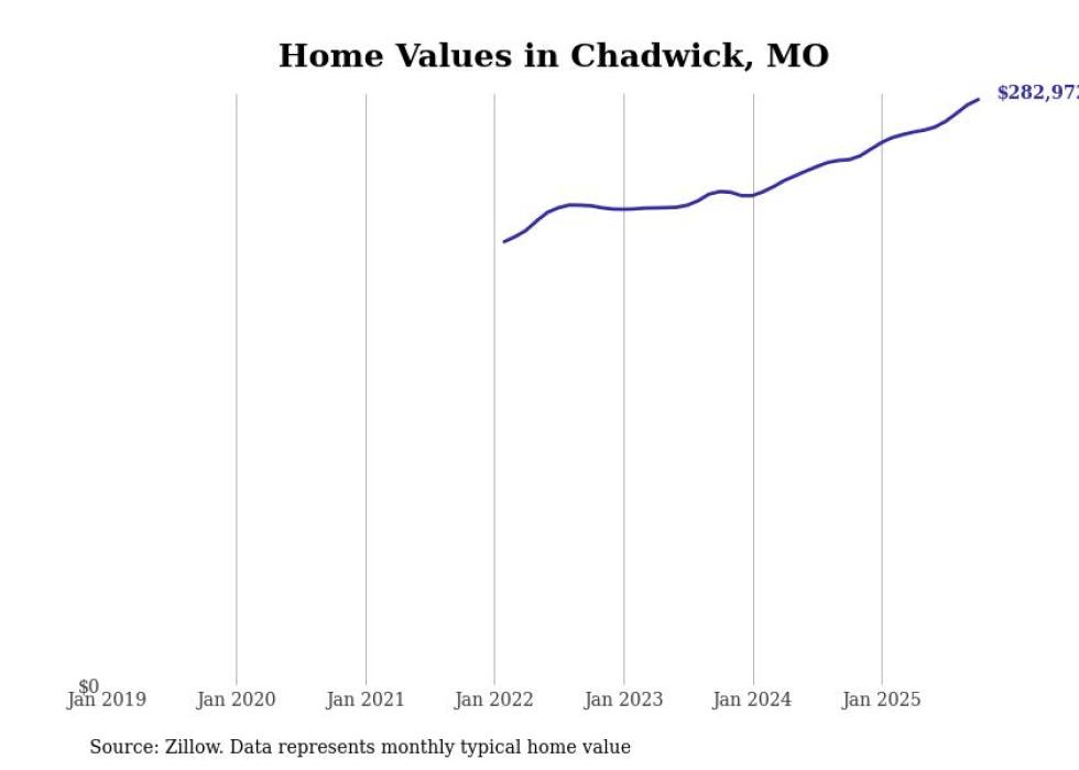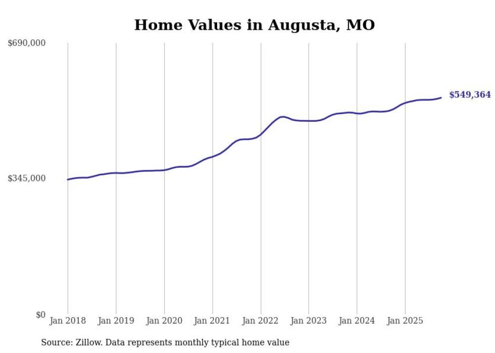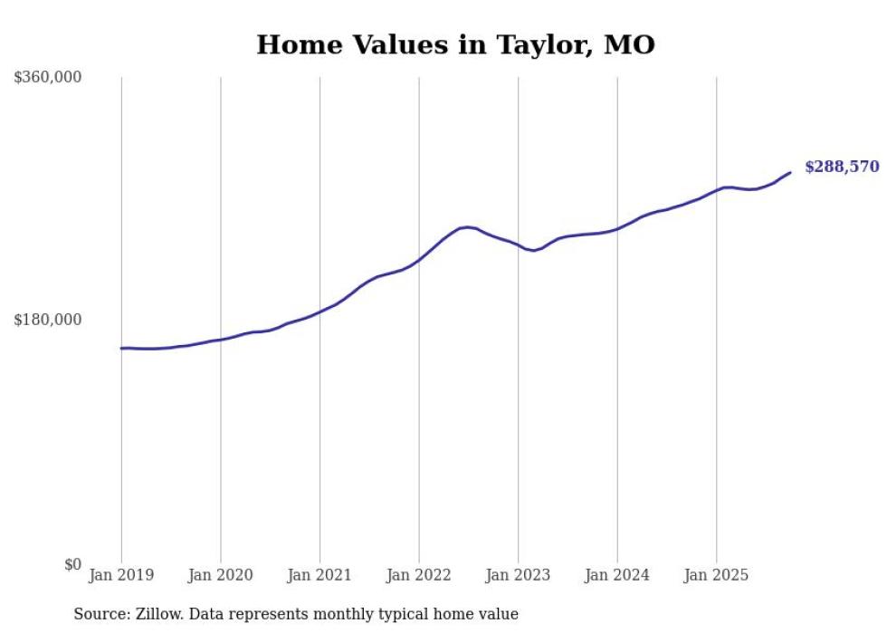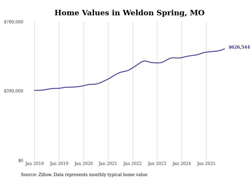 Stacker compiled a list of cities with the fastest-growing home prices in Missouri using data from Zillow. Cities are ranked by the dollar change in the Zillow Home Values Index for all homes from the 12 months ending October 2025. The charts in this story were created automatically using Matplotlib. Data was available for 50 cities and towns in Missouri.