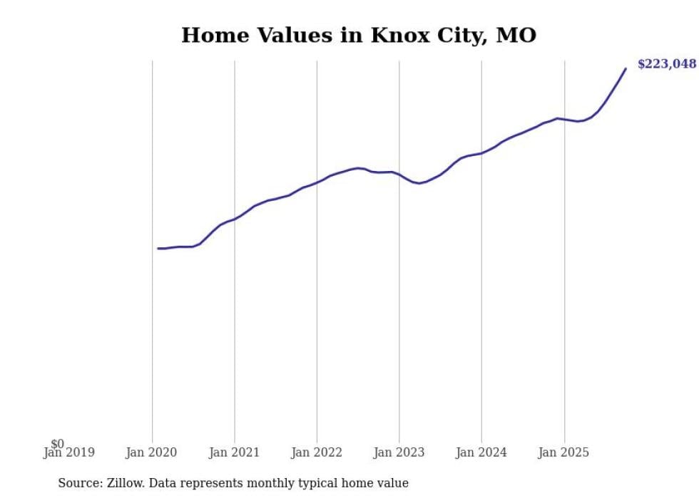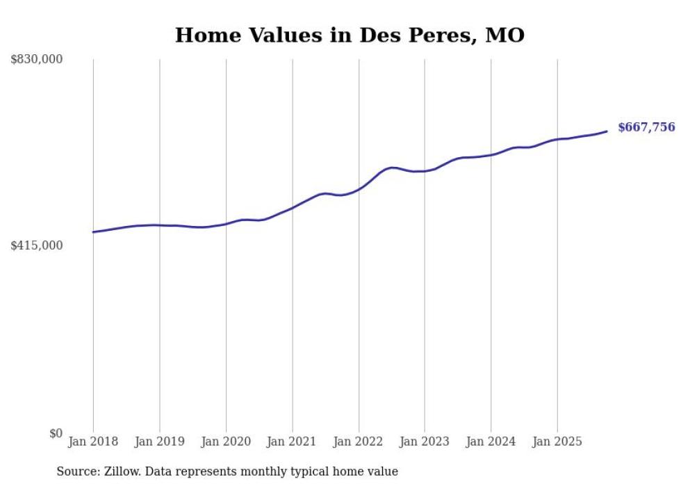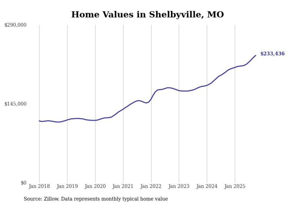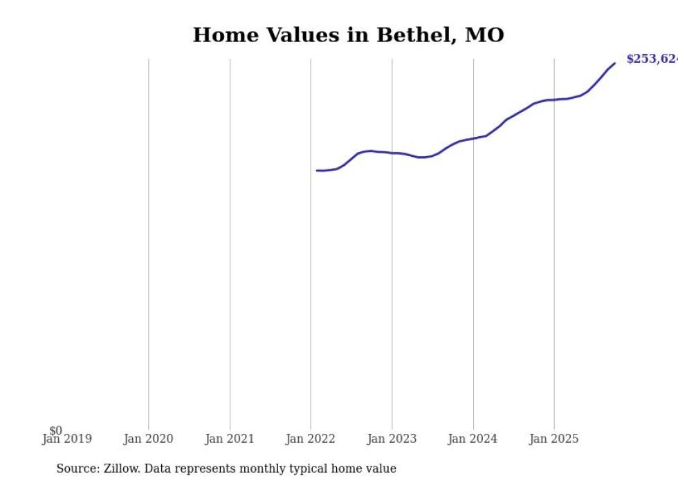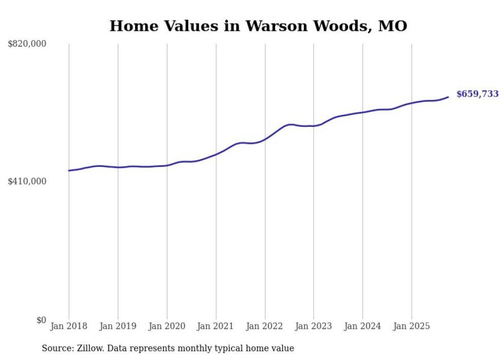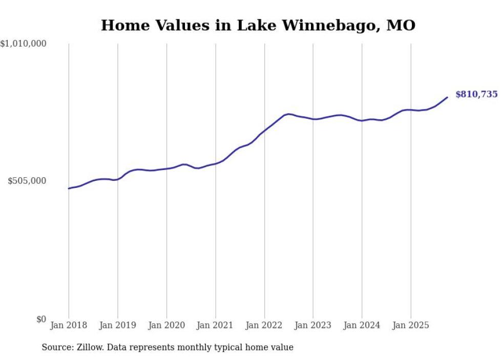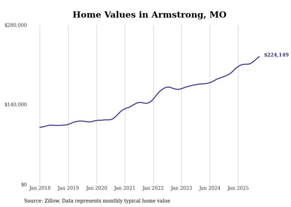 Stacker compiled a list of cities with the fastest-growing home prices in Missouri using data from Zillow. Cities are ranked by the dollar change in the Zillow Home Values Index for all homes from the 12 months ending October 2025. The charts in this story were created automatically using Matplotlib. Data was available for 50 cities and towns in Missouri.